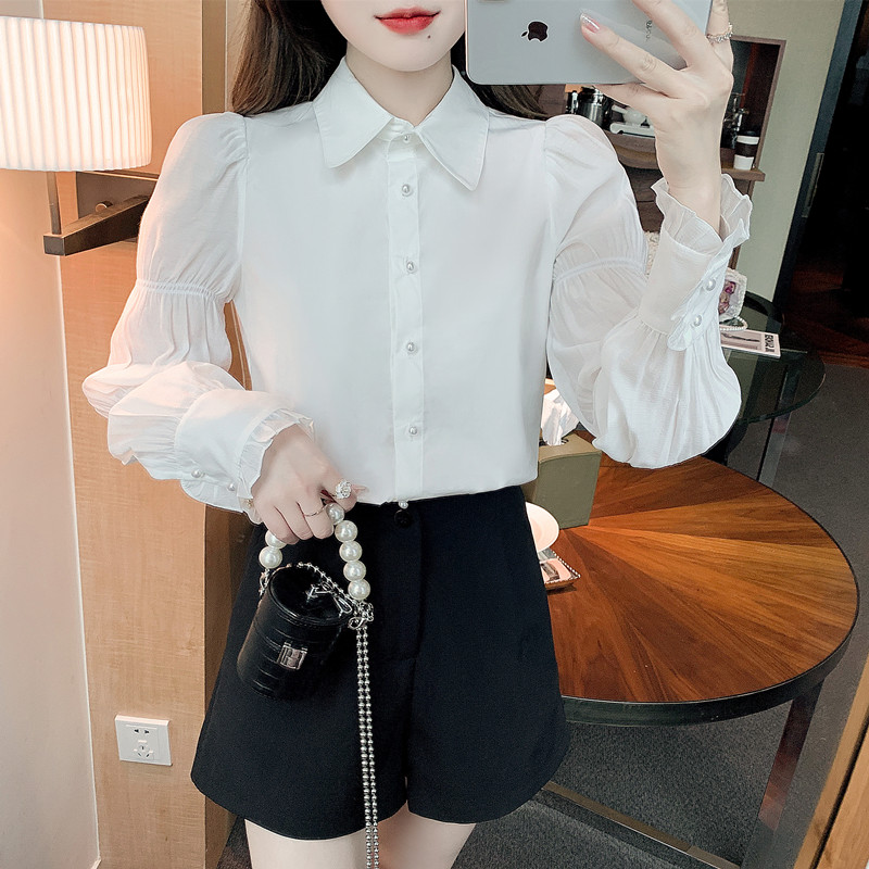 FA46919# 法式小众长袖纯色衬衫女秋季新款设计感珍珠领泡泡袖雪纺衫 服裝批發女裝批發服飾貨源