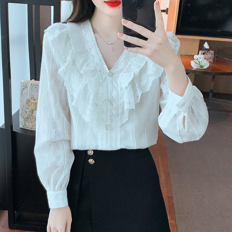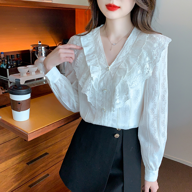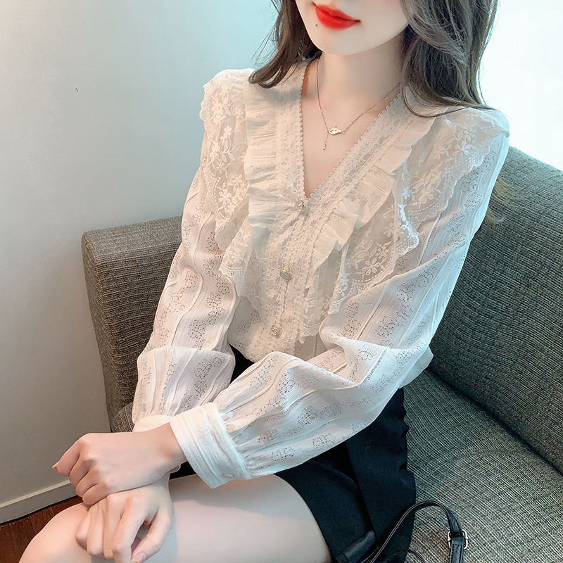 FA46921# 法式蕾丝花边v领衬衫女秋季新款韩版气质设计感蕾丝衫上衣 服裝批發女裝批發服飾貨源
