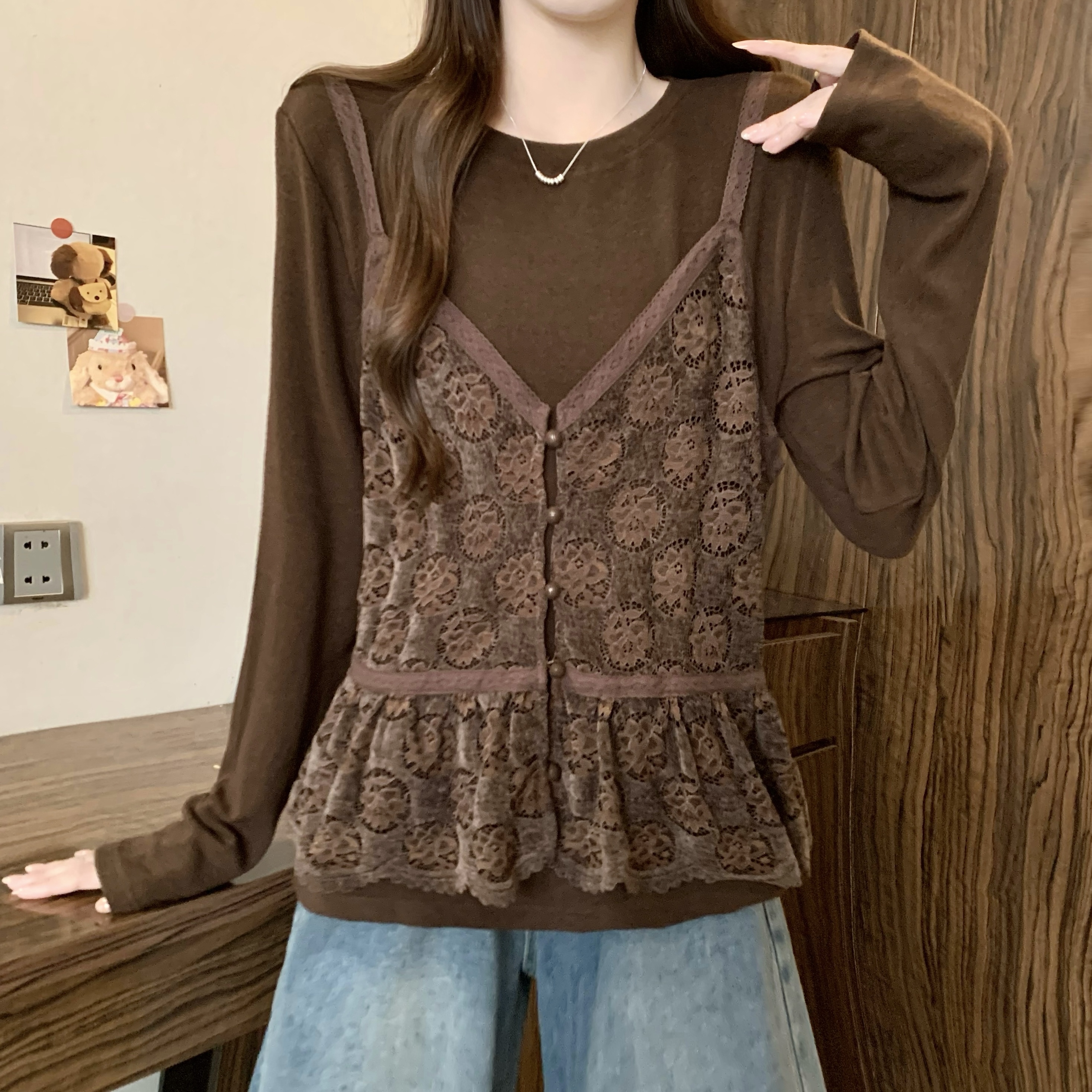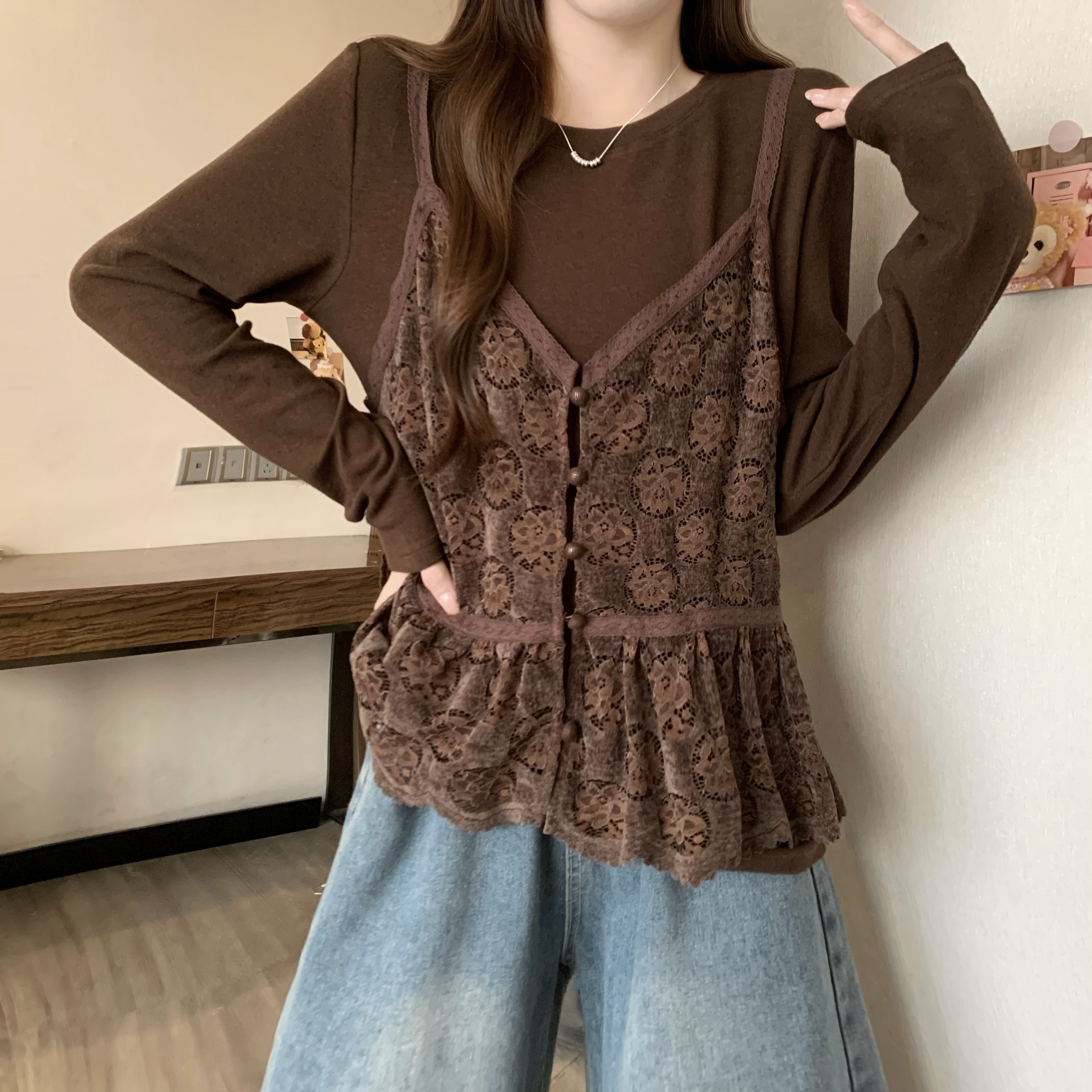 FA46945# MM秋冬新款时尚百搭宽松显瘦弹力针织拼接蕾丝长袖假两件上衣女 服裝批發女裝批發服飾貨源