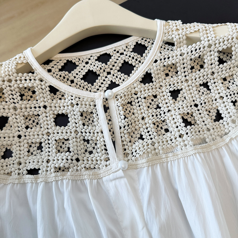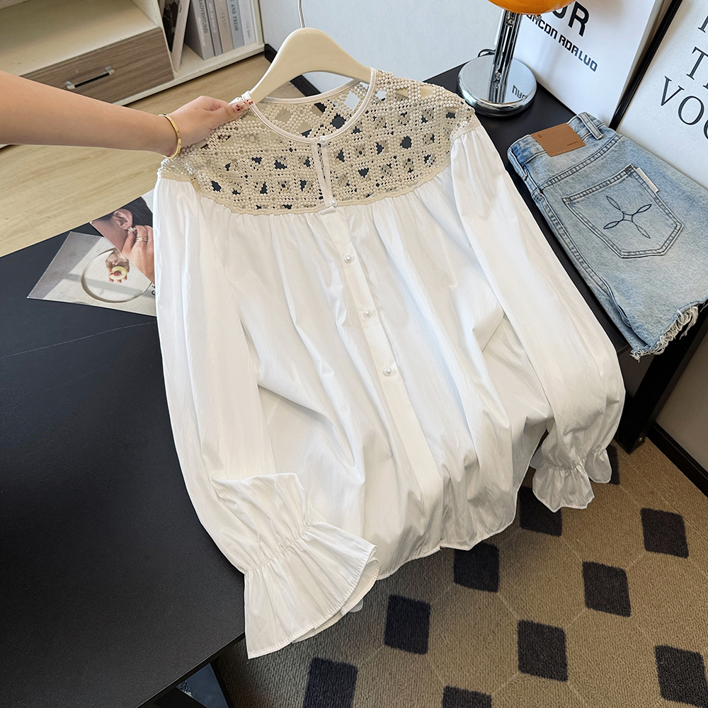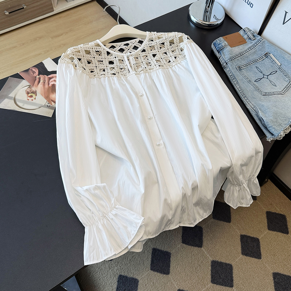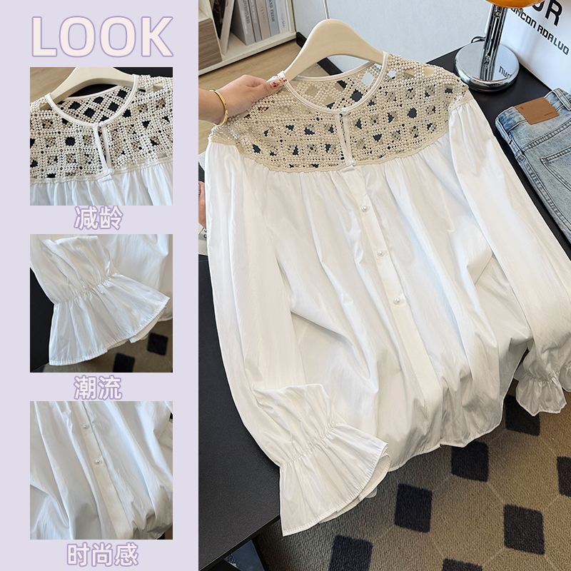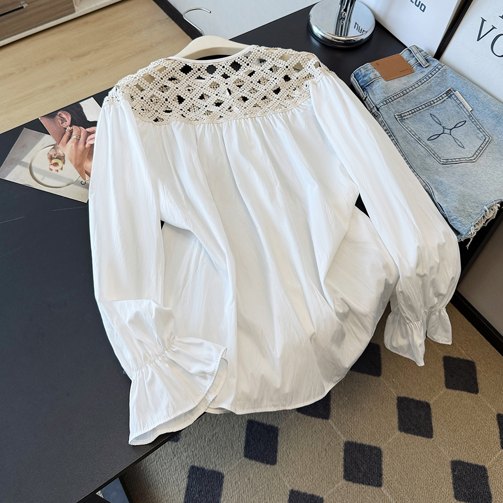 FA46963# 法式镂空拼接长袖衬衫女秋季新款超宽松百搭休闲上衣 服裝批發女裝批發服飾貨源
