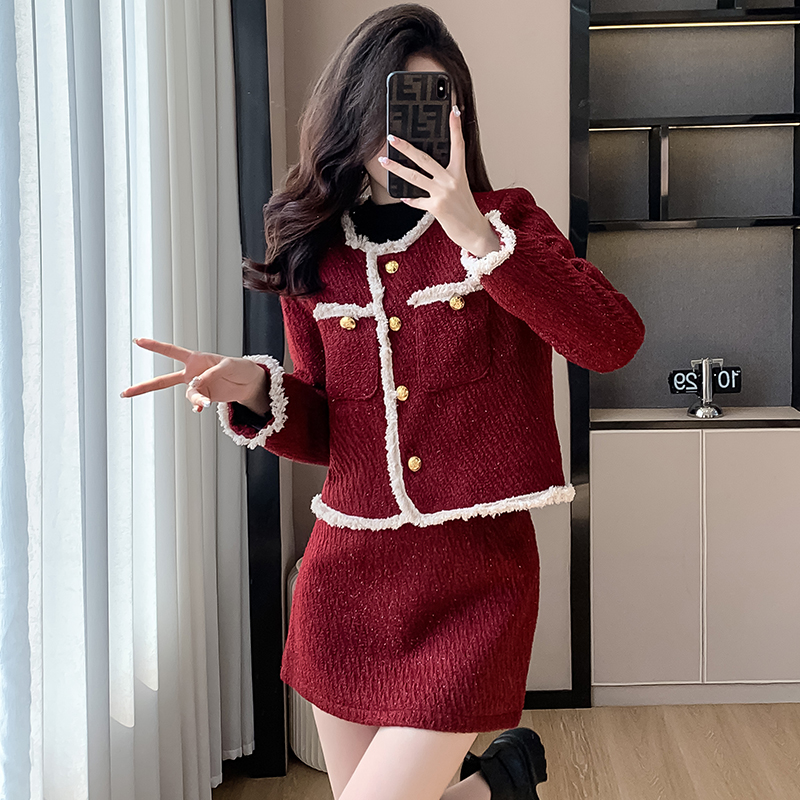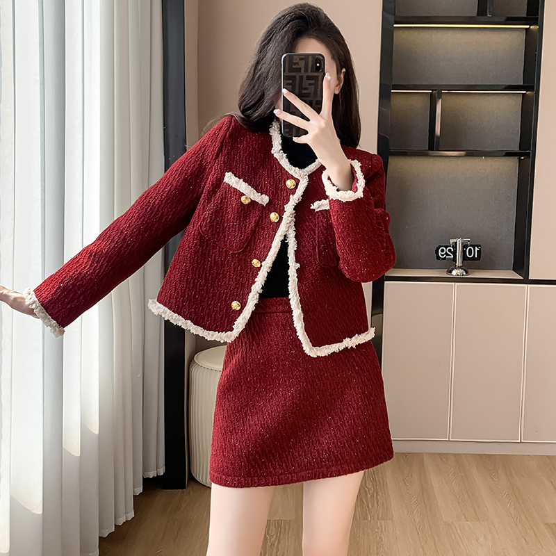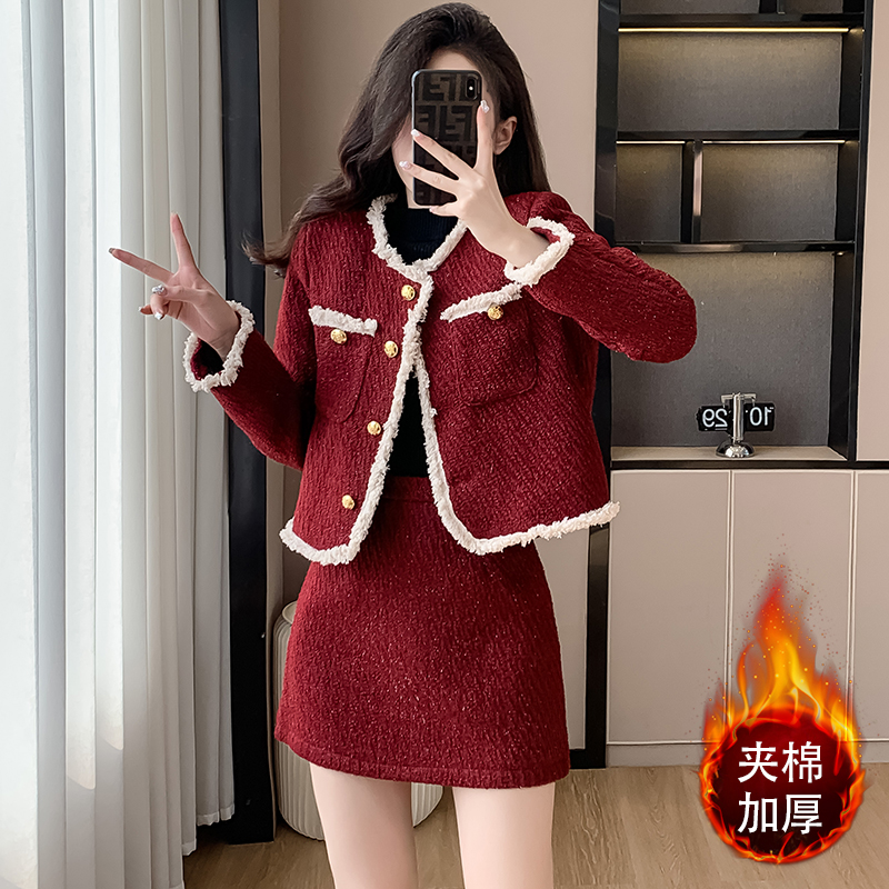 FA46969# 过年红色套装法式洋气撞色流苏边细闪小香风外套冬季夹棉两件套女 服裝批發女裝批發服飾貨源