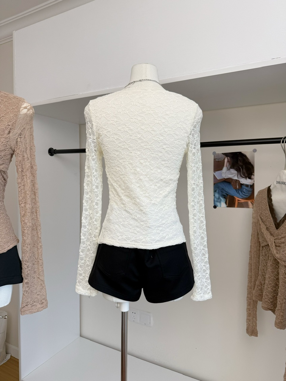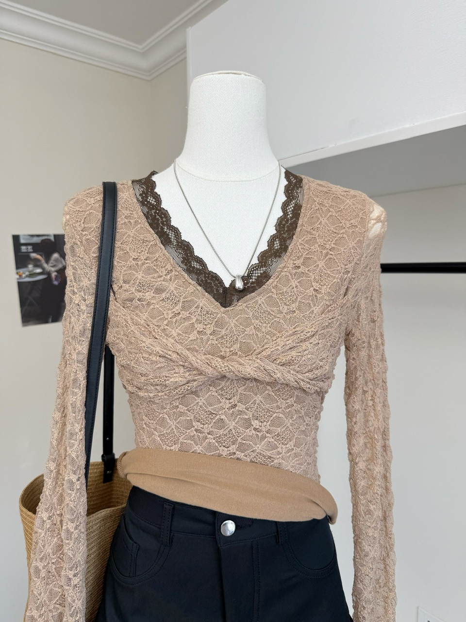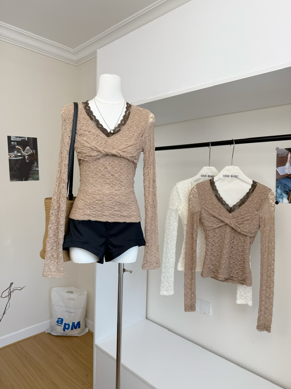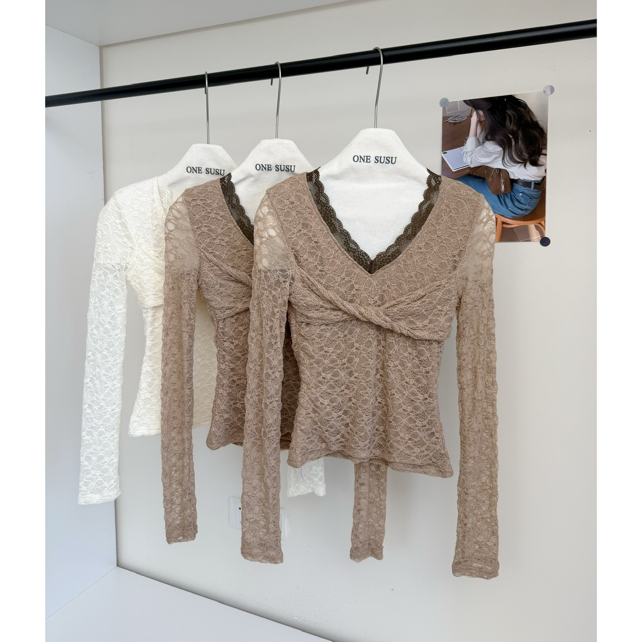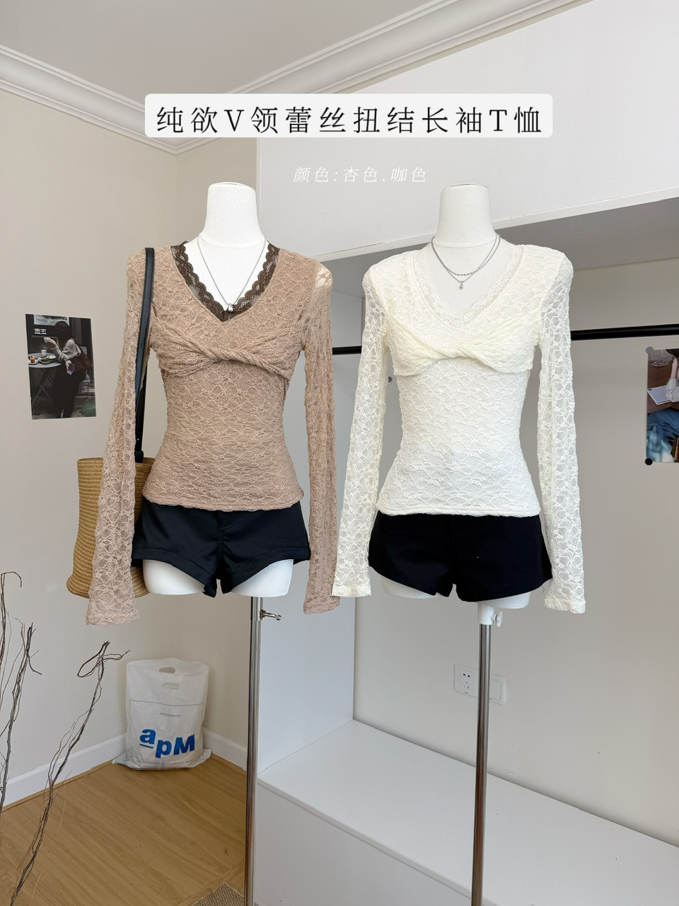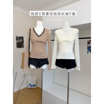 FA46983# 白水女美美蕾丝打底V领蕾丝扭结T恤女秋冬韩系温柔纯欲长袖上衣 服裝批發女裝批發服飾貨源