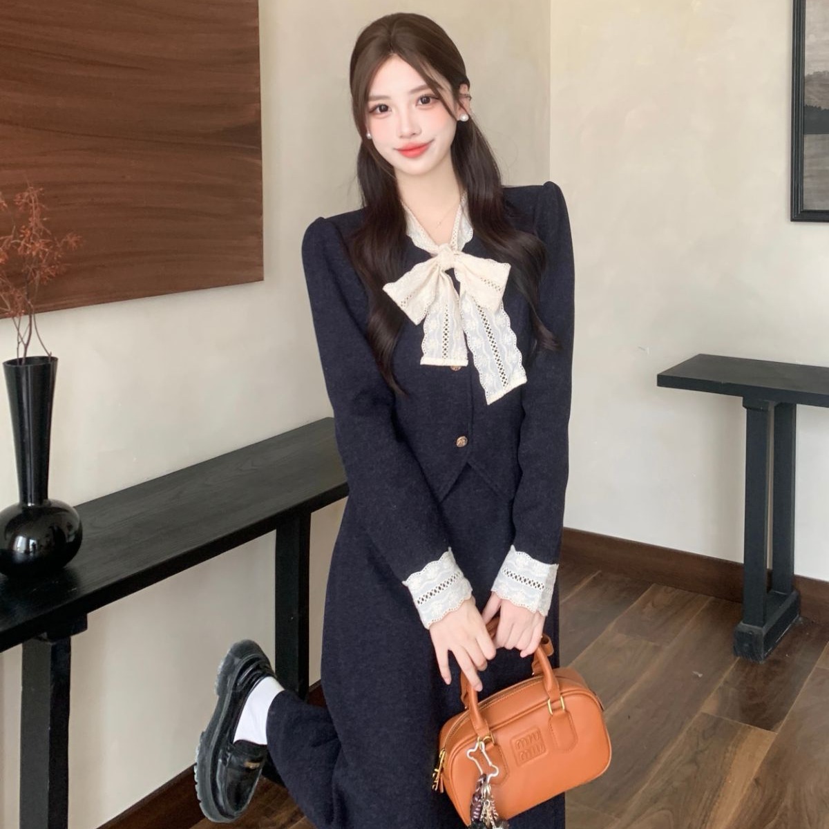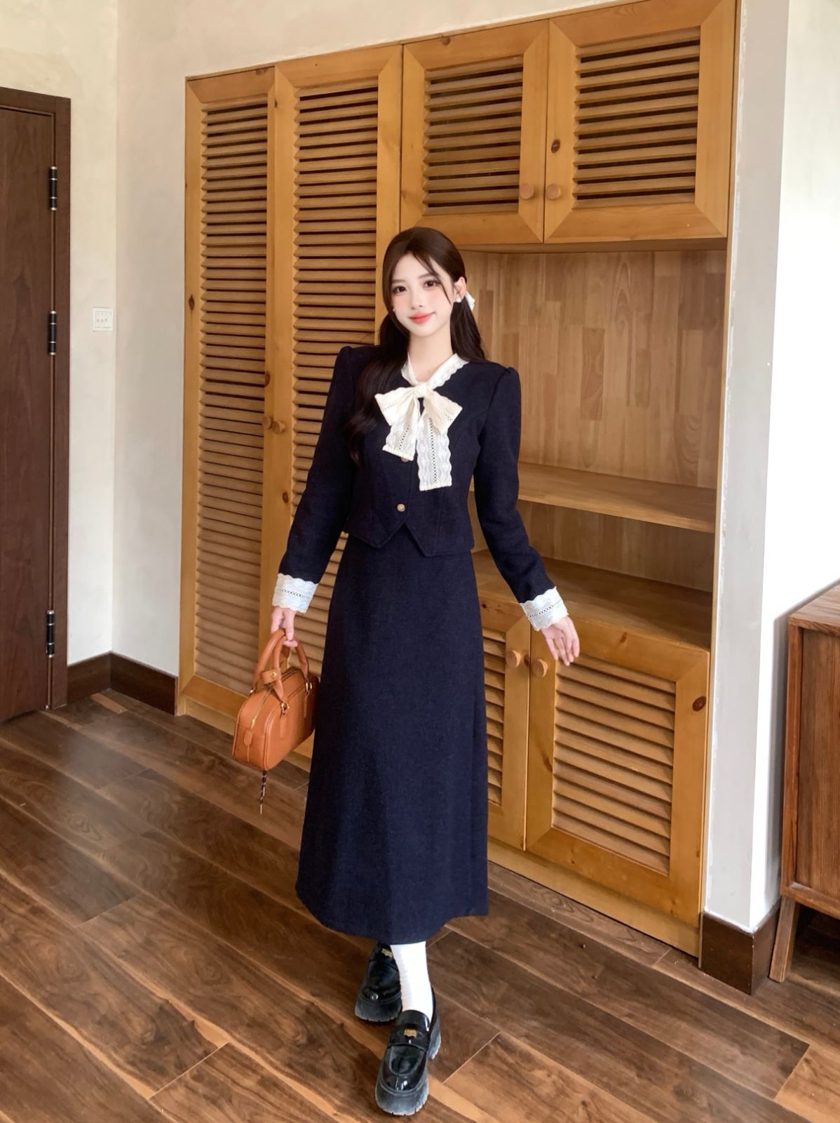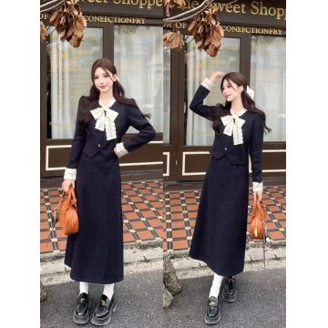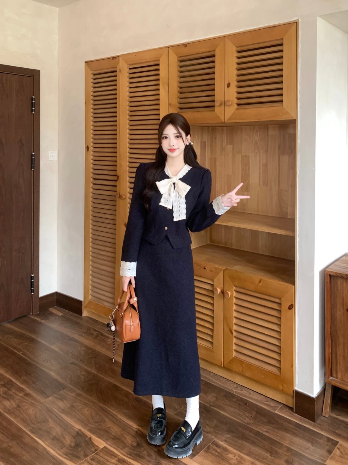 FA47156# 秋冬法式高端精致大码显瘦时尚气质蝴蝶结系带上衣半裙套装 服裝批發女裝批發服飾貨源