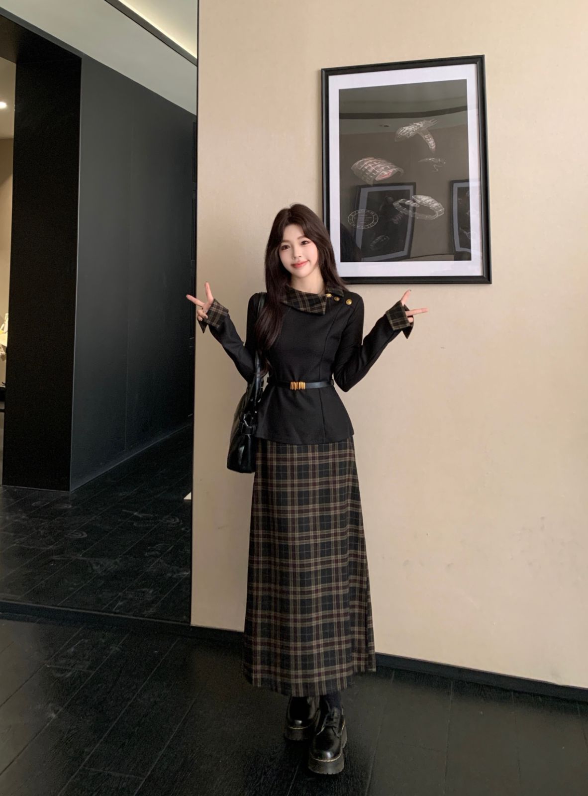 FA47157# 大码新款秋冬打底法式气质显瘦格子拼接两件套套装送腰带 服裝批發女裝批發服飾貨源