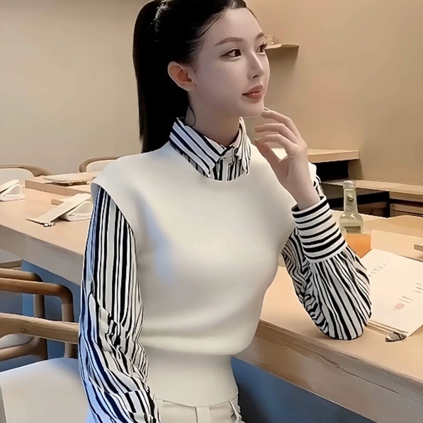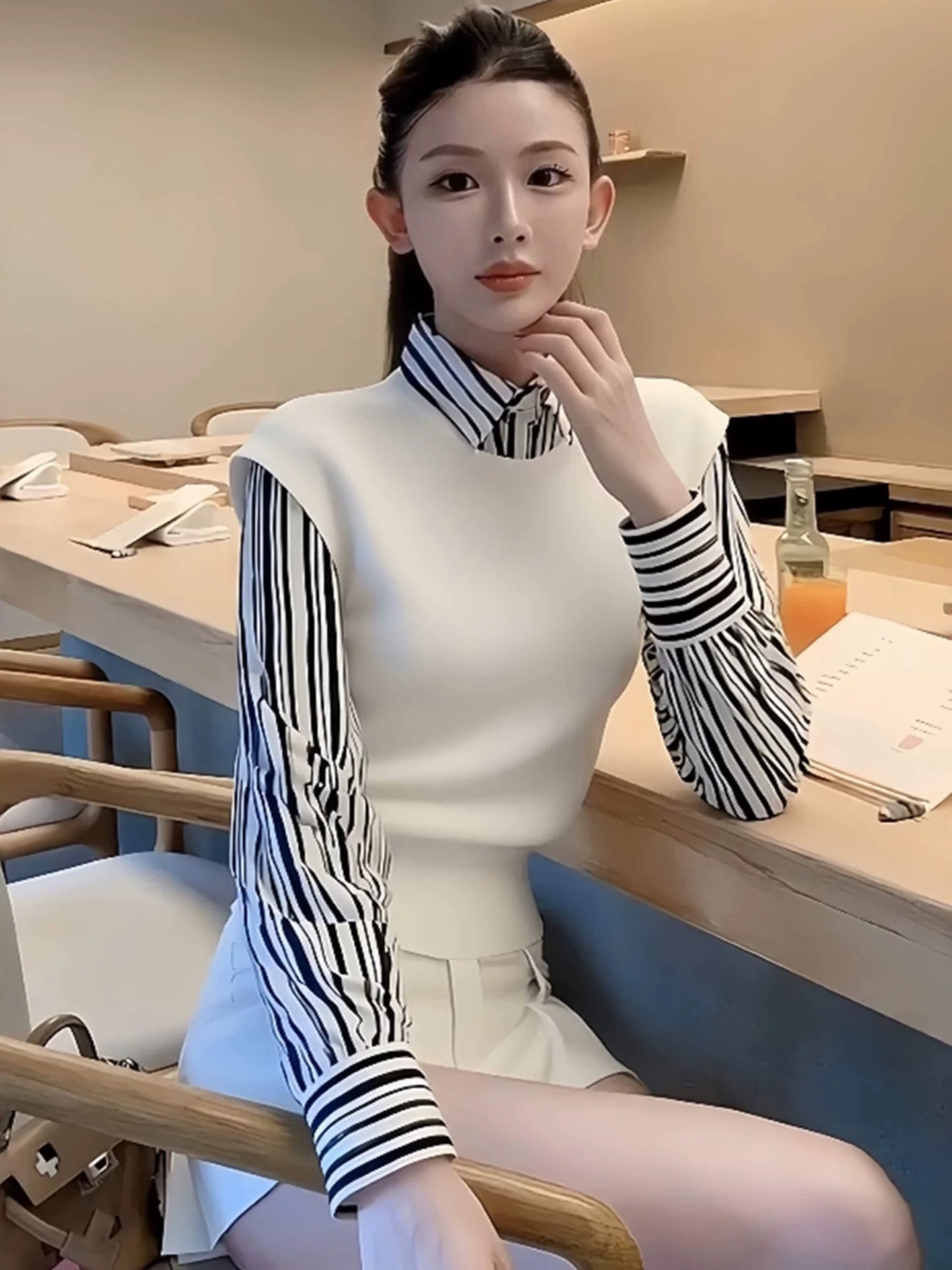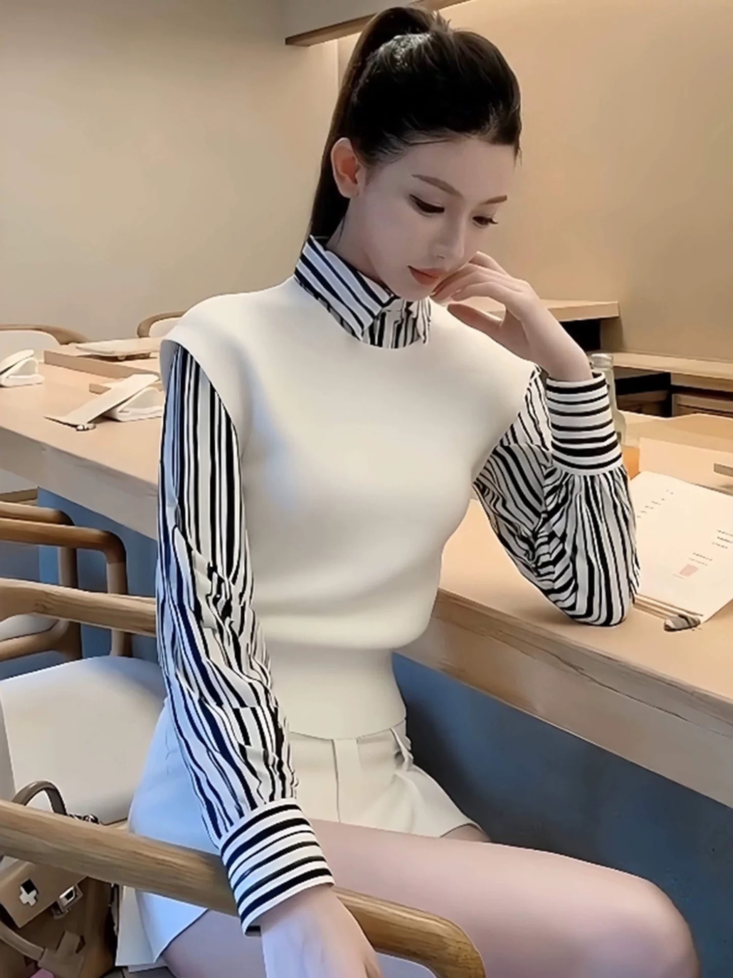 FA47162# 白色翻领针织衫叠穿马甲女新款巨好看早秋季穿搭韩系漂亮上衣 服裝批發女裝批發服飾貨源