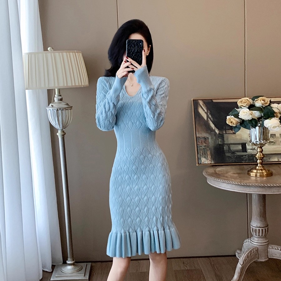FA47233# 温柔小香风秋冬季甜美气质镂空针织连衣裙鱼尾包臀毛衣裙女打底裙 服裝批發女裝批發服飾貨源