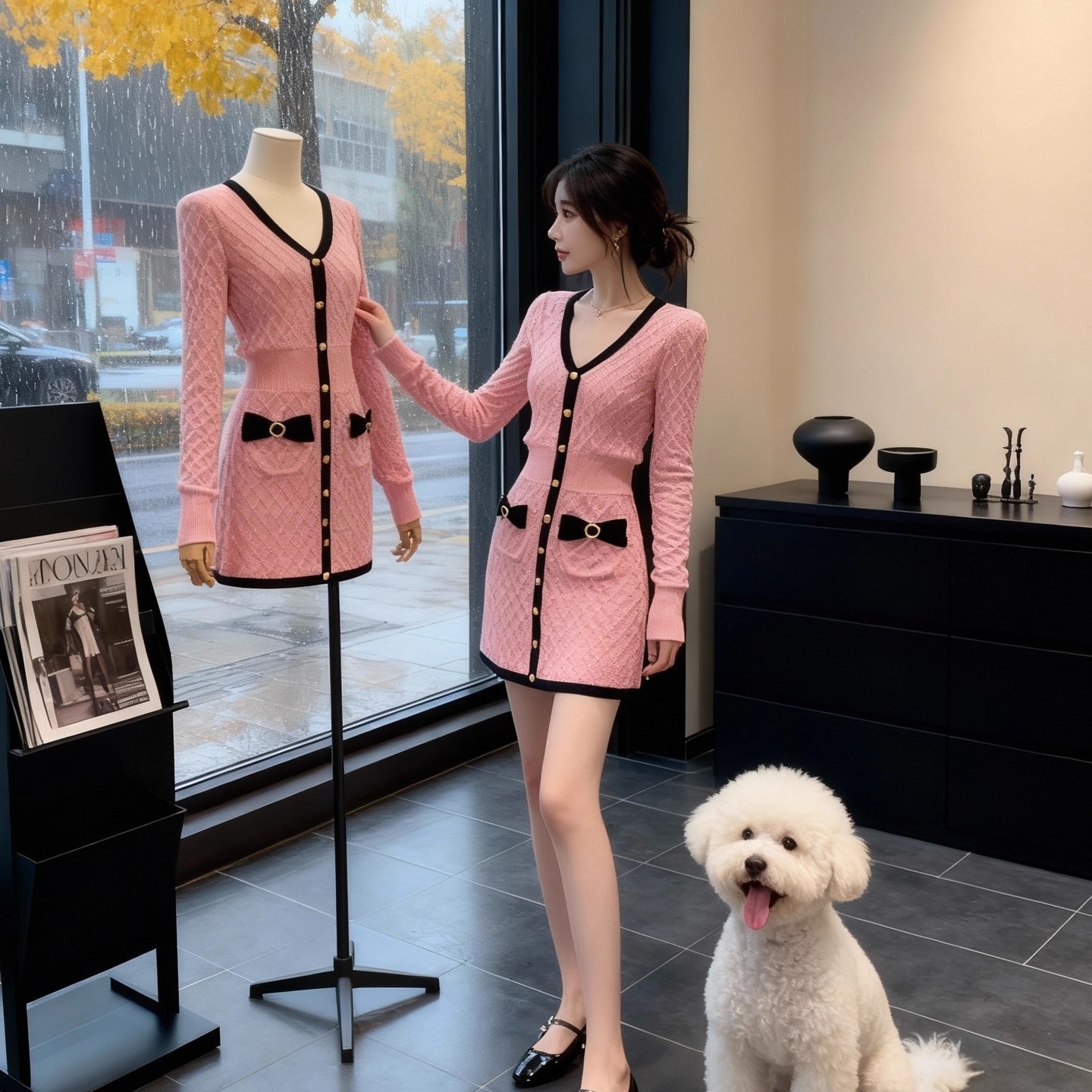 FA47236# 高级感V领针织粉色连衣裙女秋冬季撞色收腰显瘦修身气质裙子 服裝批發女裝批發服飾貨源