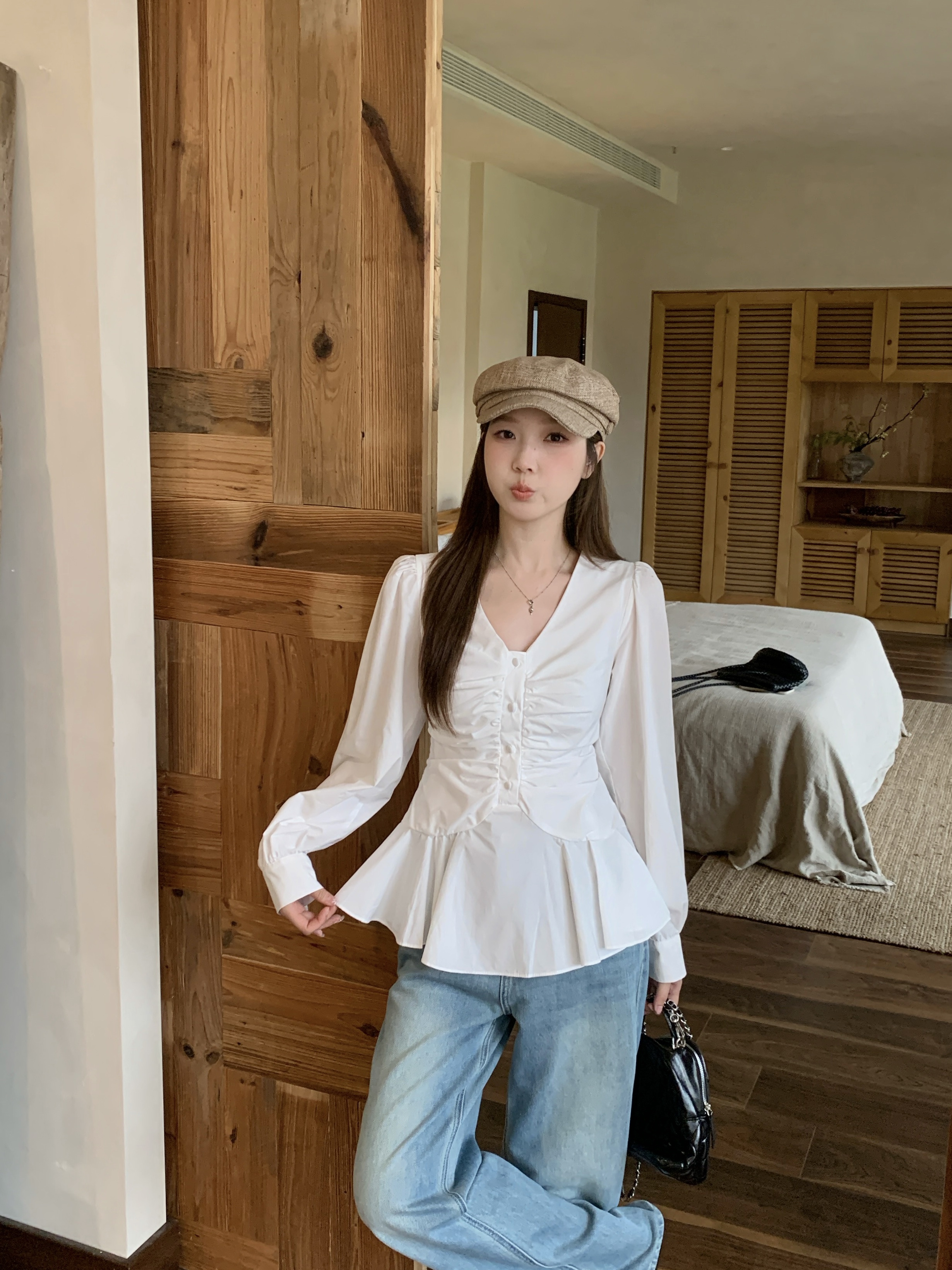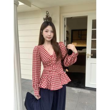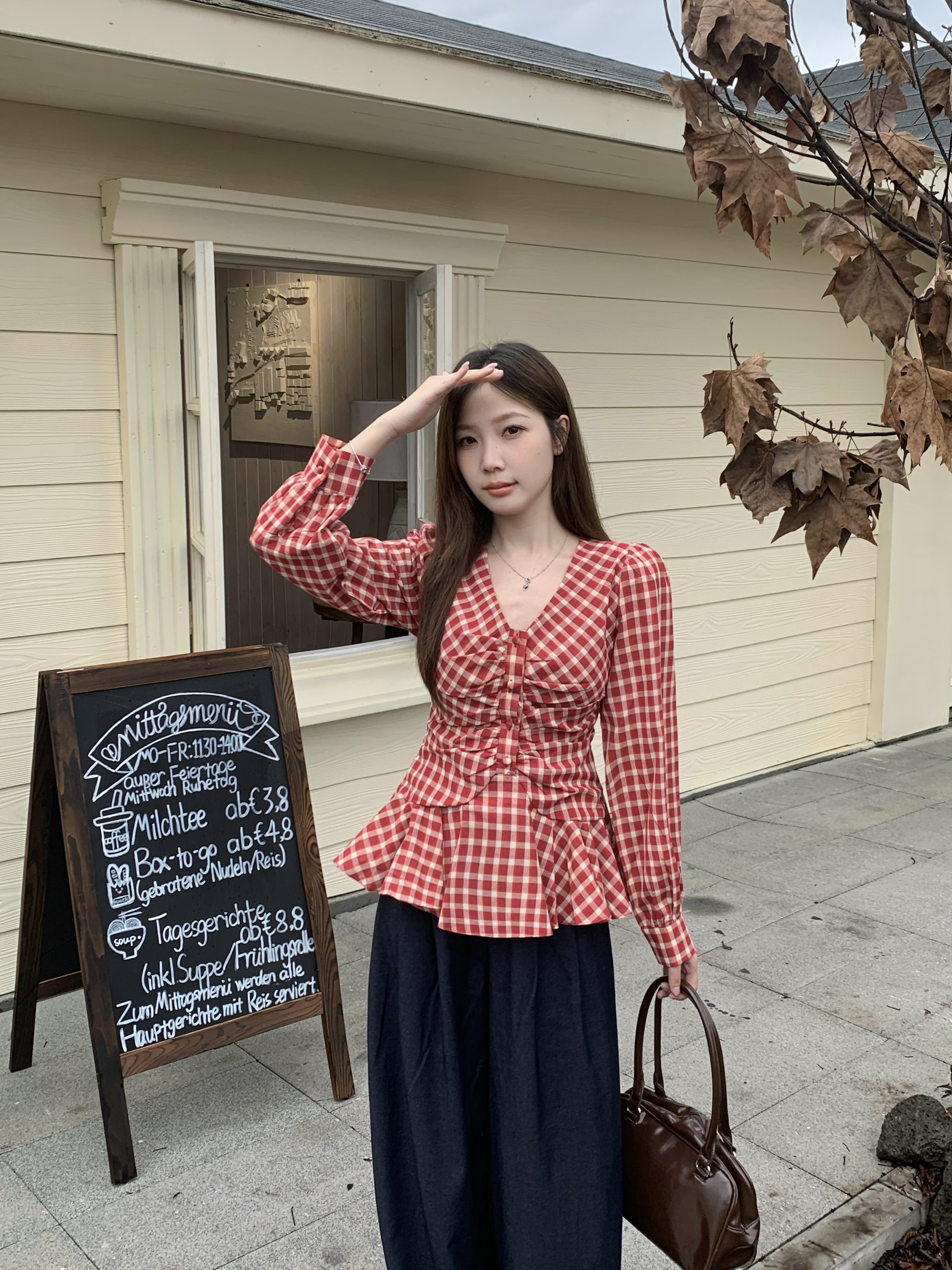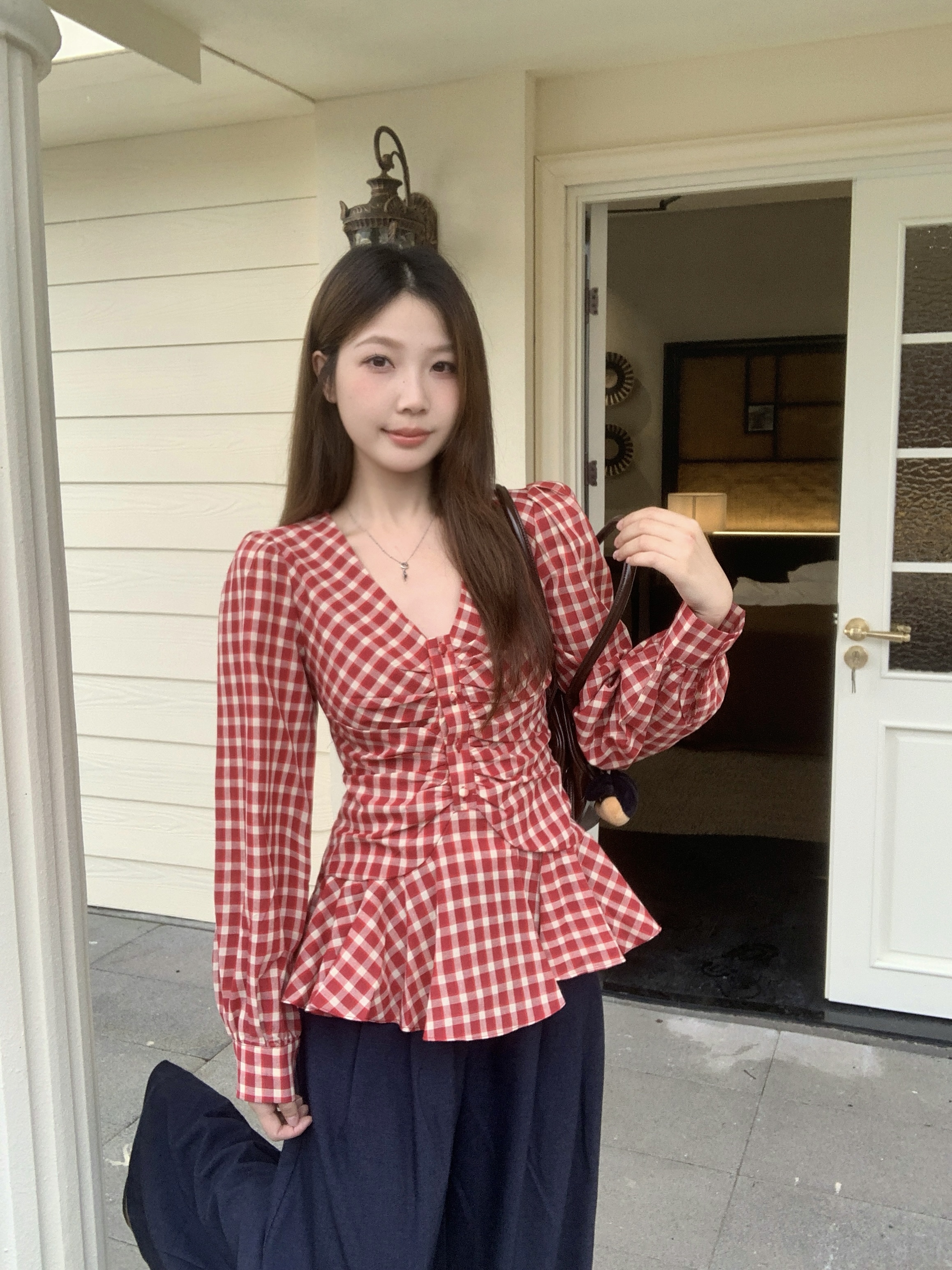 FA47284# 大码胖MM秋季新款法式复古格子V领长袖衬衣褶皱收腰显瘦上衣 服裝批發女裝批發服飾貨源