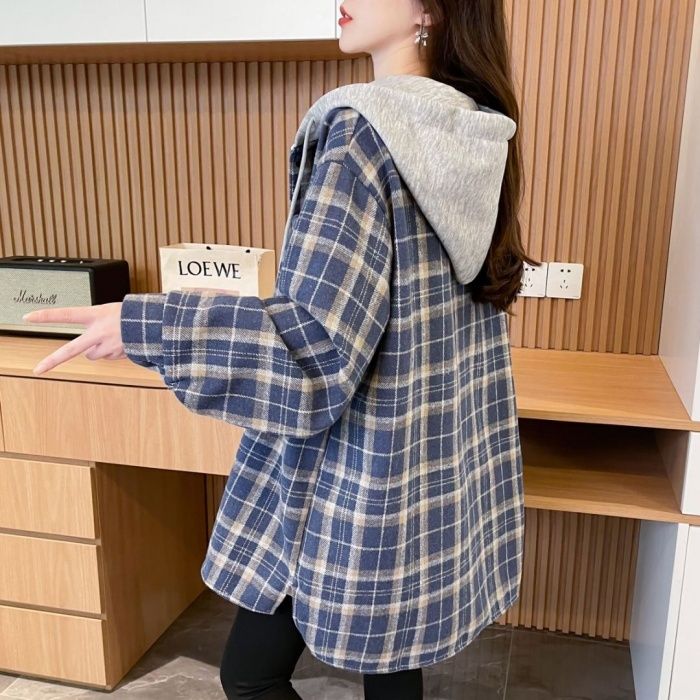 FA47307# 冬装复超柔抖音质量连帽格子男女同款衬衫中长款外套女 服裝批發女裝批發服飾貨源