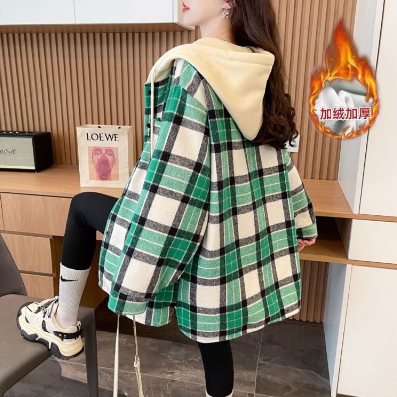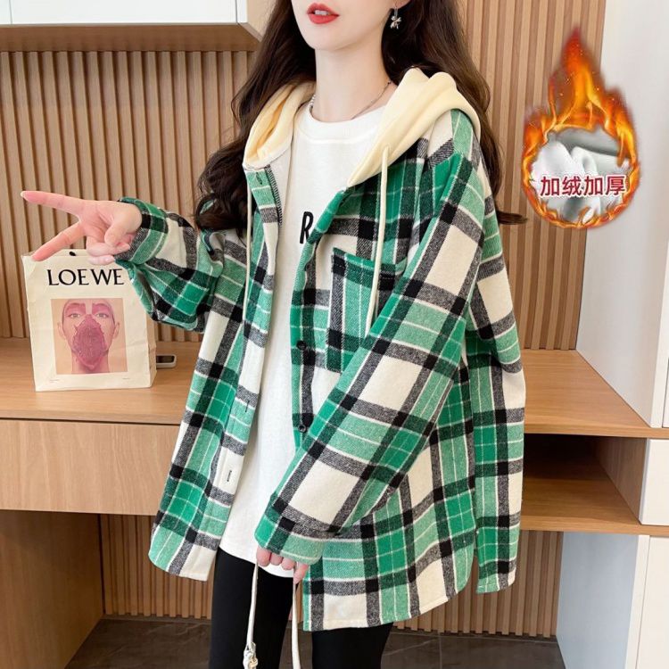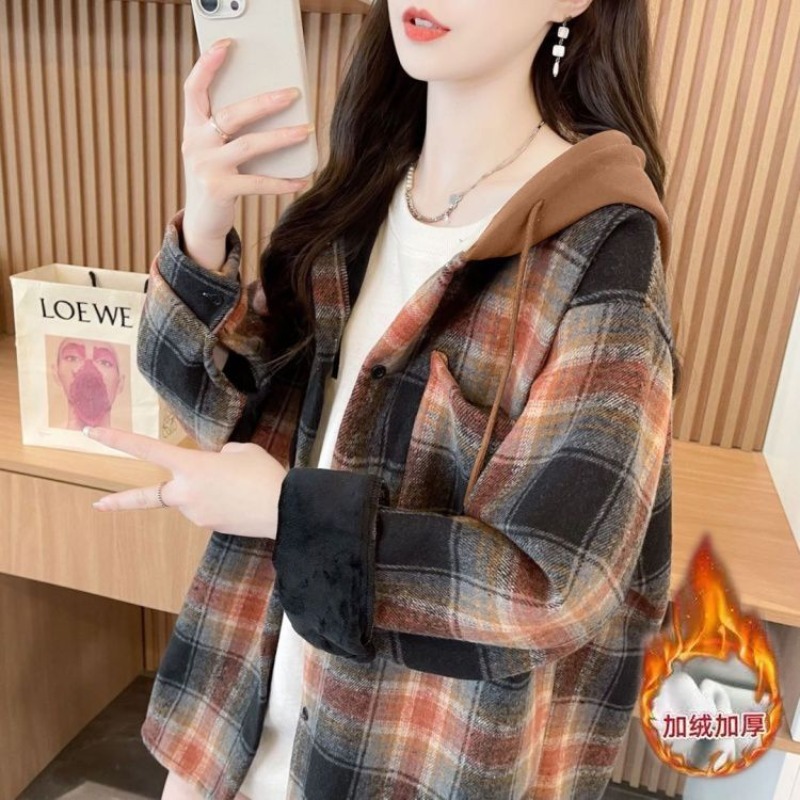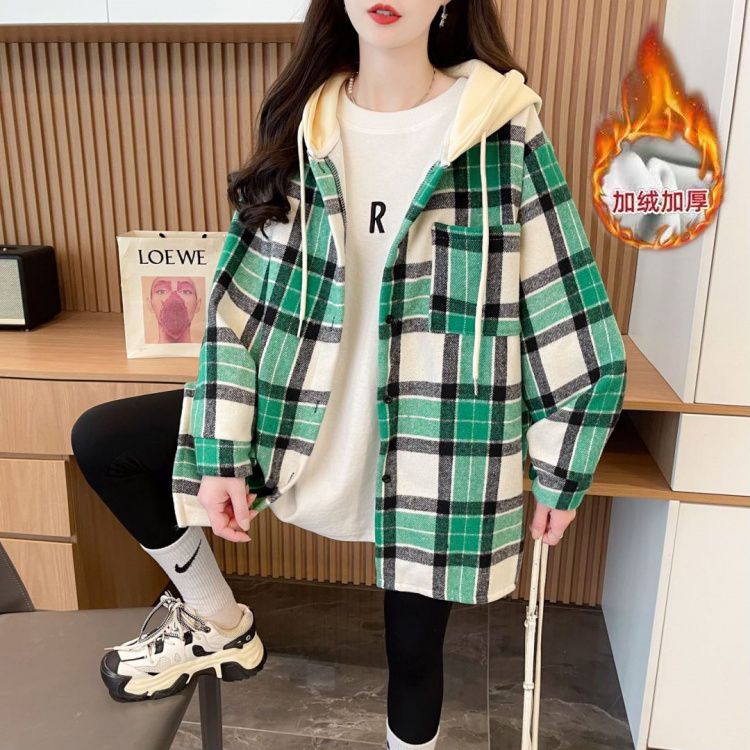 FA47308# 冬装复合超柔加绒抖音质量中长款外套连帽格子衬衫女 服裝批發女裝批發服飾貨源