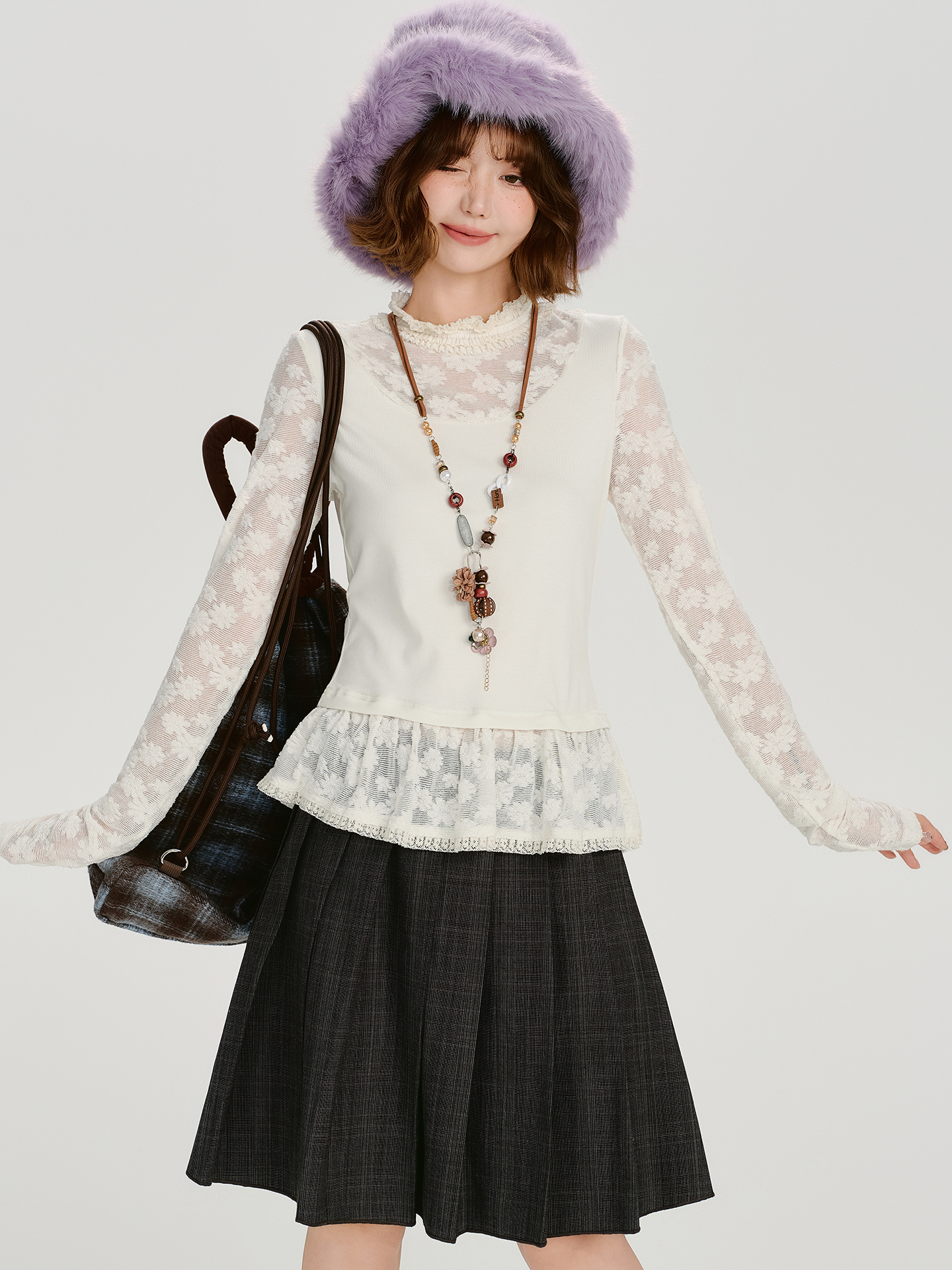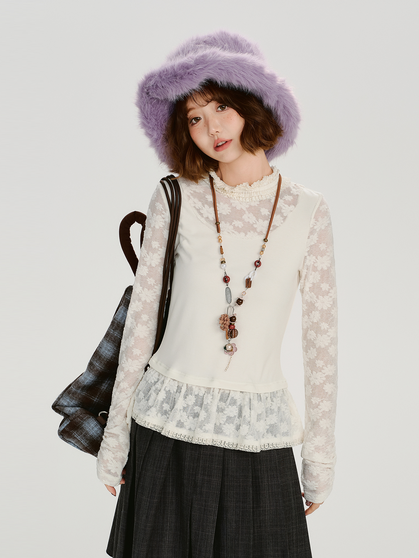 FA47342# 人棉抓毛美式复古蕾丝花边假两件长袖t恤女秋季新款修身显瘦上衣 服裝批發女裝批發服飾貨源