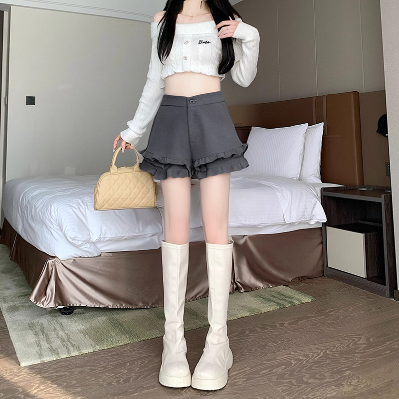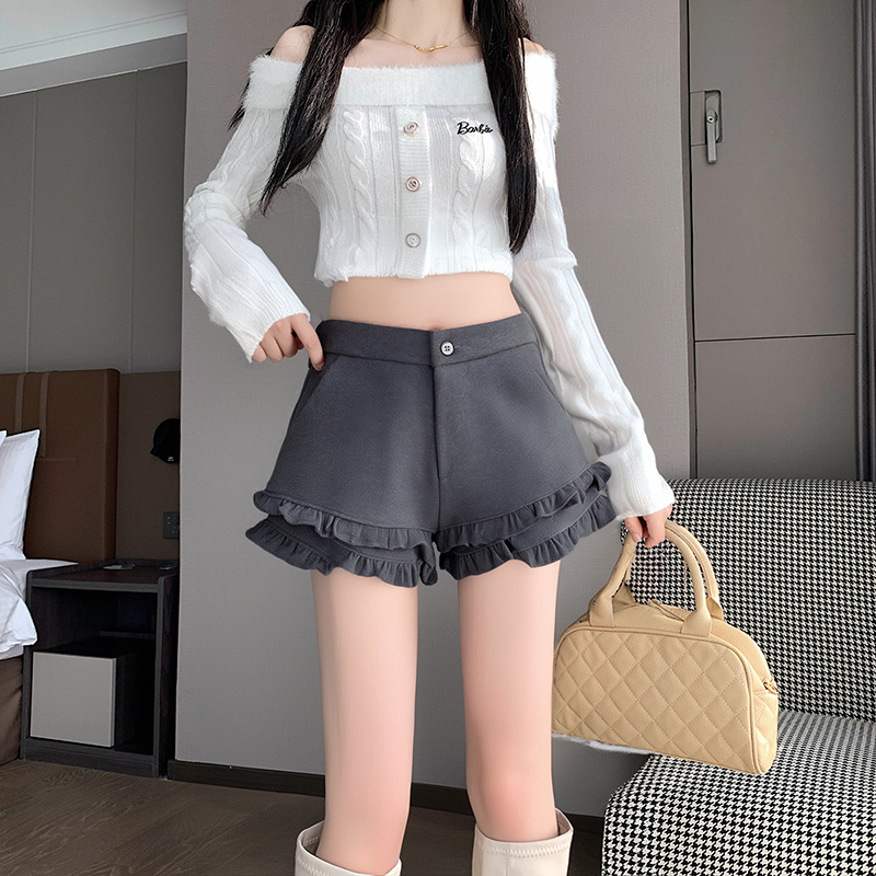 FA47348# 韩版时尚气质百搭木耳边休闲裤春季新款高腰显瘦A字阔腿短裤 服裝批發女裝批發服飾貨源