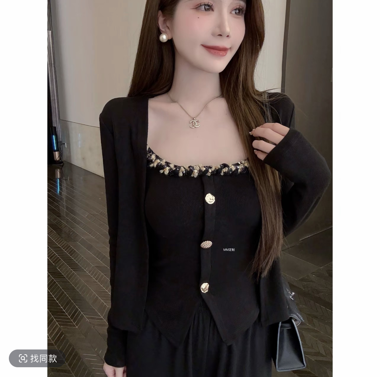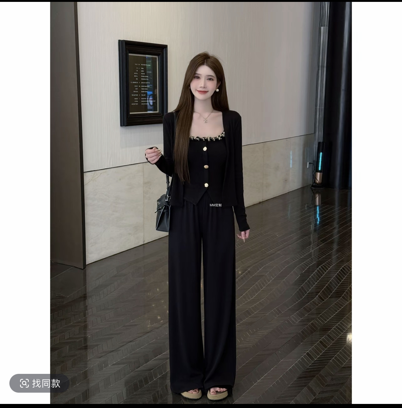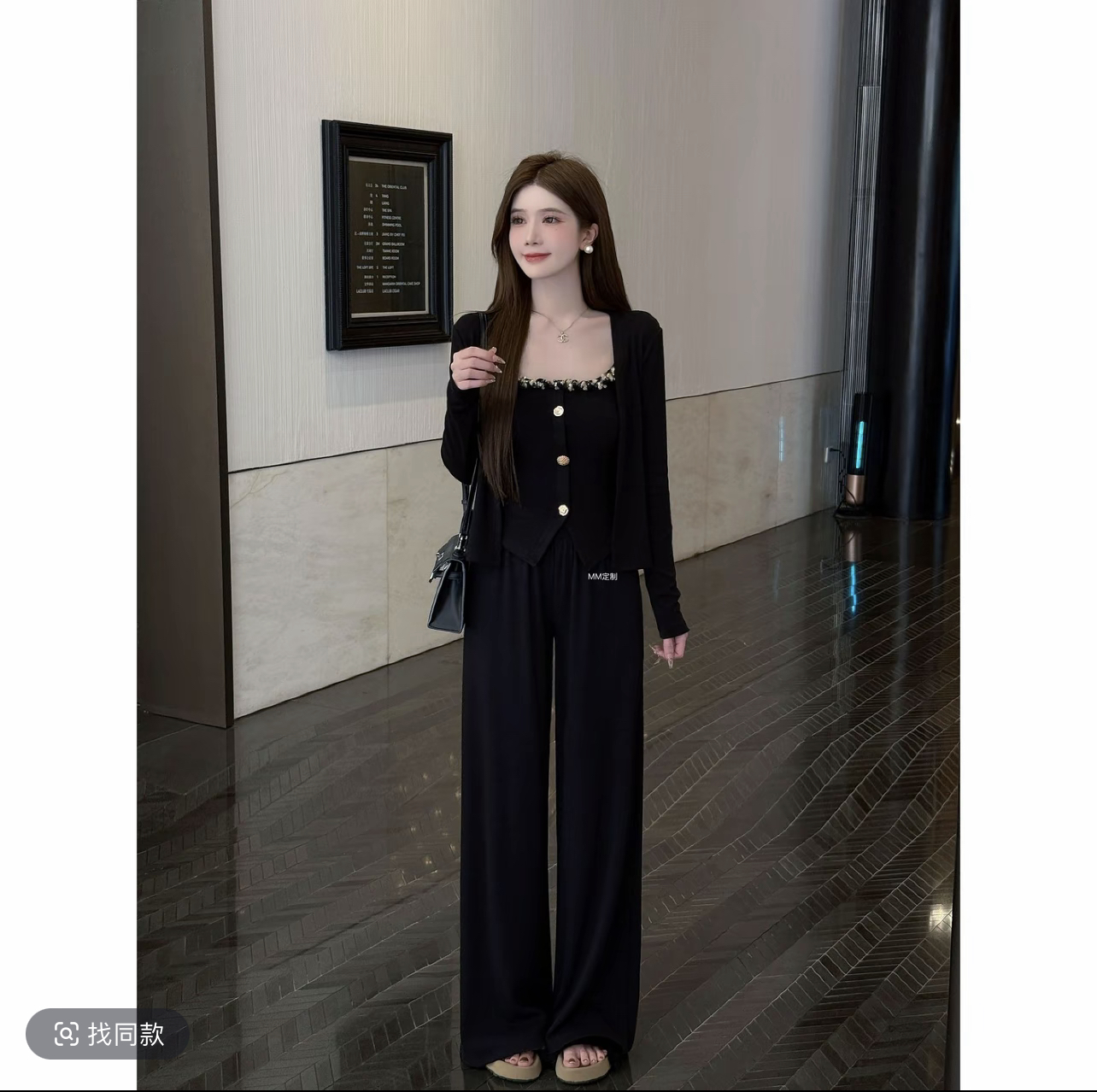FA47378# 微醺流光黑巧塔塔亮闪纽扣吊带长袖外胎百搭直筒长裤三件套 服裝批發女裝批發服飾貨源