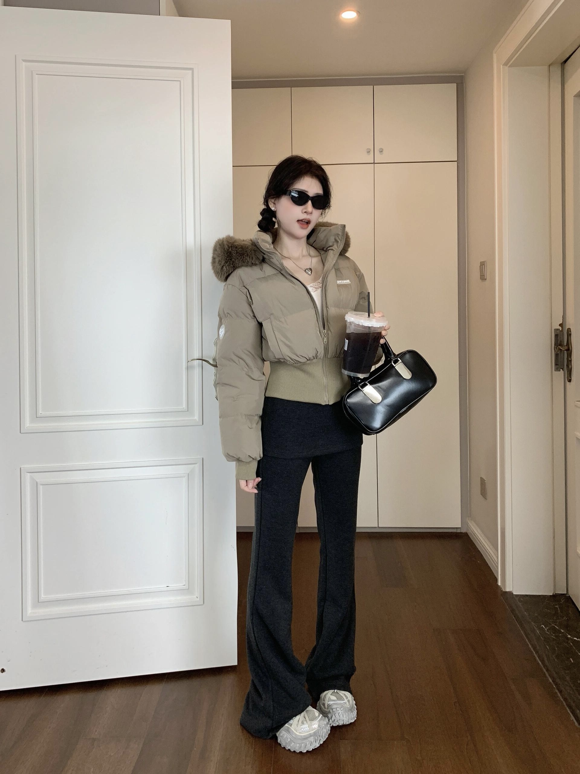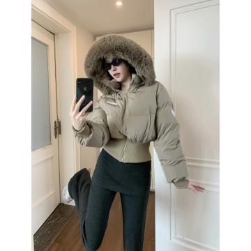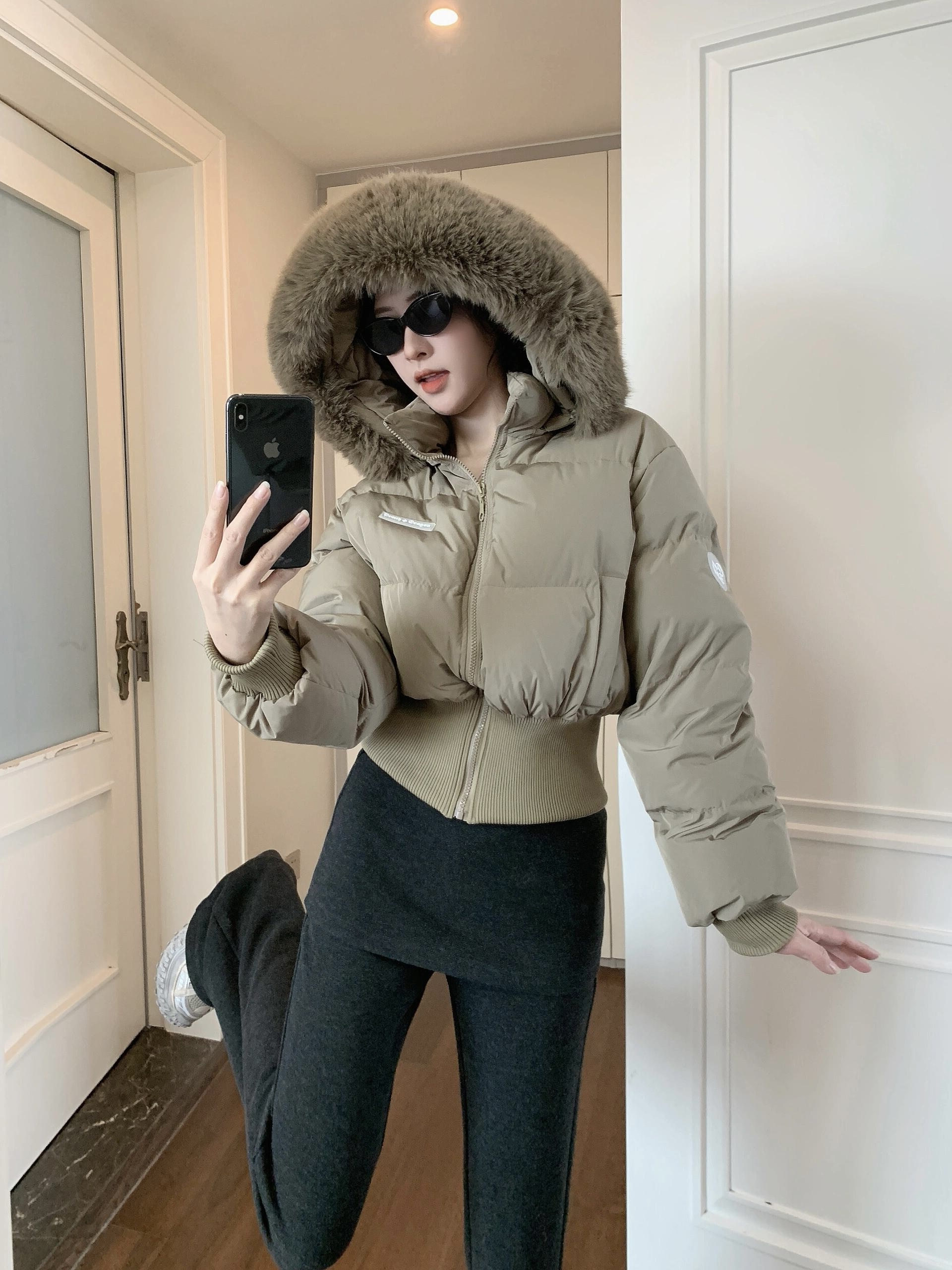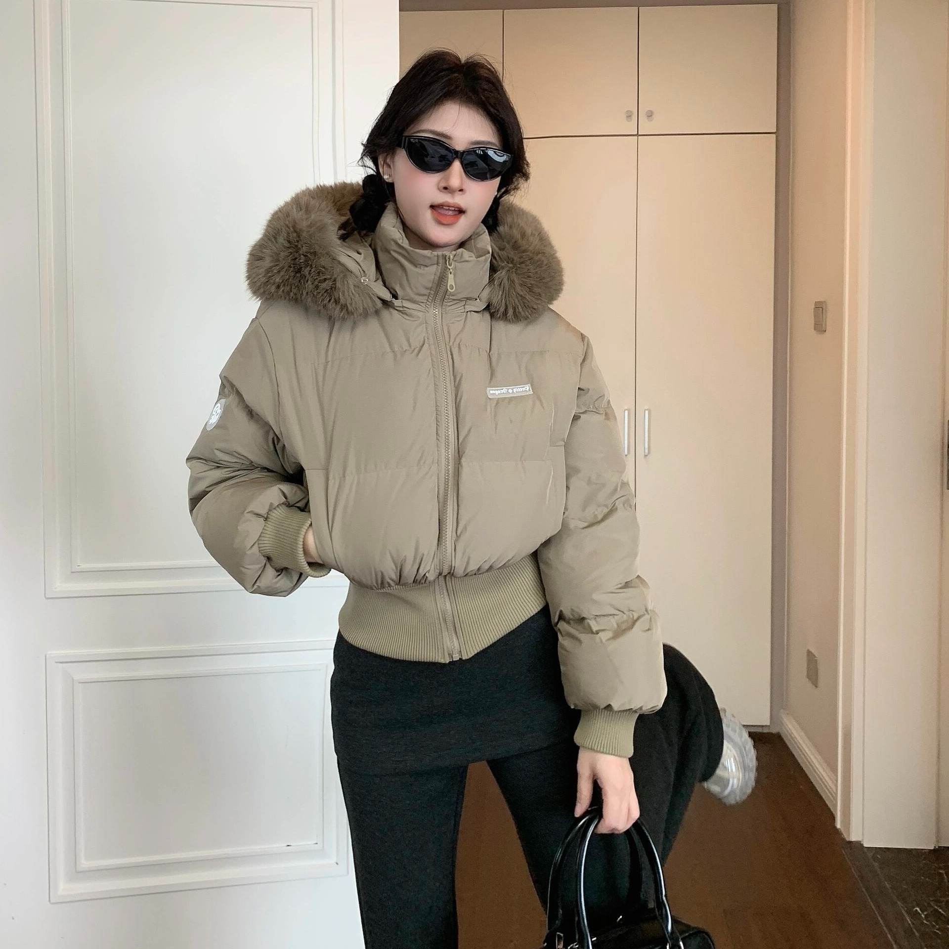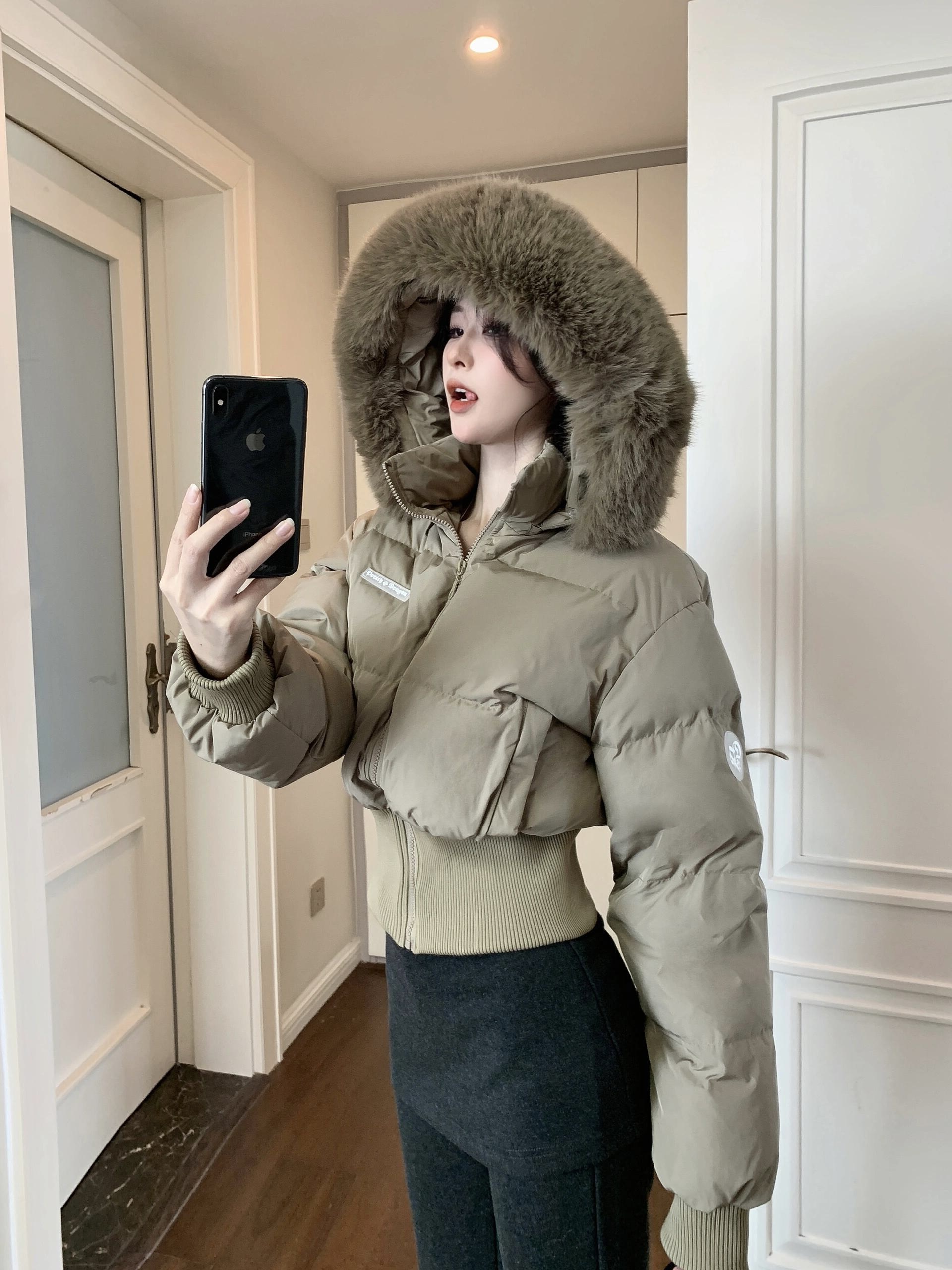 FA47609# 花花短款收腰修身仿白鸭绒保暖加厚毛边连帽面包服外套女 服裝批發女裝批發服飾貨源