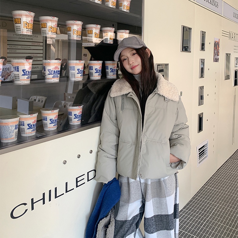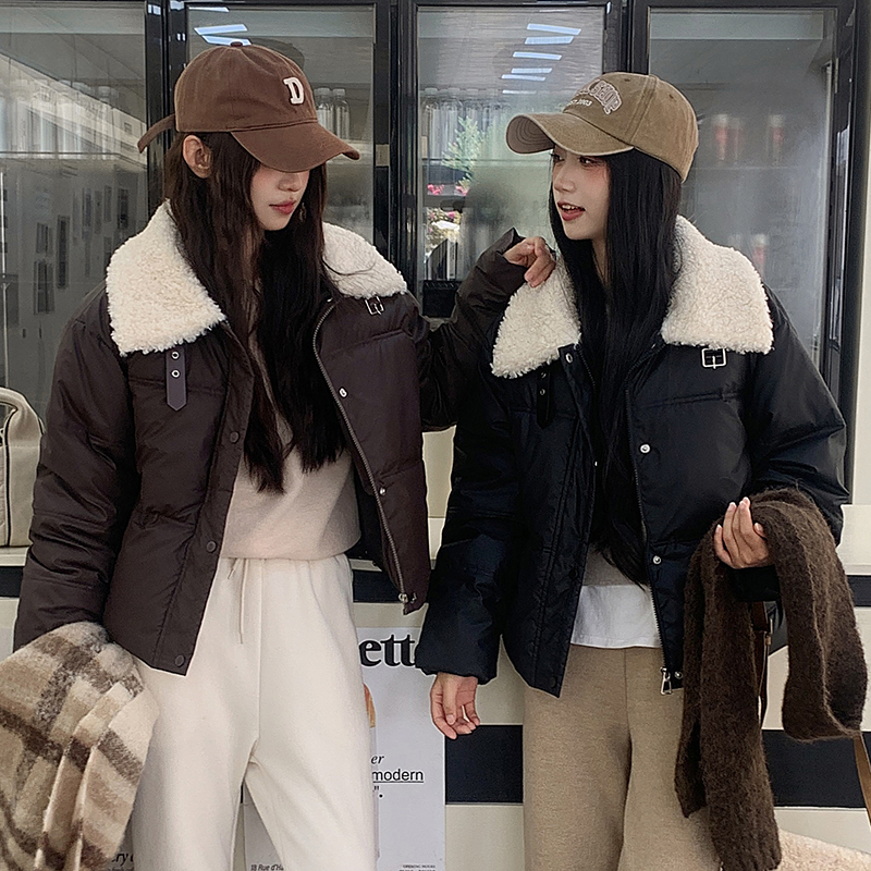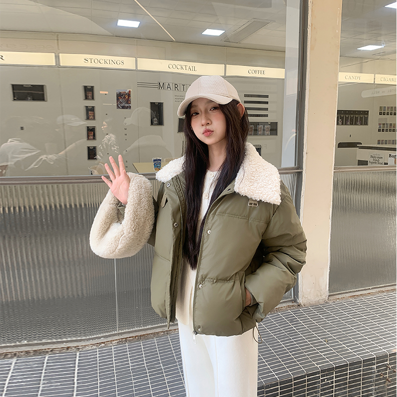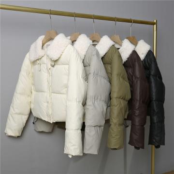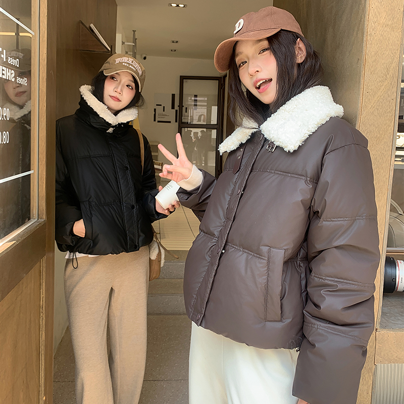 FA47611# 爆款立领羊羔毛设计感PU质感短款羽绒棉服保暖时尚冬季外套女 服裝批發女裝批發服飾貨源