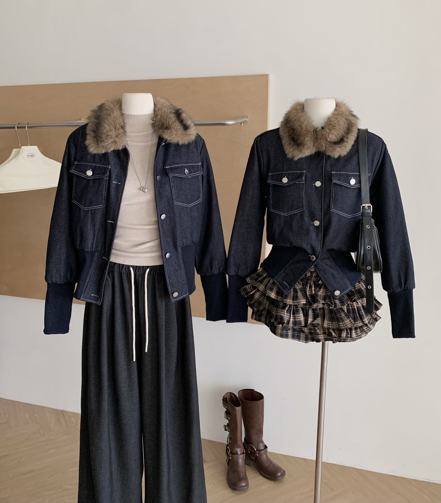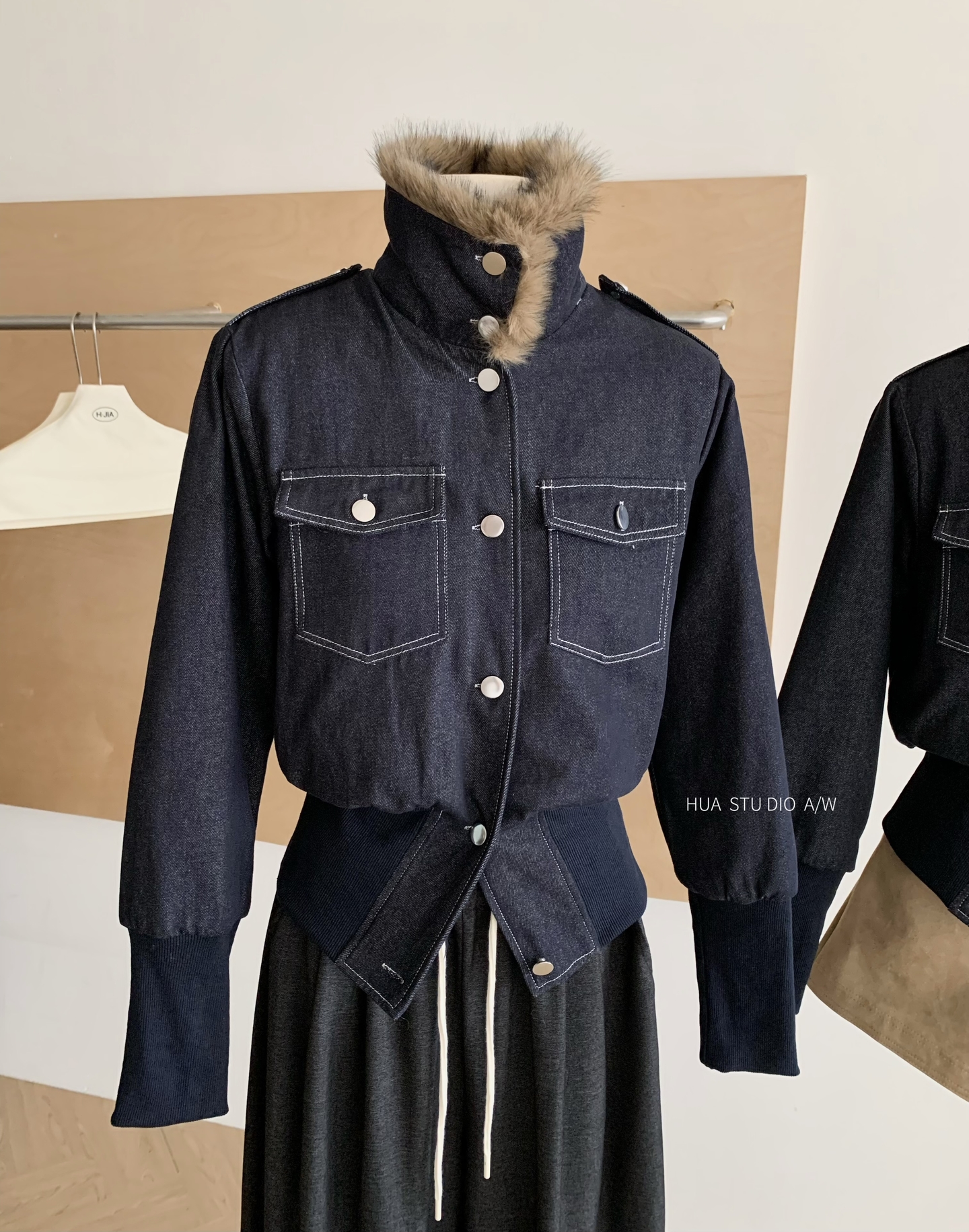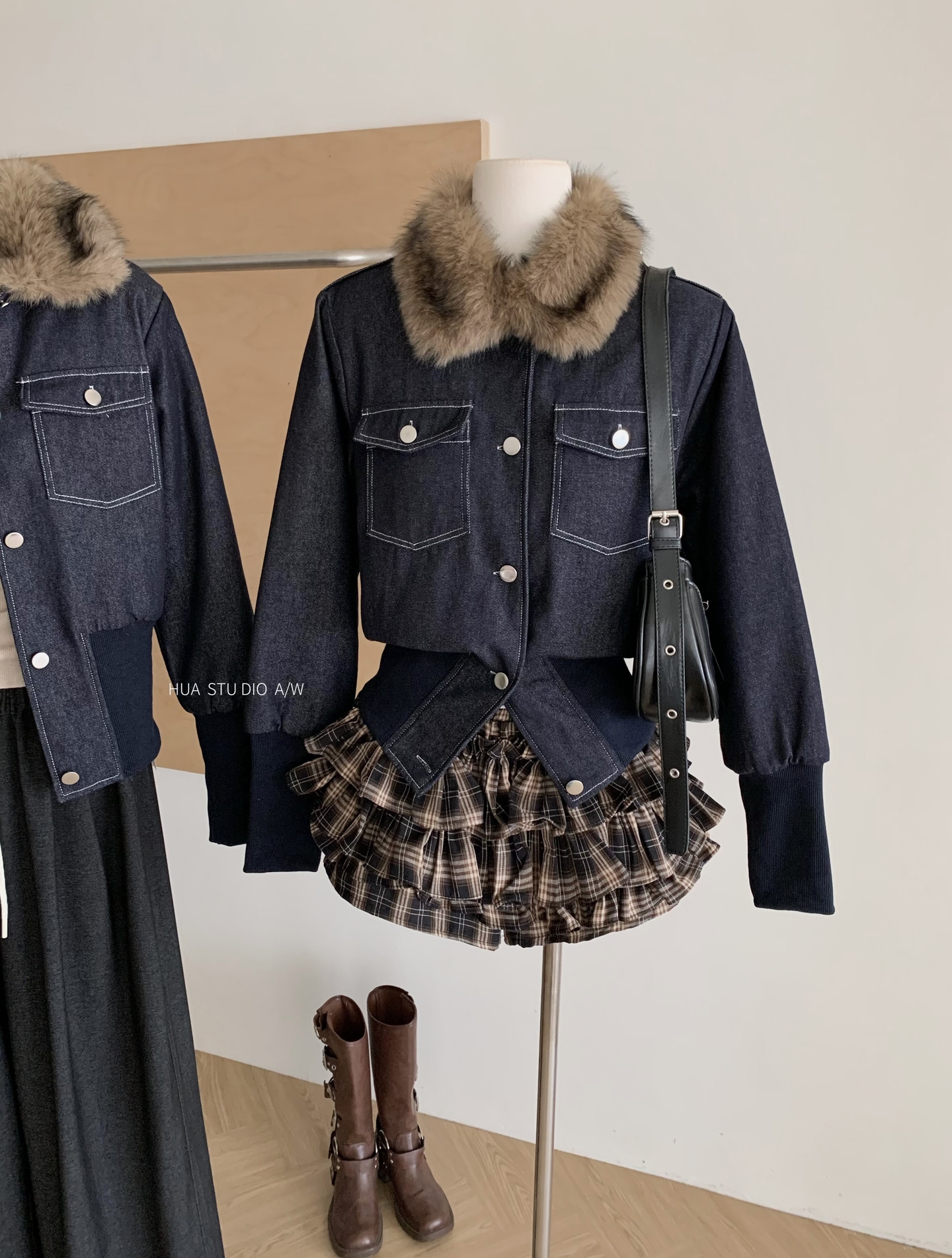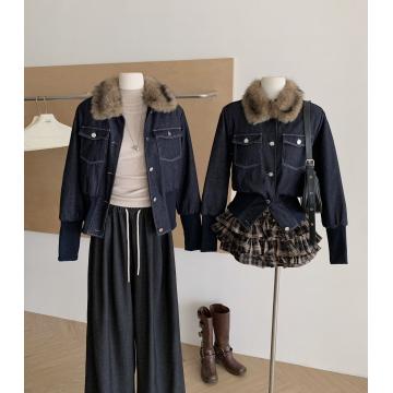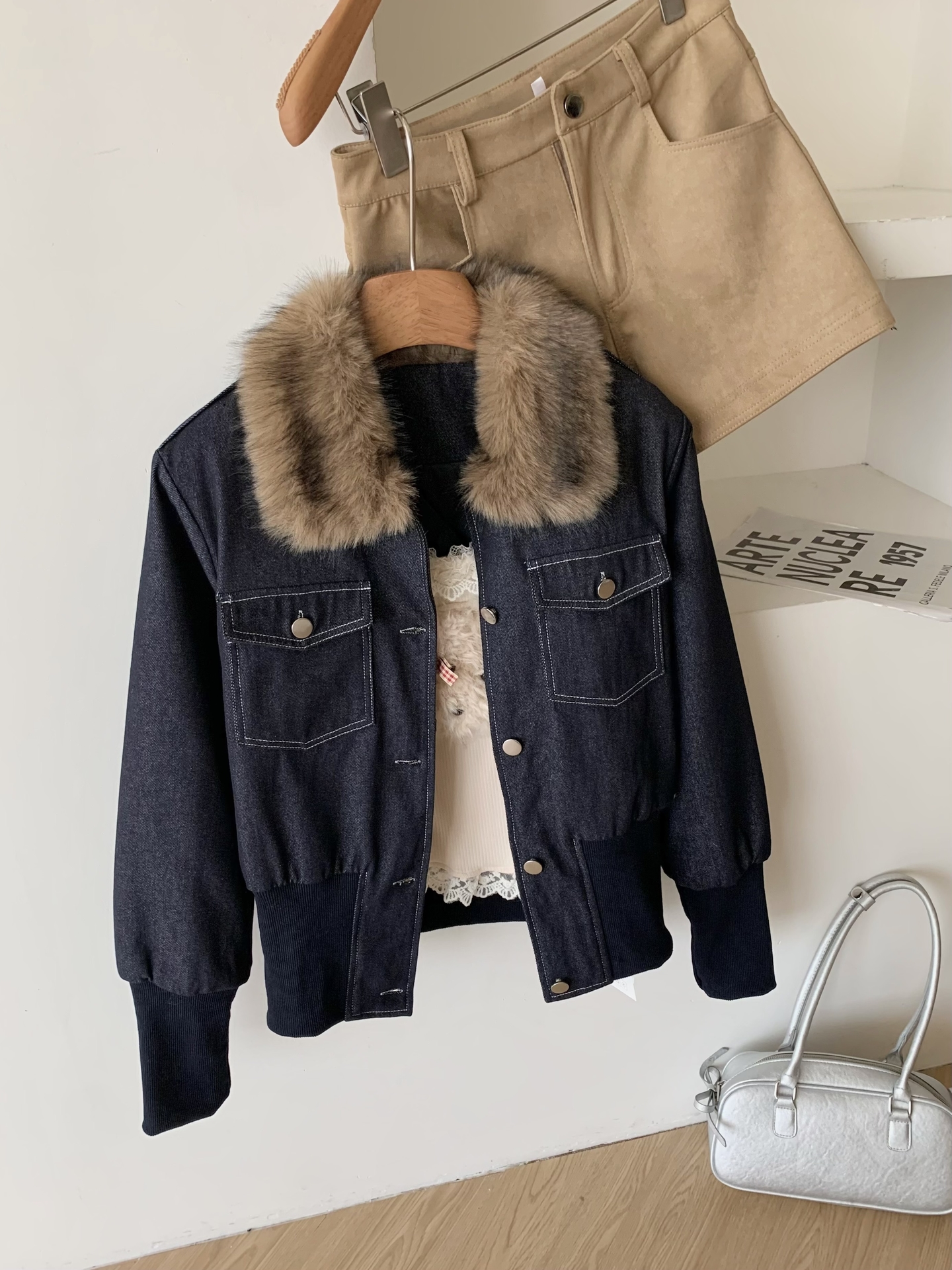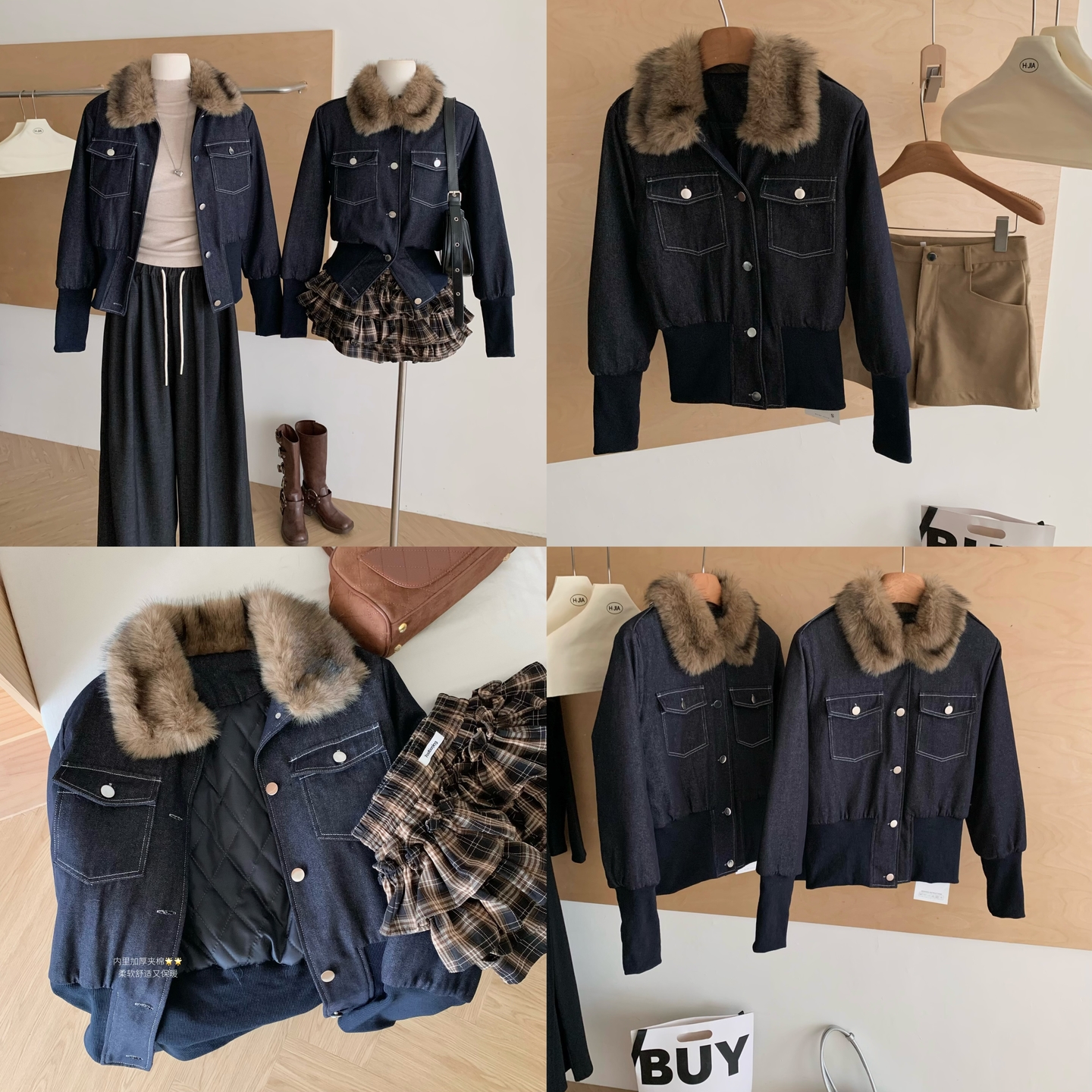 FA47936# 美式复古毛领牛仔短外套女秋冬季辣妹收腰显瘦气质夹棉外搭上衣 服裝批發女裝批發服飾貨源