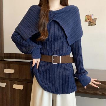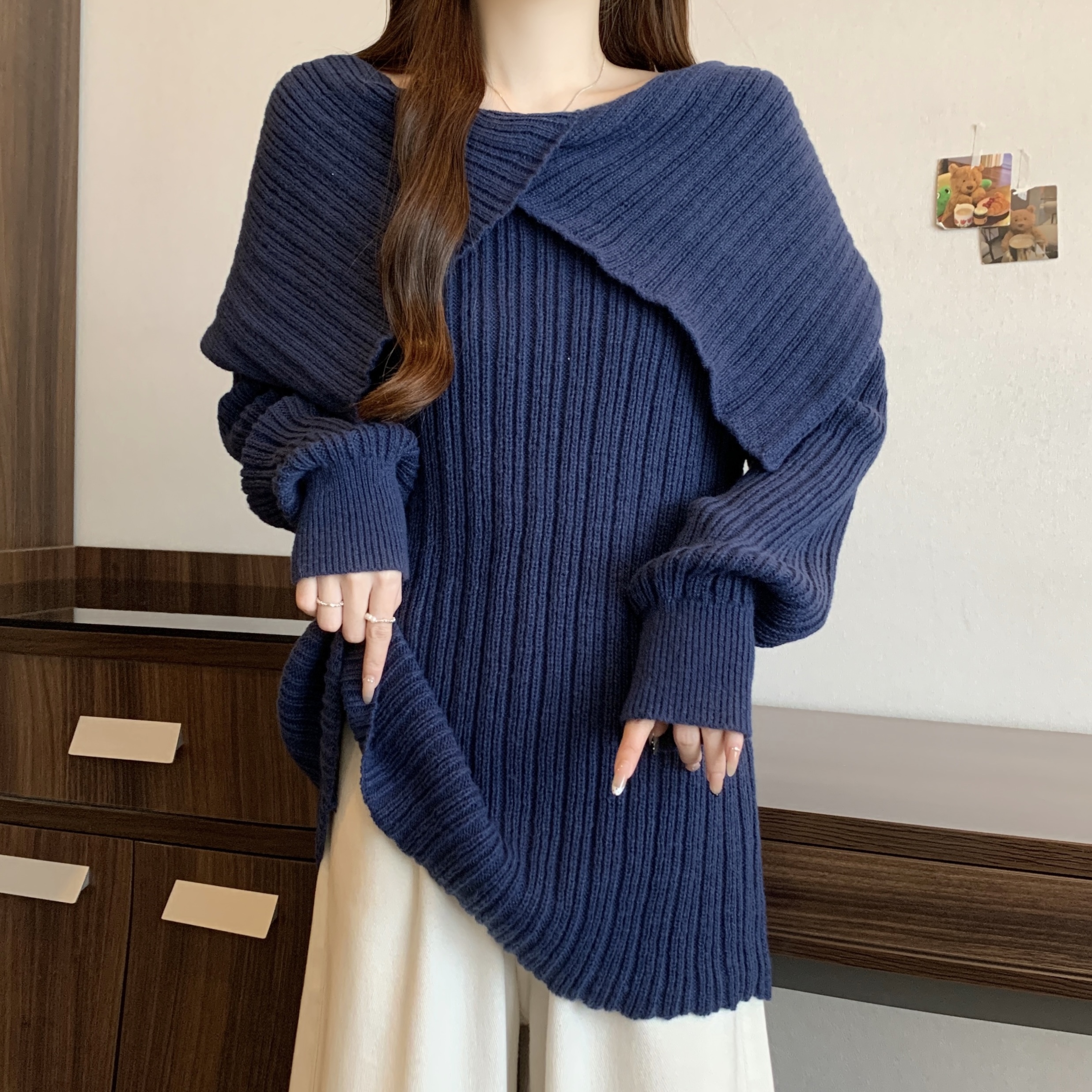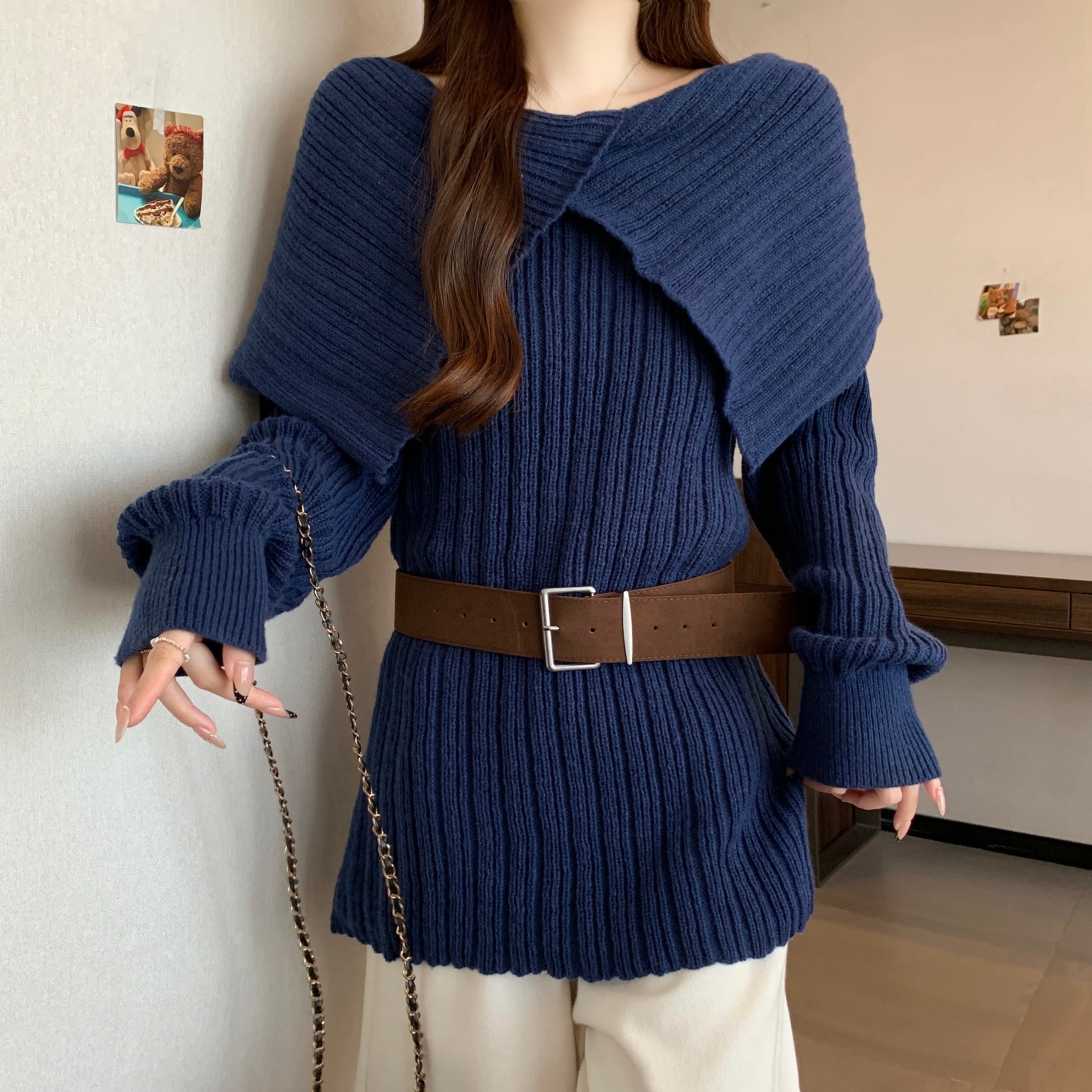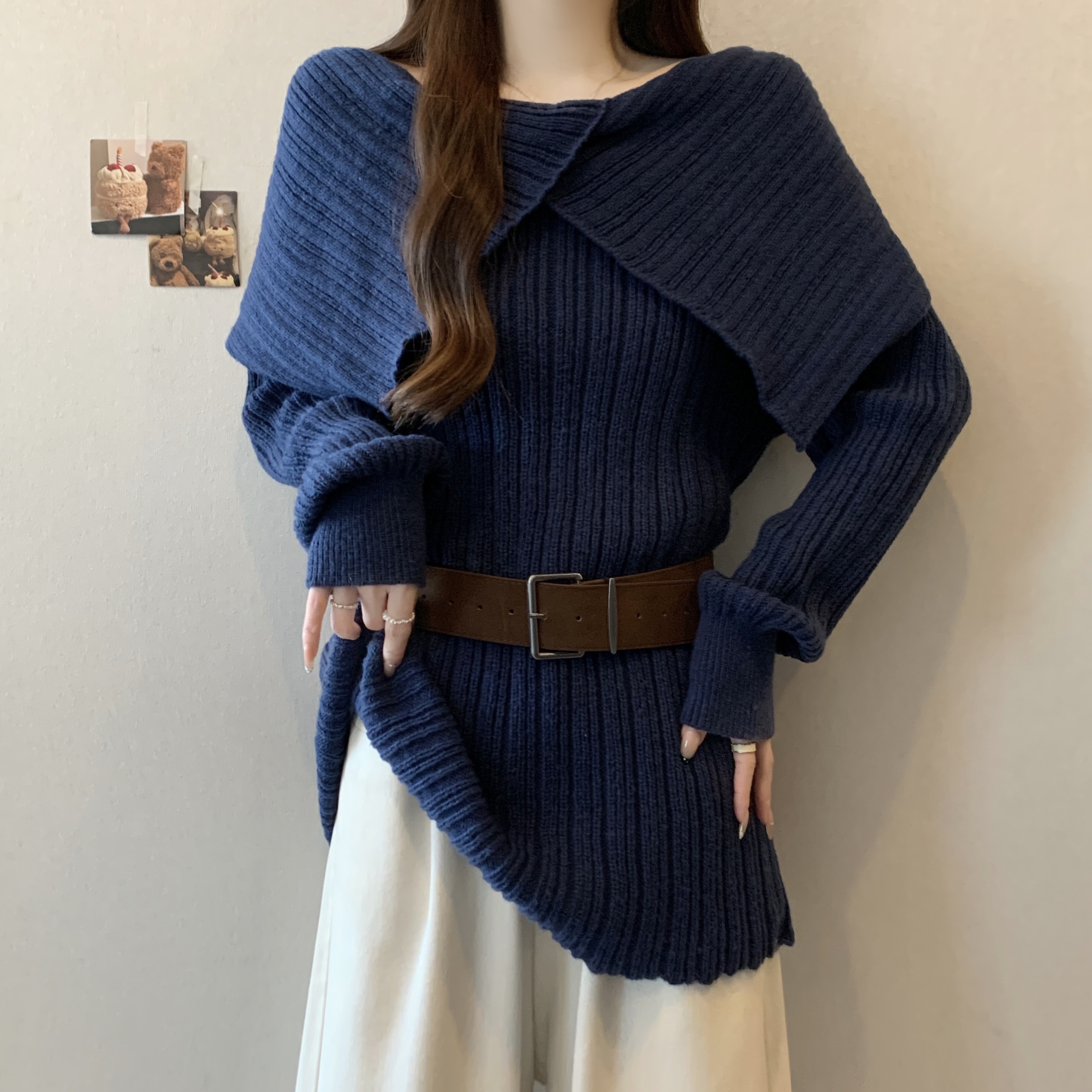 FA48402# 大码一字肩针织衫蓝色毛衣秋冬胖mm遮肉显瘦设计感长袖上衣 服裝批發女裝批發服飾貨源