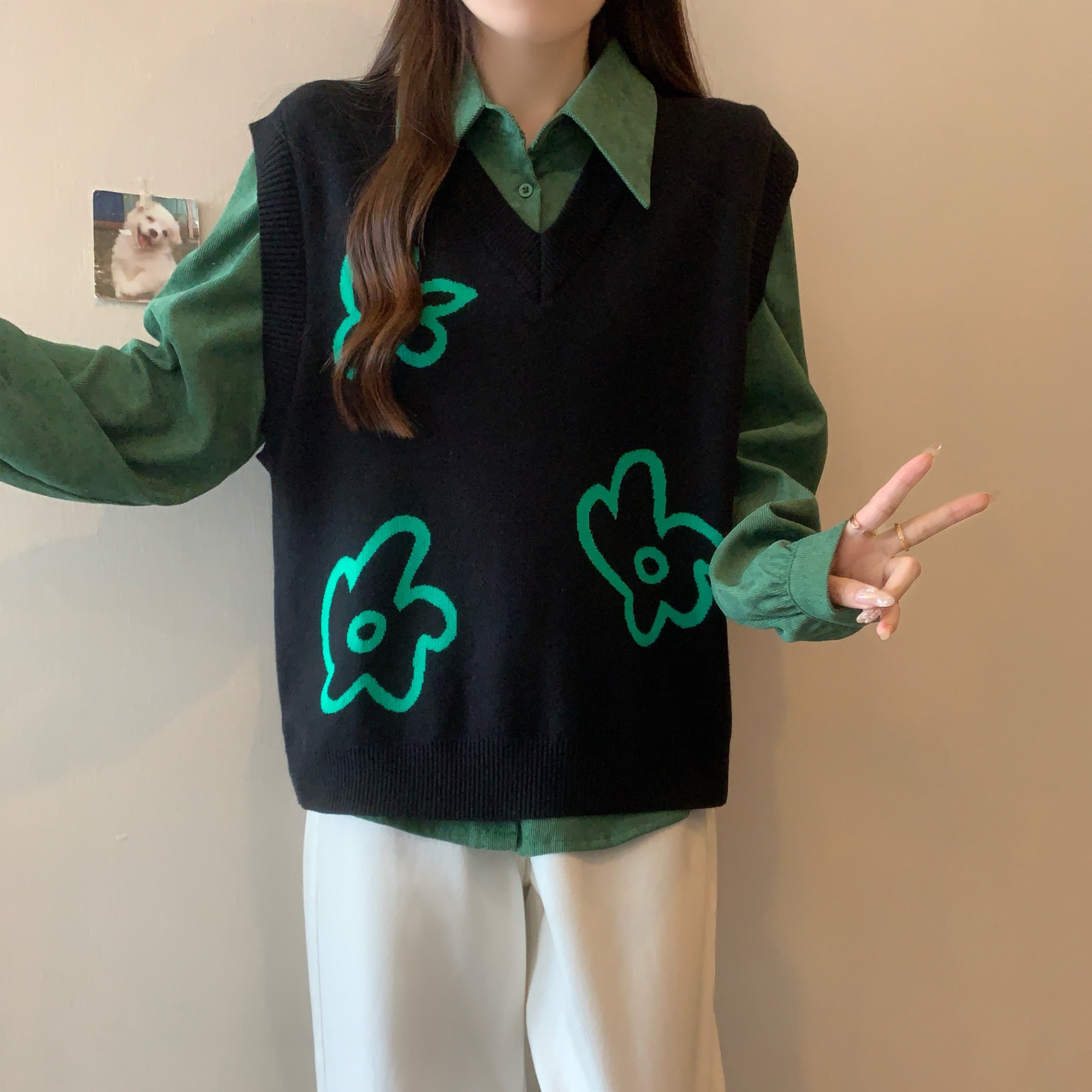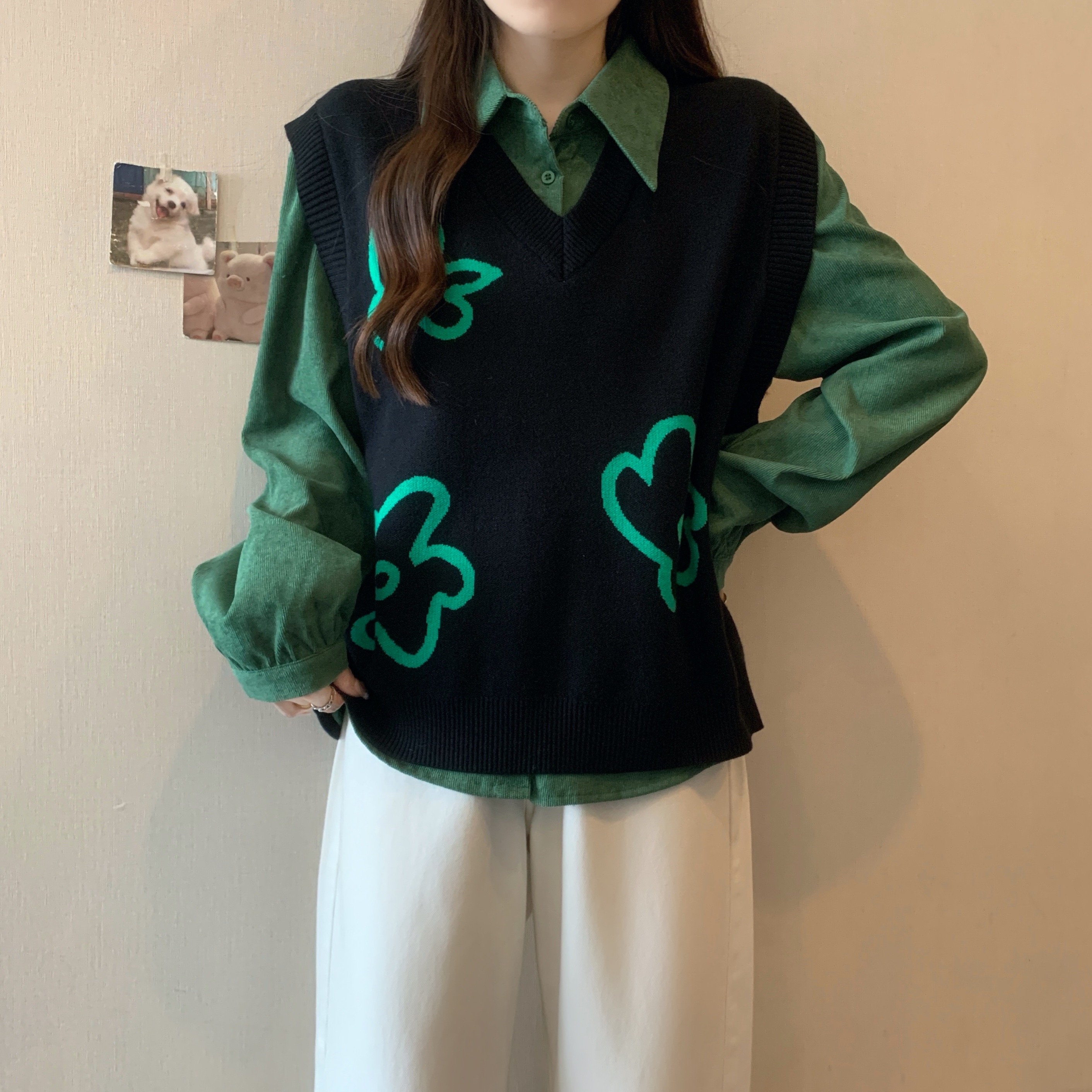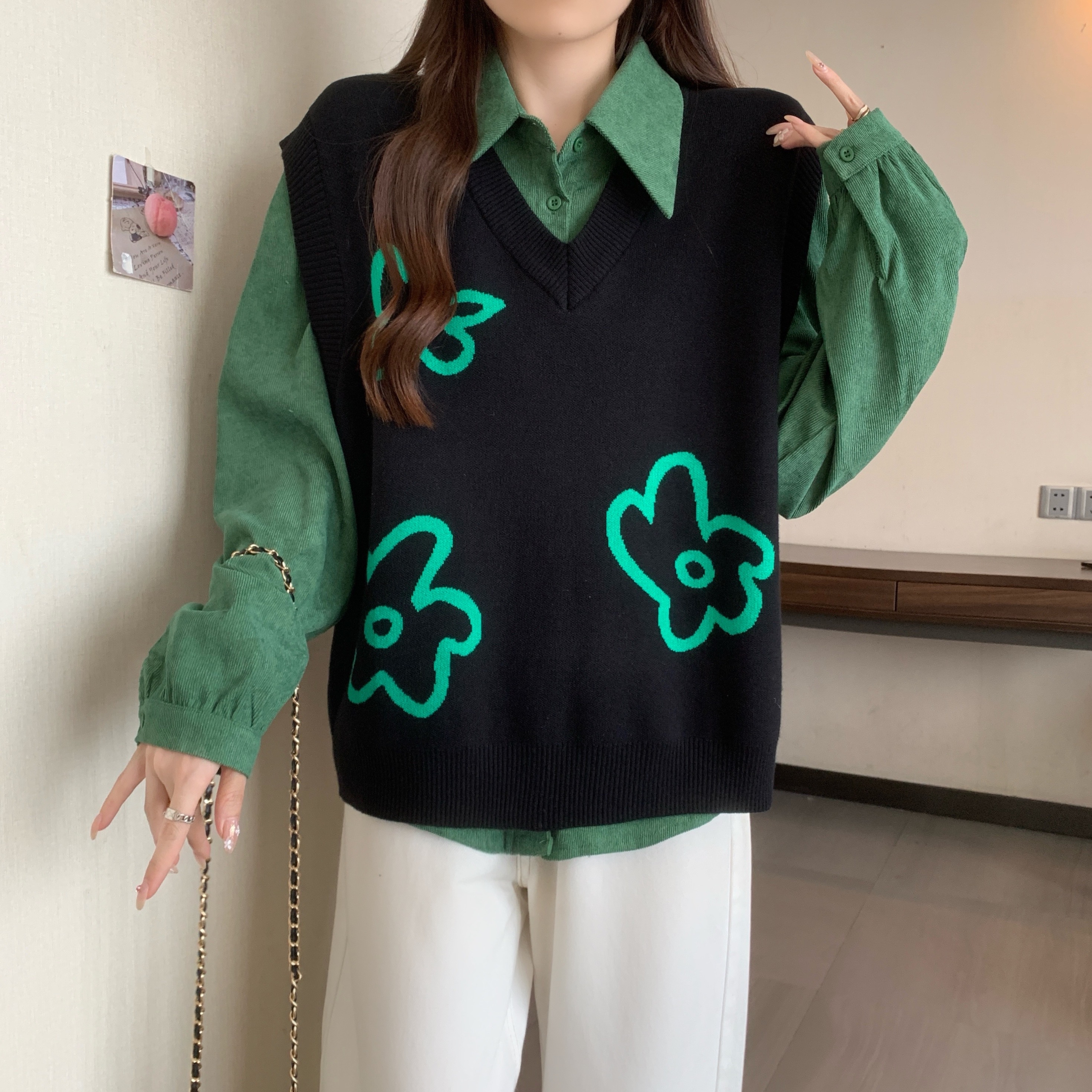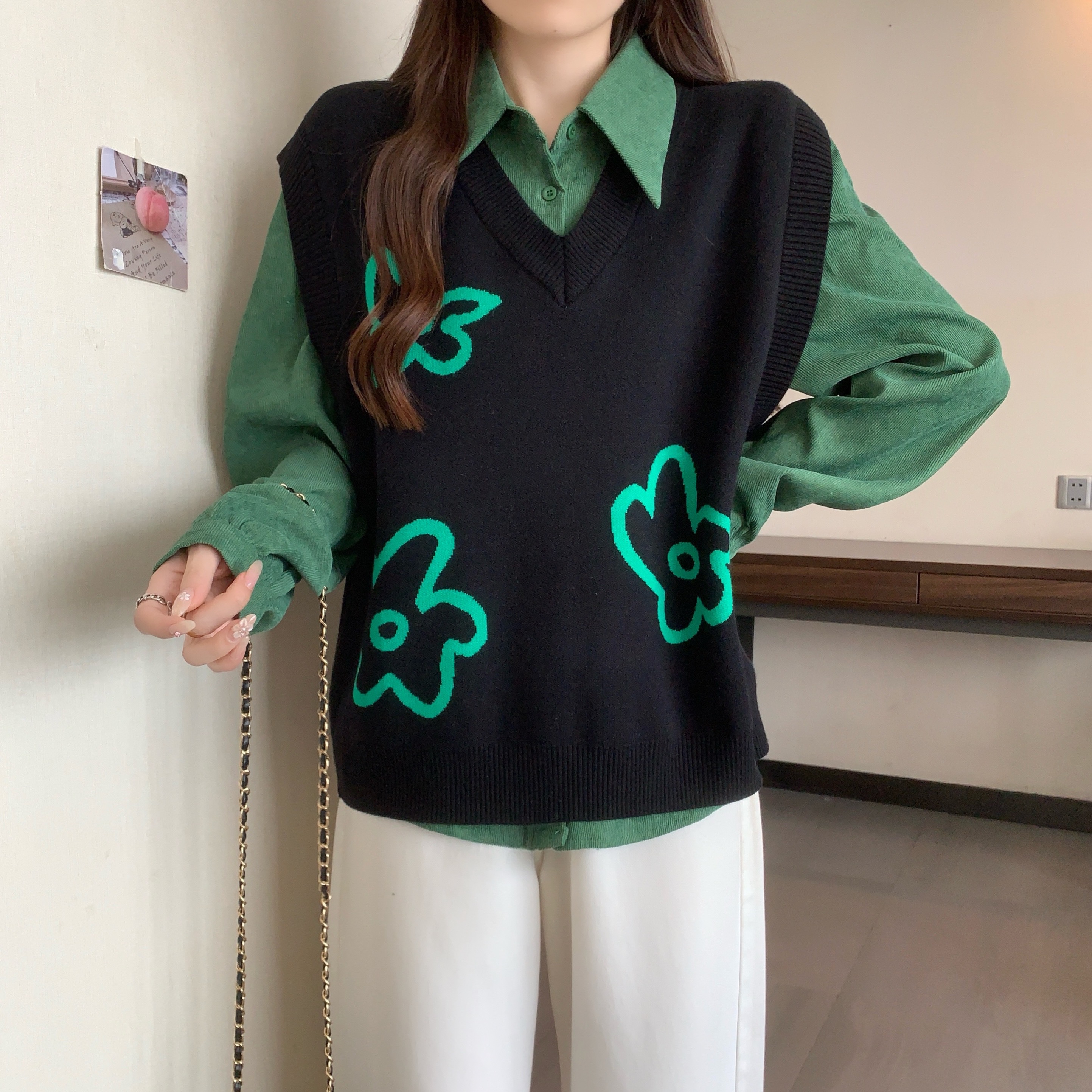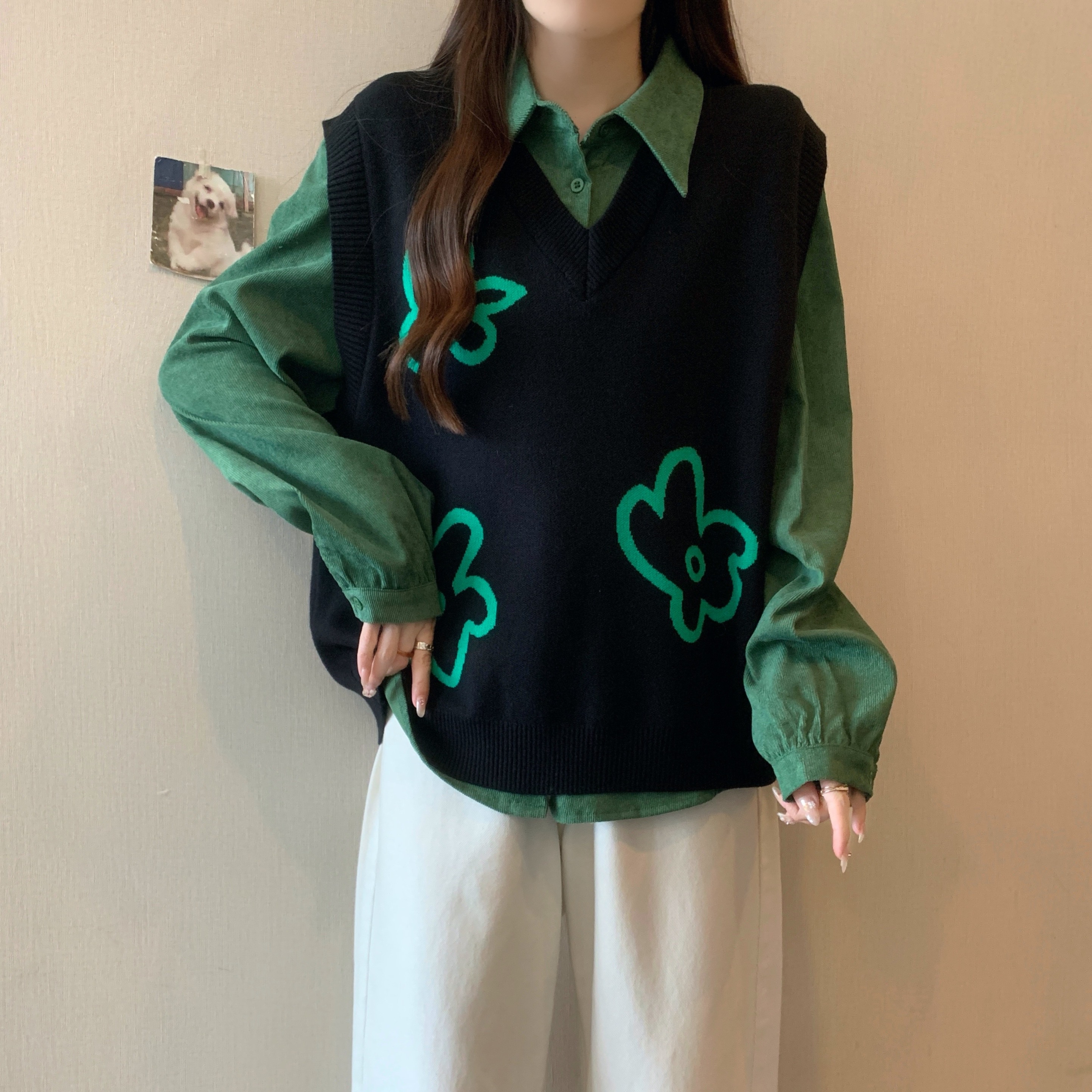 FA48403# 大码初秋叠穿马甲两件套上衣女绿色衬衫高级感针织背心套装 服裝批發女裝批發服飾貨源