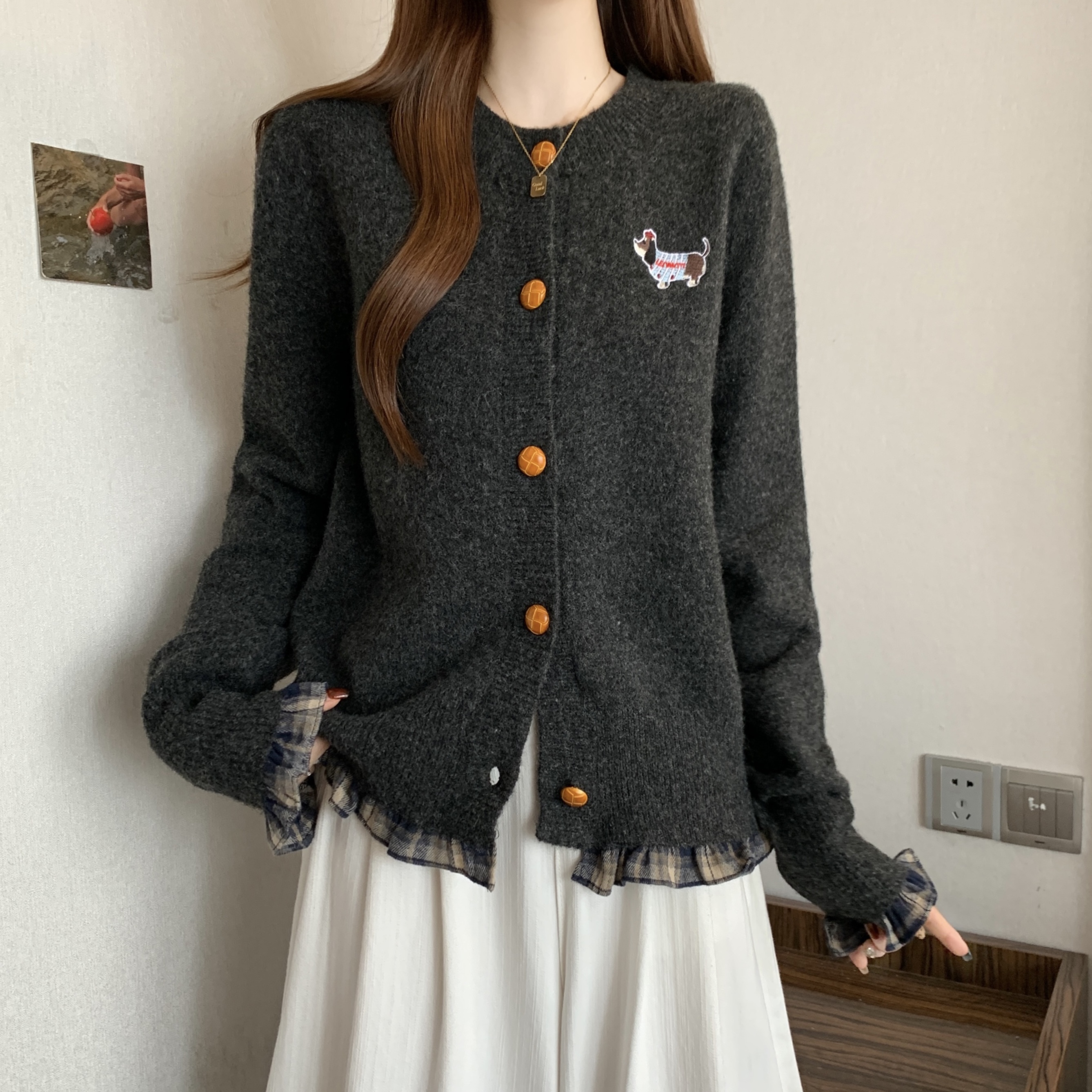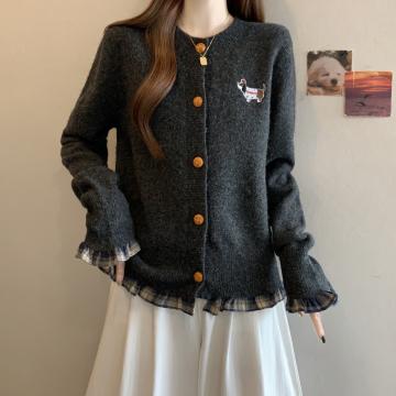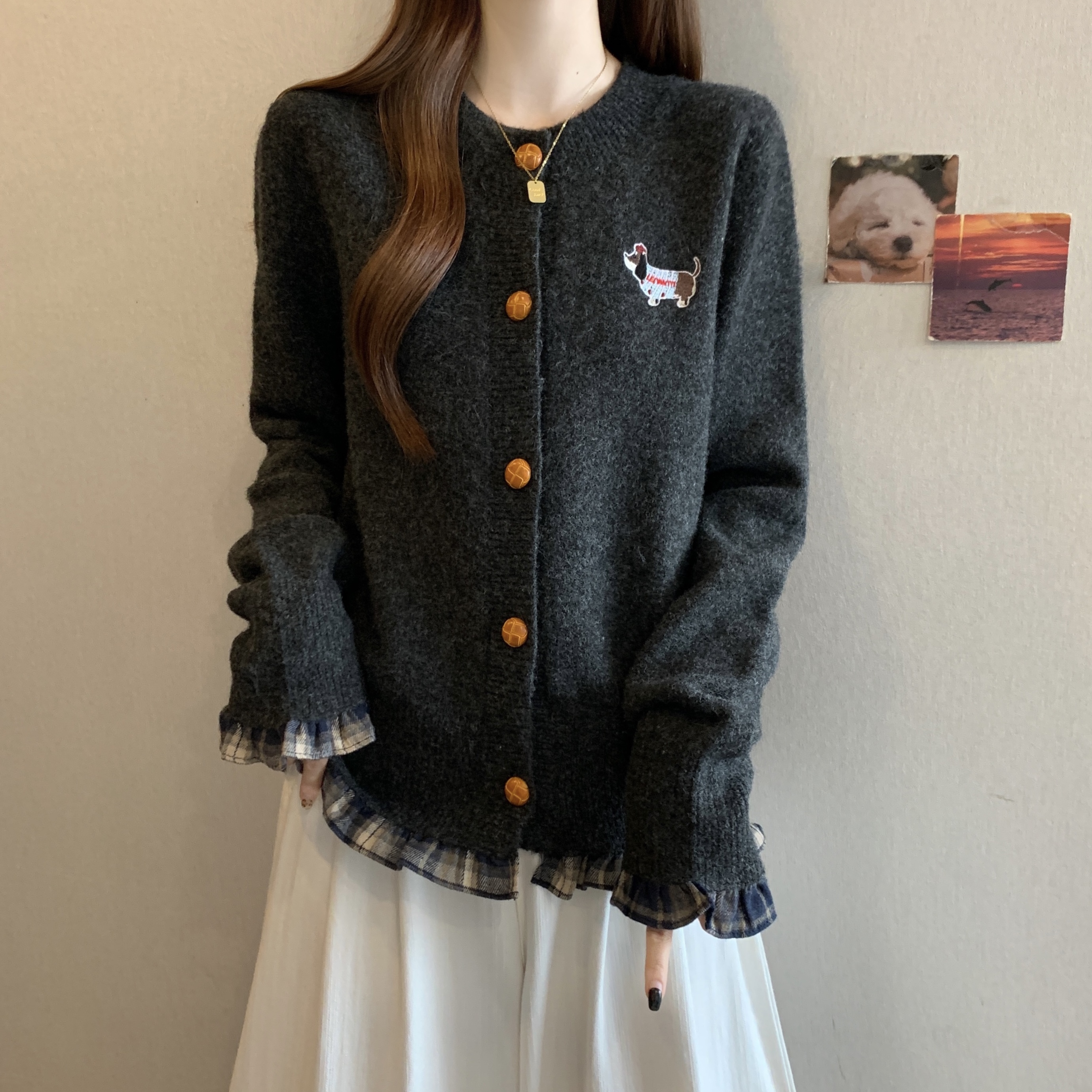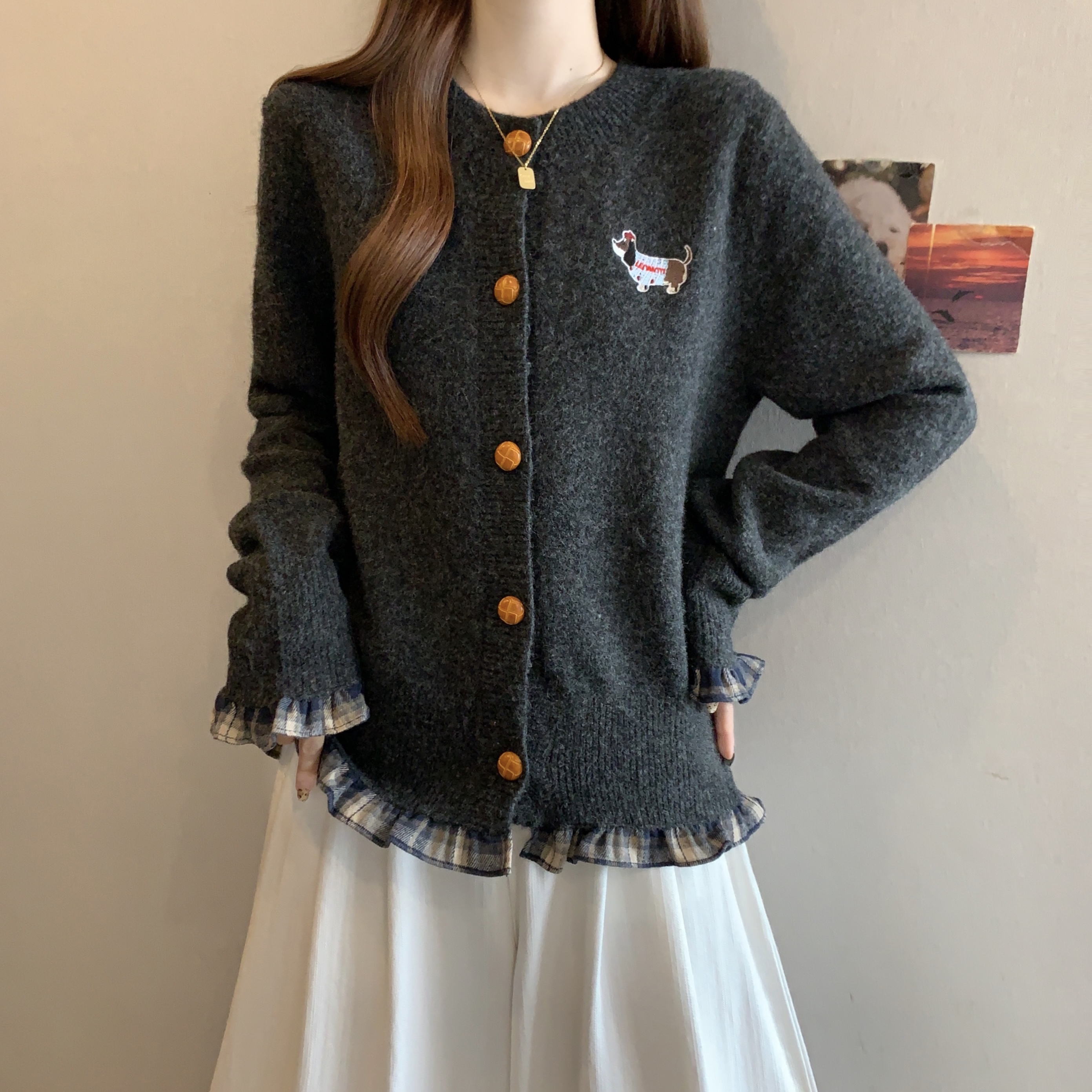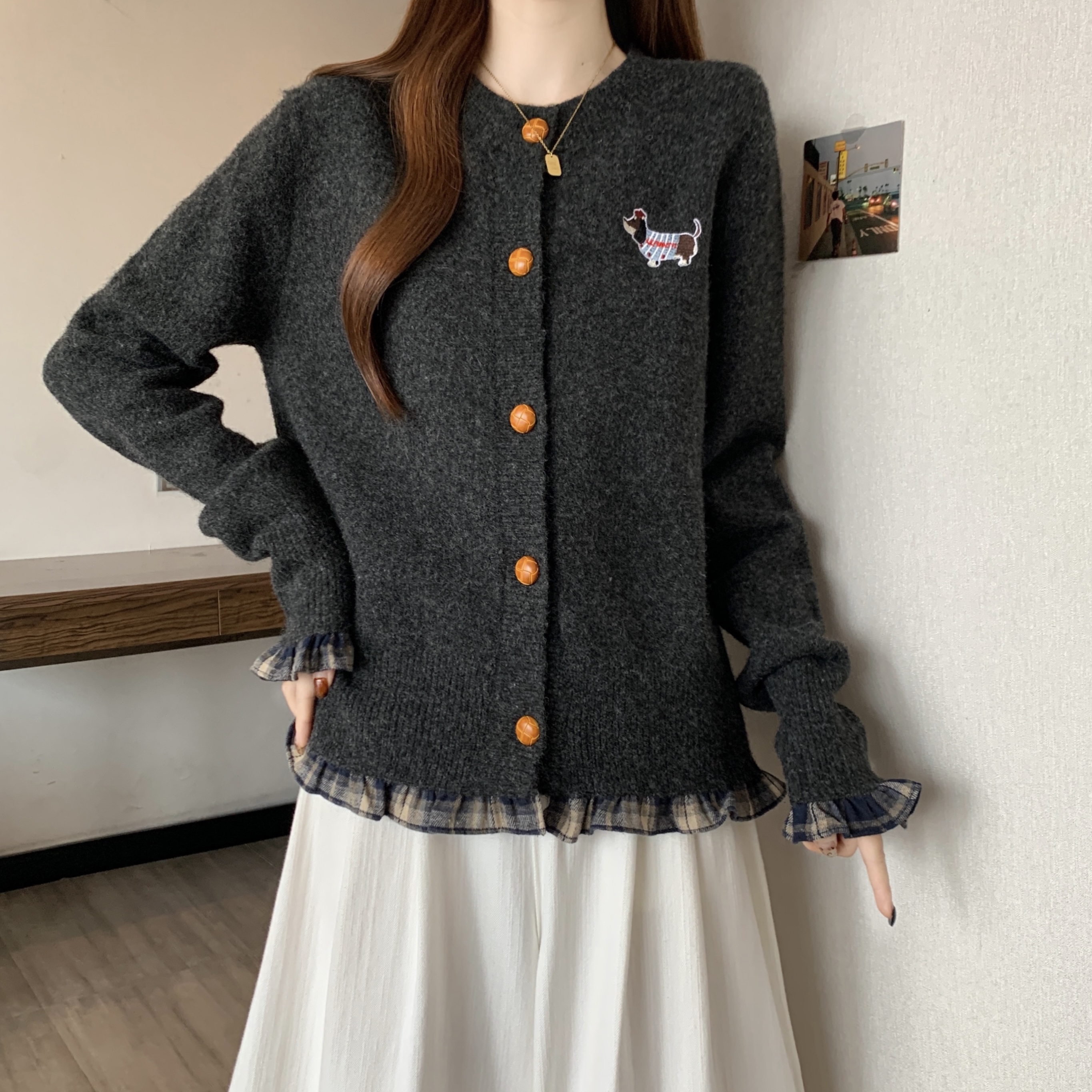 FA48404# 大码深灰色毛衣秋冬款格子荷叶边上衣胖mm显瘦遮肉针织开衫 服裝批發女裝批發服飾貨源