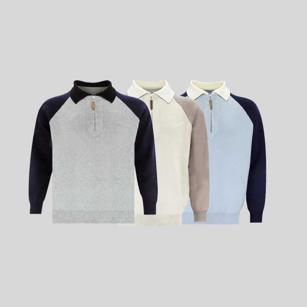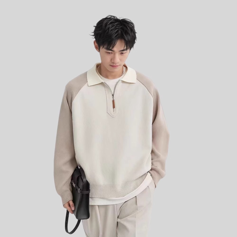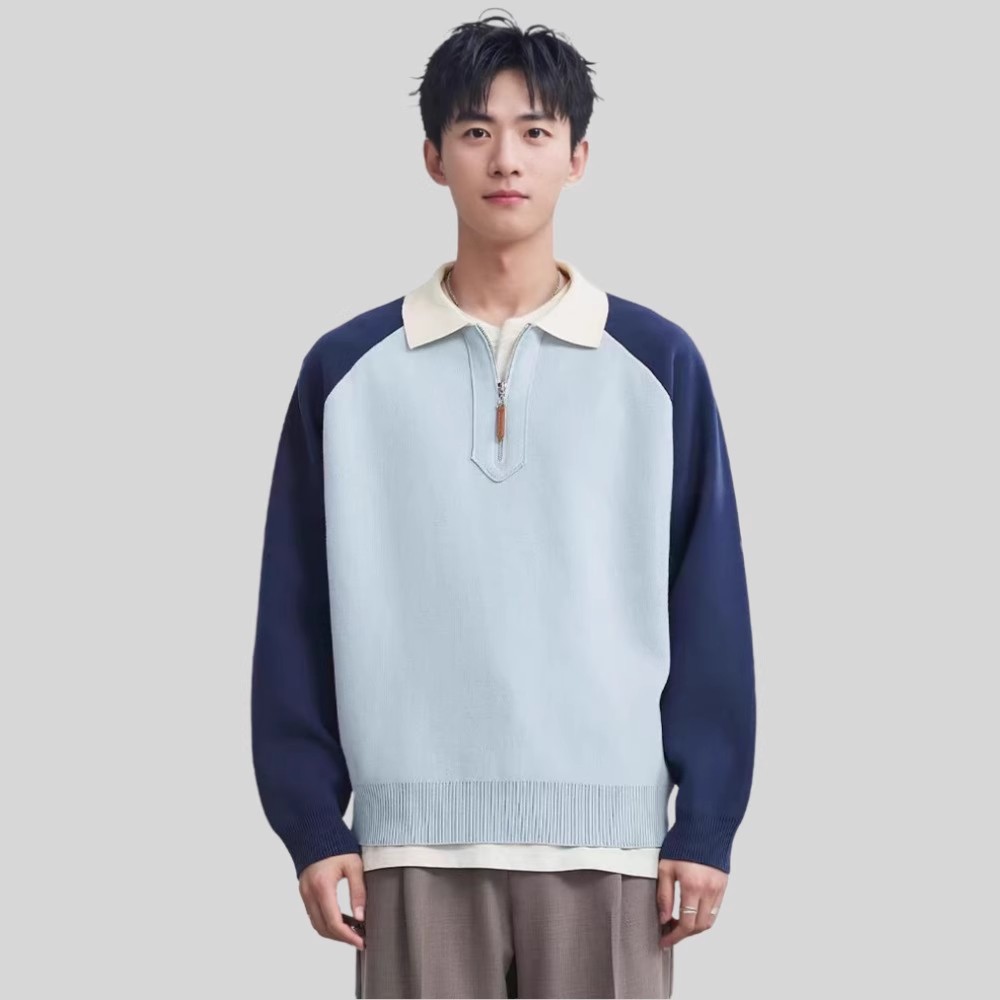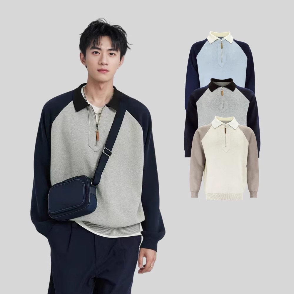 Home > 时尚外套---男装 > 高级感拼接Polo领毛衣男宽松秋季新款针织衫上衣套头卫衣外套男潮 男装批发