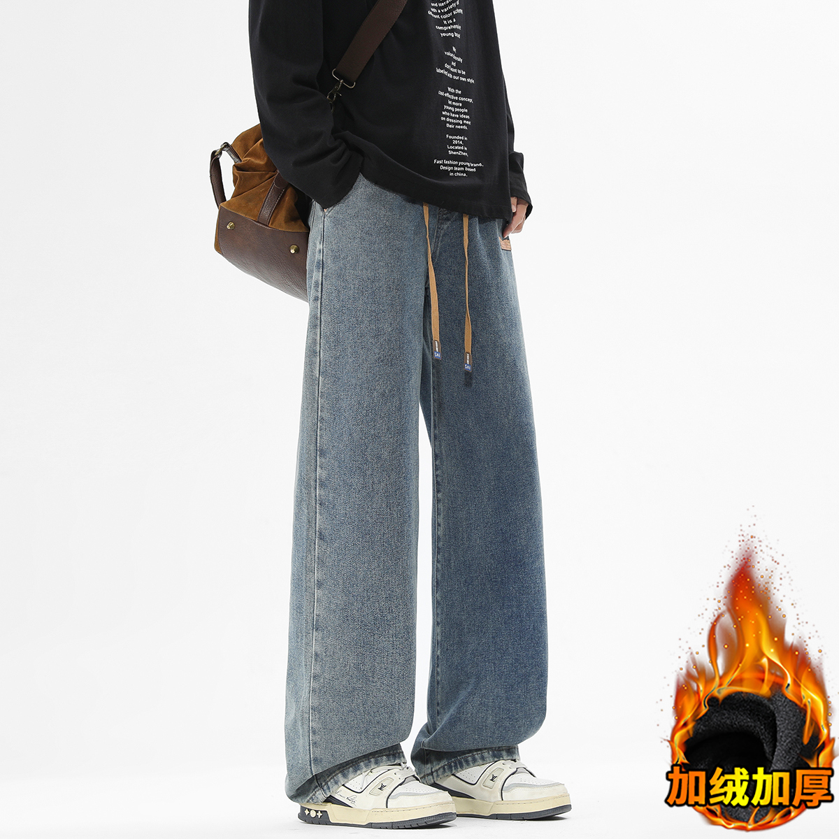 加绒美式牛仔裤男士春夏季新款垂感宽松复古直筒休闲潮牌阔腿长裤子 男装批发