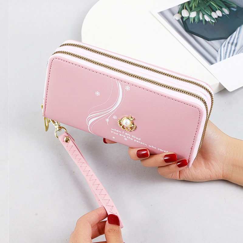 TJ2064# 双层拉链长款钱包女新款大容量手腕手拿包珍珠印花手机包