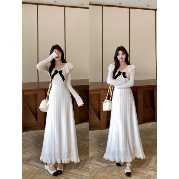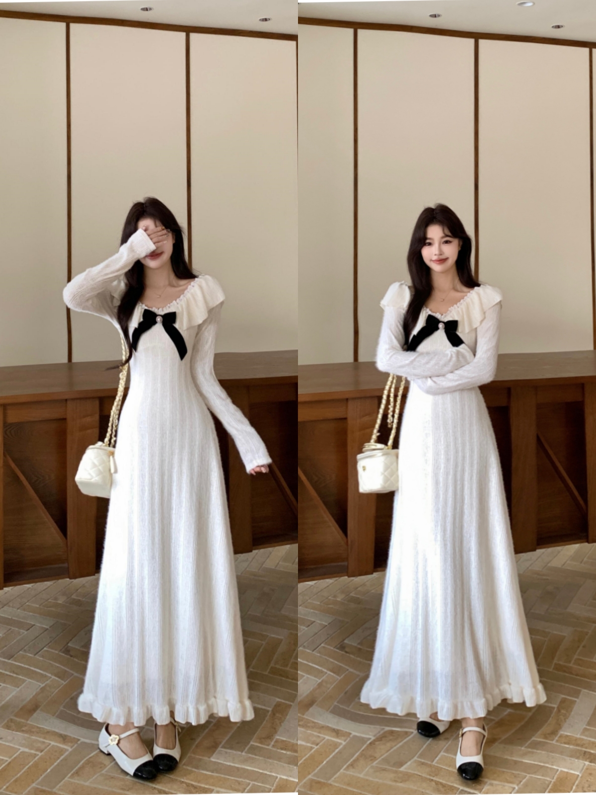 FA48827# 加绒千金感温柔气质蝴蝶结收腰连衣裙加绒显瘦内搭中长裙 服裝批發女裝批發服飾貨源