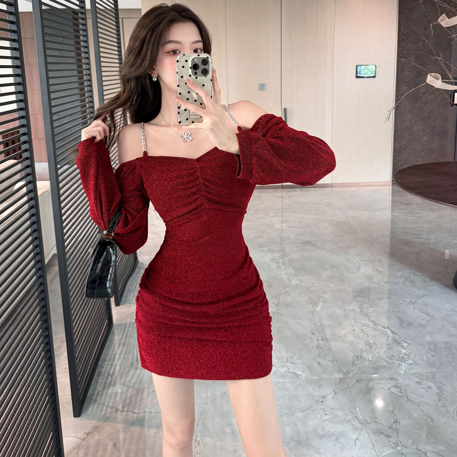 FA49052# 安可拉红色亮丝设计感链条吊带露肩长袖连衣裙初秋辣妹短裙女 服裝批發女裝批發服飾貨源