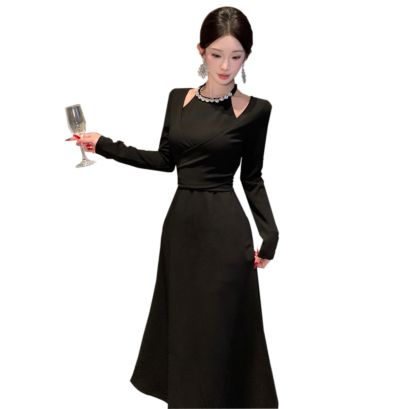 FA49056# 法式假两件钉钻长袖连衣裙秋冬内搭气质收腰修身包臀礼服长裙 服裝批發女裝批發服飾貨源