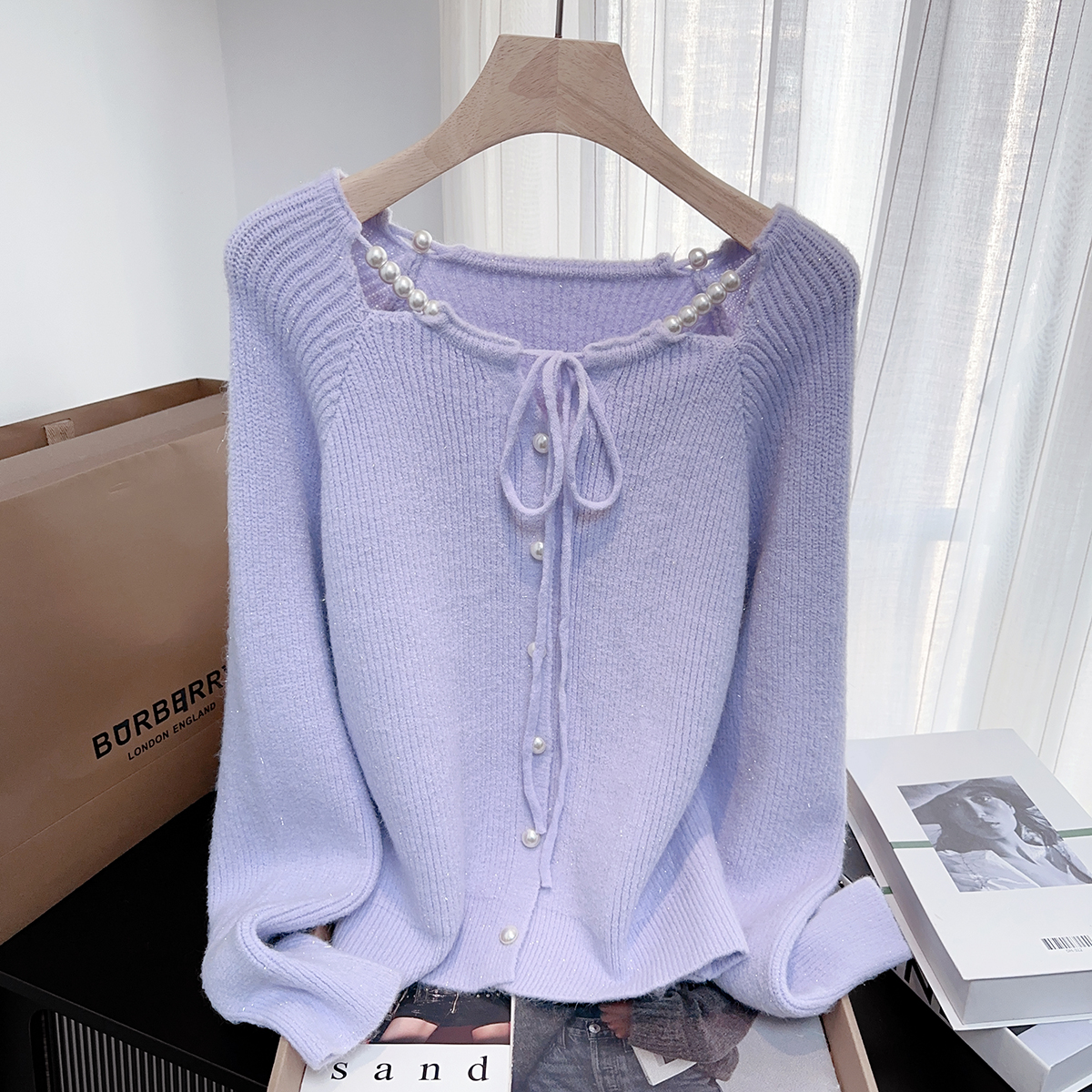 FA49524# 小香风设计感珍珠蝴蝶结金丝绒毛衣秋冬新款时尚百搭针织衫
