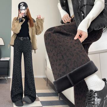 FA49601# 加绒加厚豹纹喇叭裤女冬季高腰中古百搭修身显瘦微喇裤送腰带