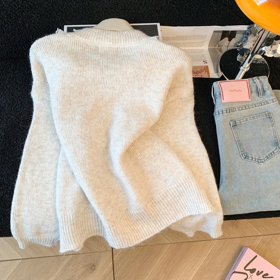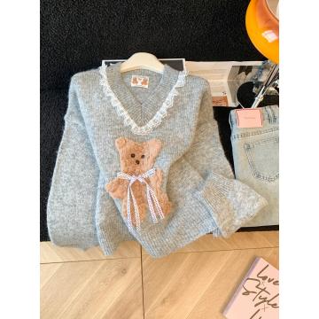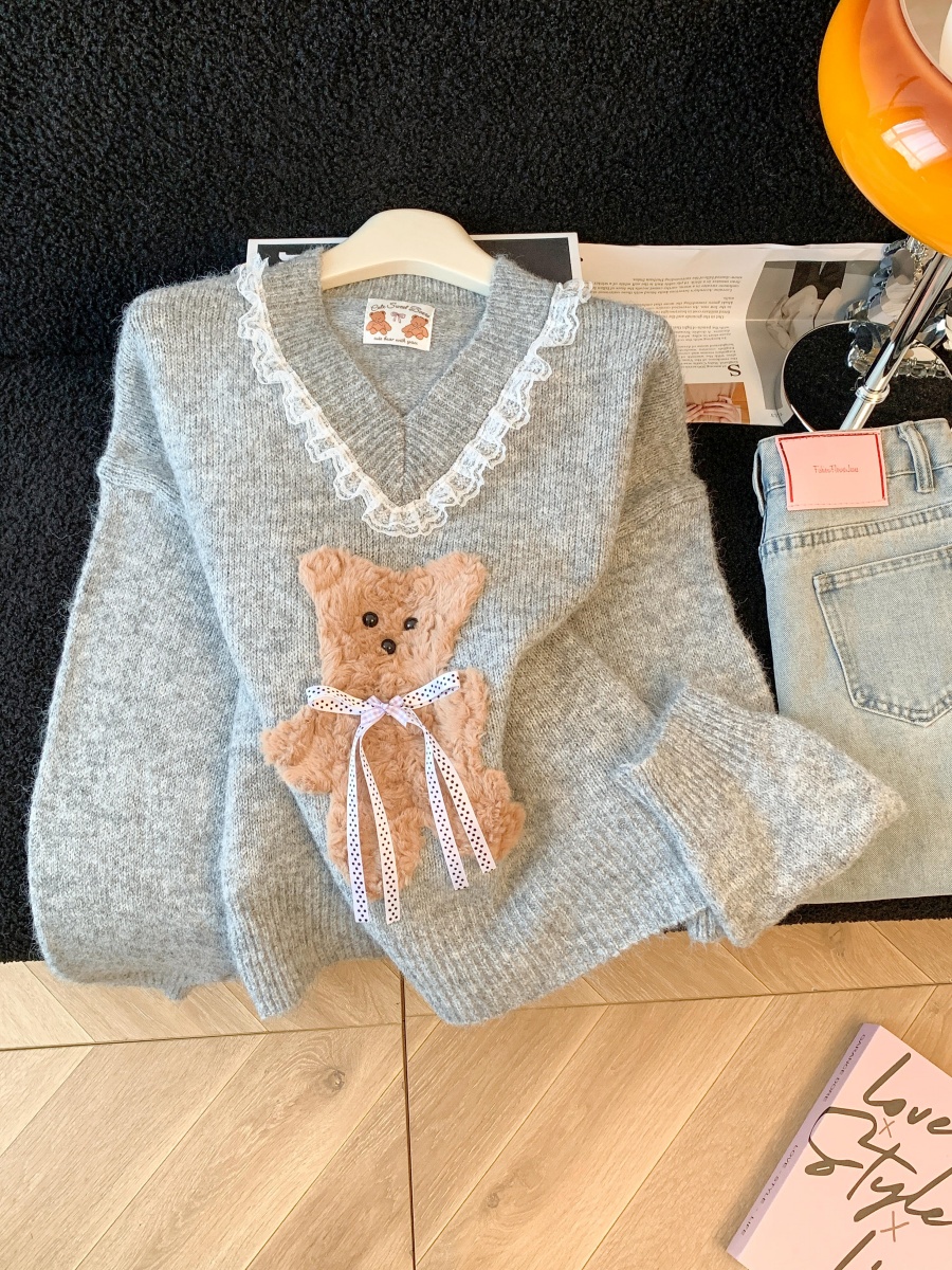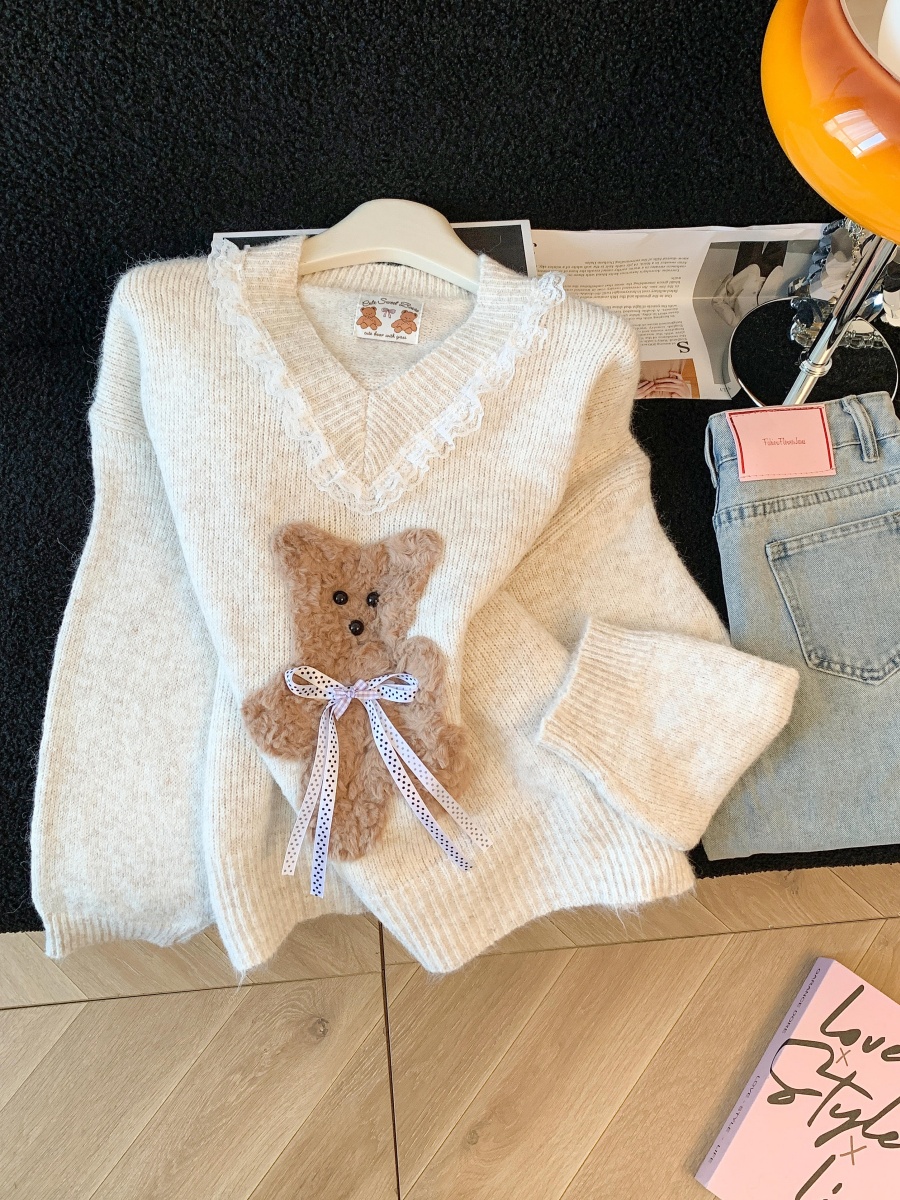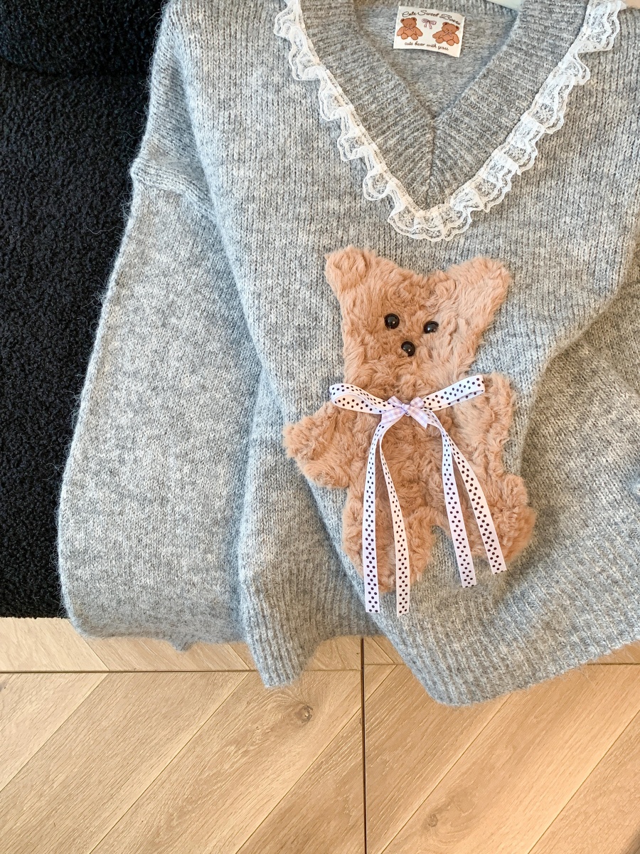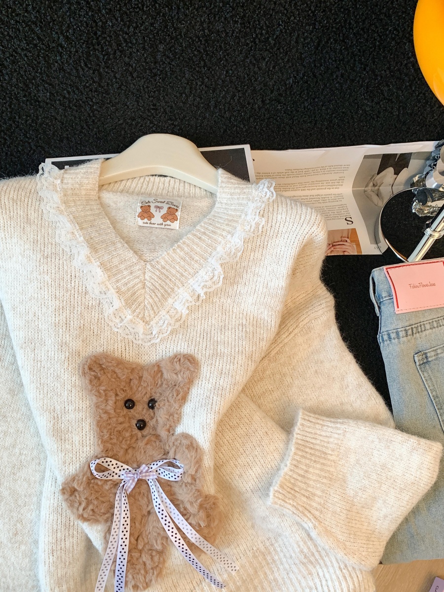 FA50083# 温柔风软糯蝴蝶结小熊毛衣女秋冬新款蕾丝花边针织衫气质上衣 服裝批發女裝批發服飾貨源
