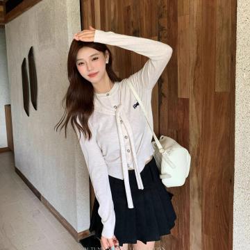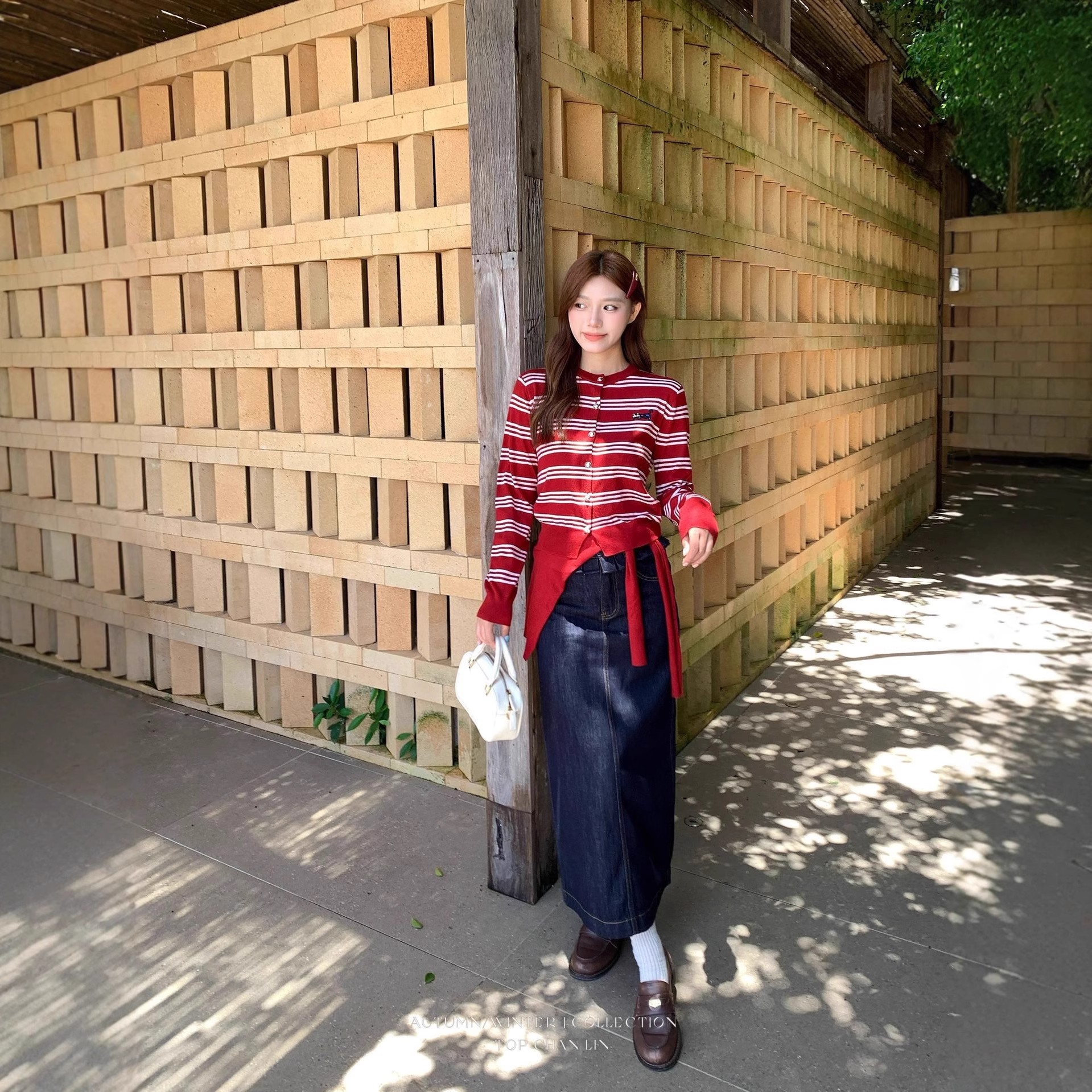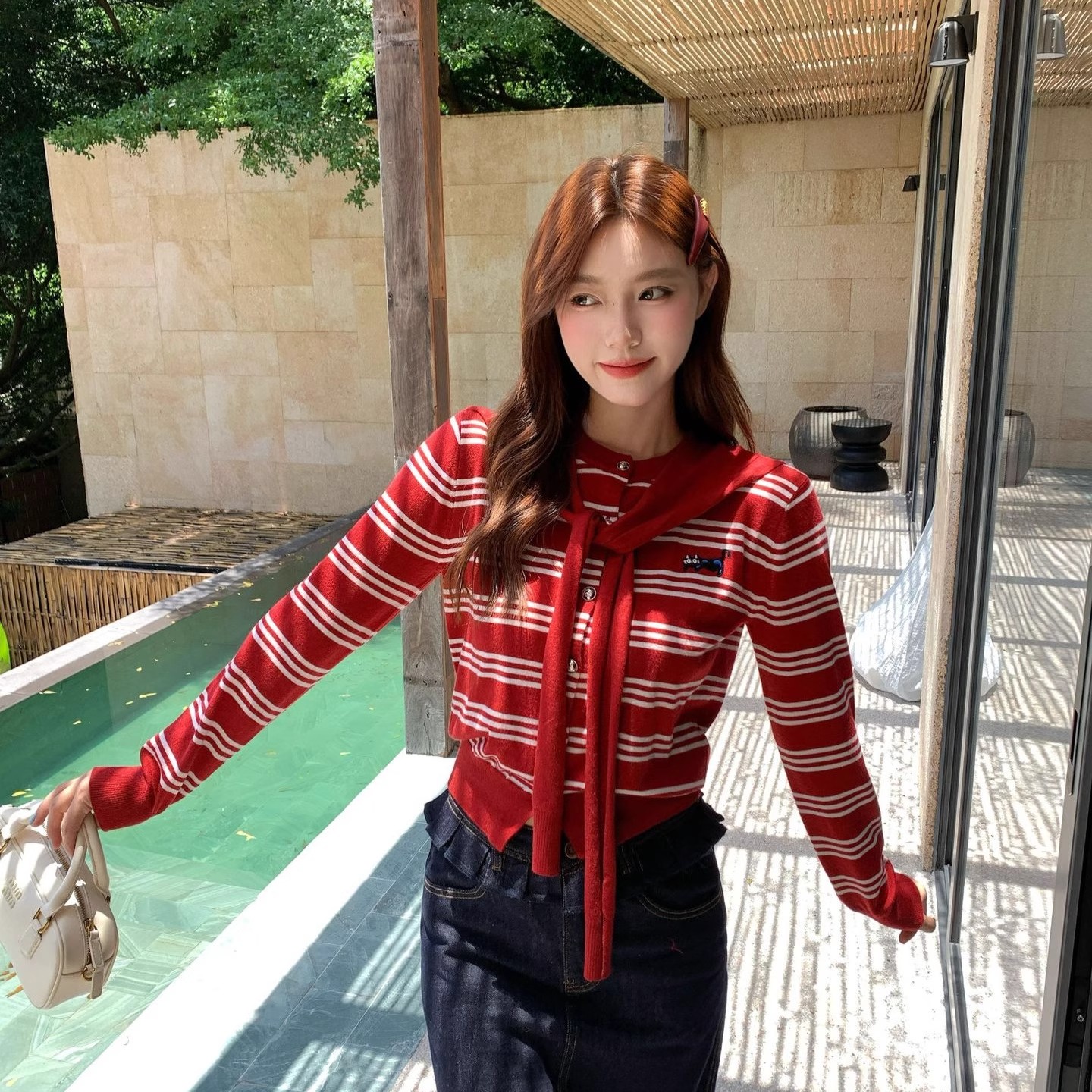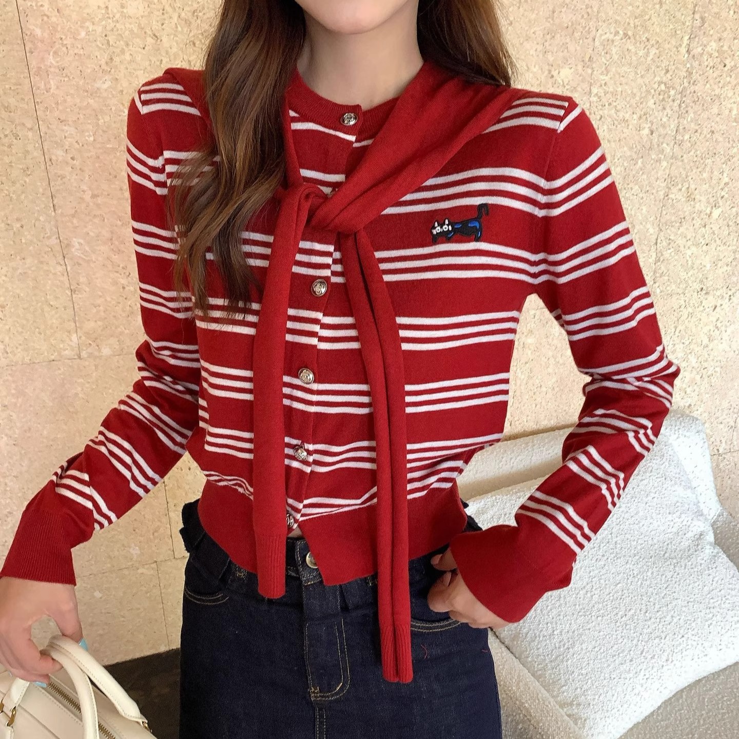 FA50115# 秋韩系圆领条纹小狗刺绣小众修身披肩针织开衫女 服裝批發女裝批發服飾貨源