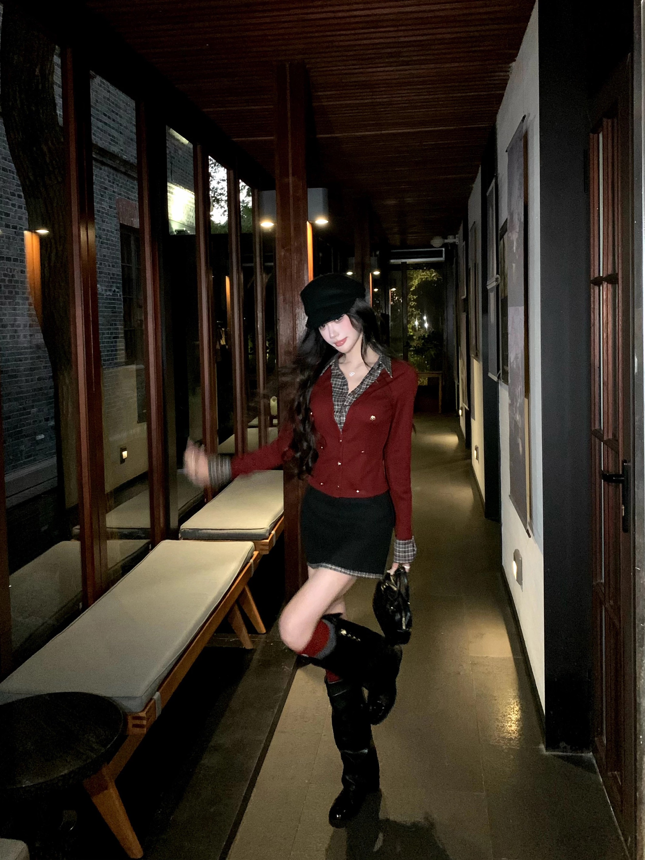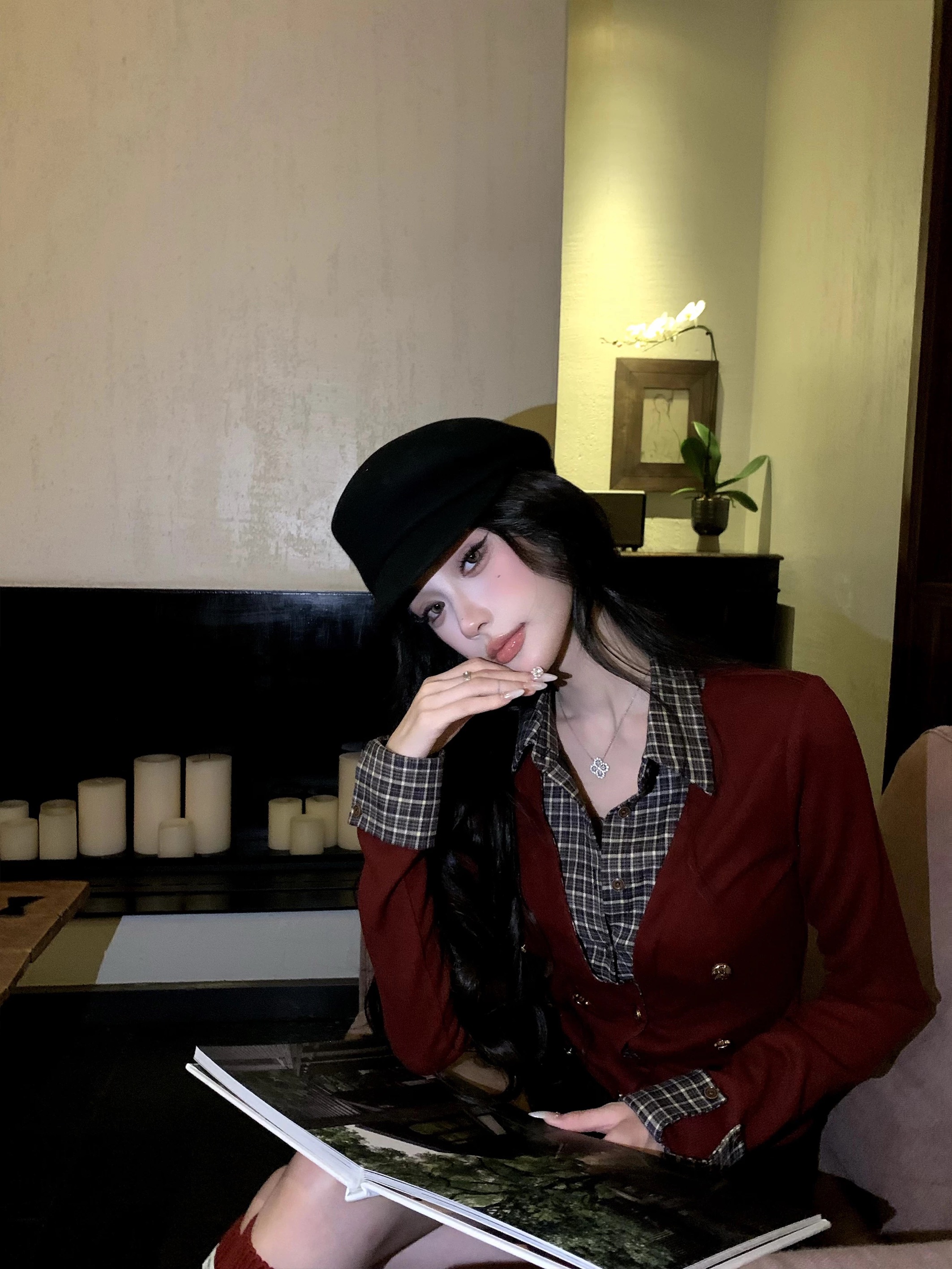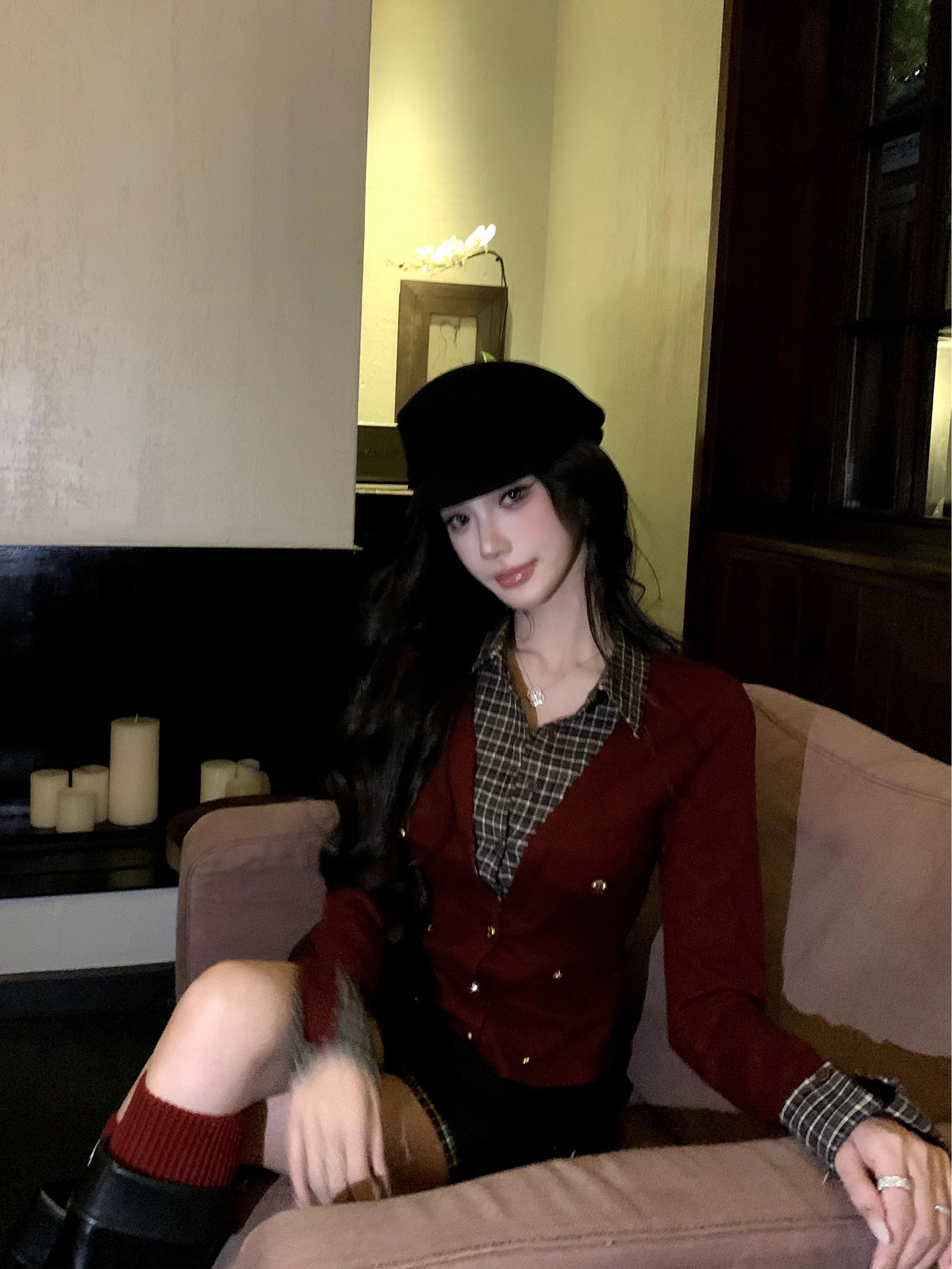 FA50116# 红色圣诞针织衫女冬季学院风假两件格纹拼接上衣 服裝批發女裝批發服飾貨源