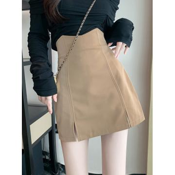 FA50140# 高级感短裙前开叉包臀A字女秋性感半身裙PU皮高腰裙 服裝批發女裝批發服飾貨源