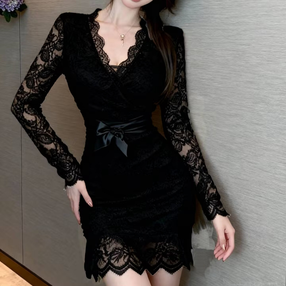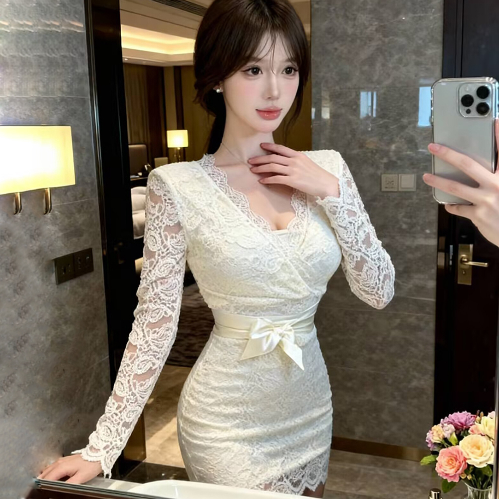 Home > 夜店裙、长袖连衣裙 > FA50395# 纯欲性感V领镂空蕾丝修身打底包臀短裙性感收腰长袖连衣裙 服裝批發女裝批發服飾貨源