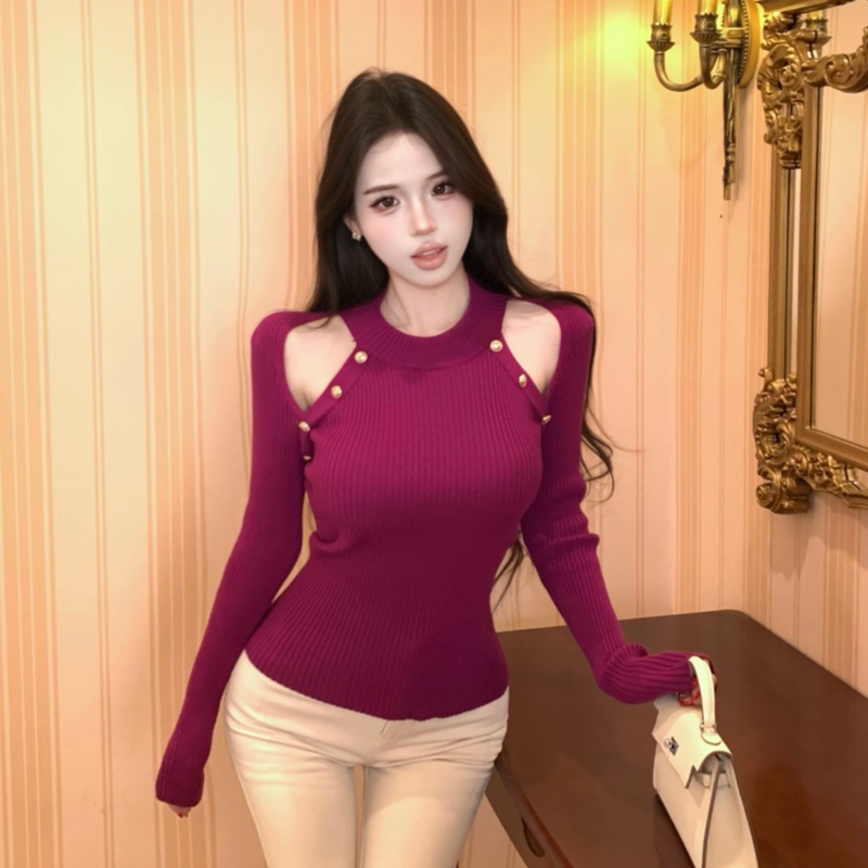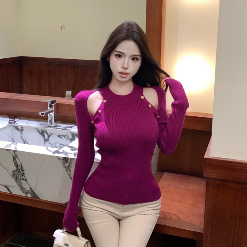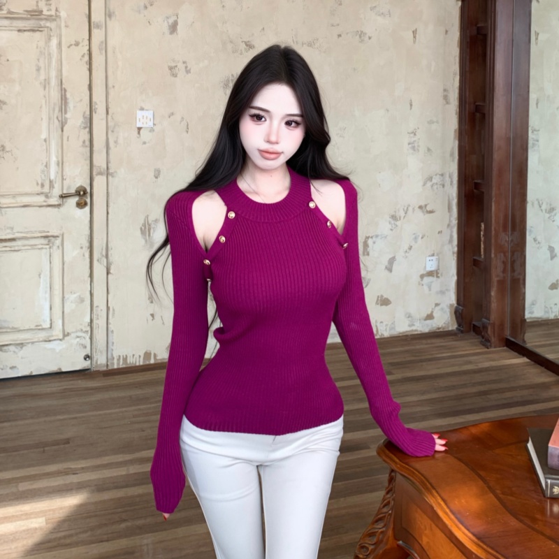 FA50400# 设计感紫色针织衫金属扣露肩半高领修身显瘦打底衫女 服裝批發女裝批發服飾貨源