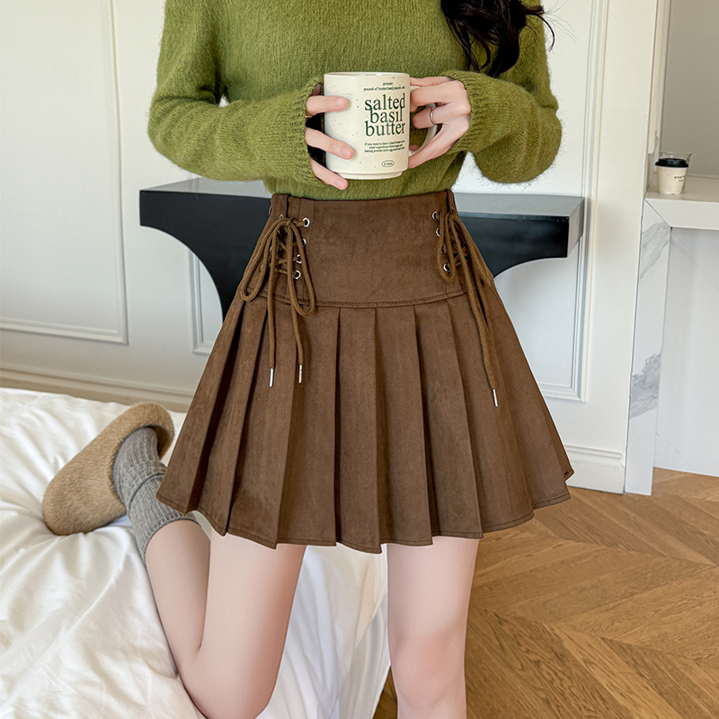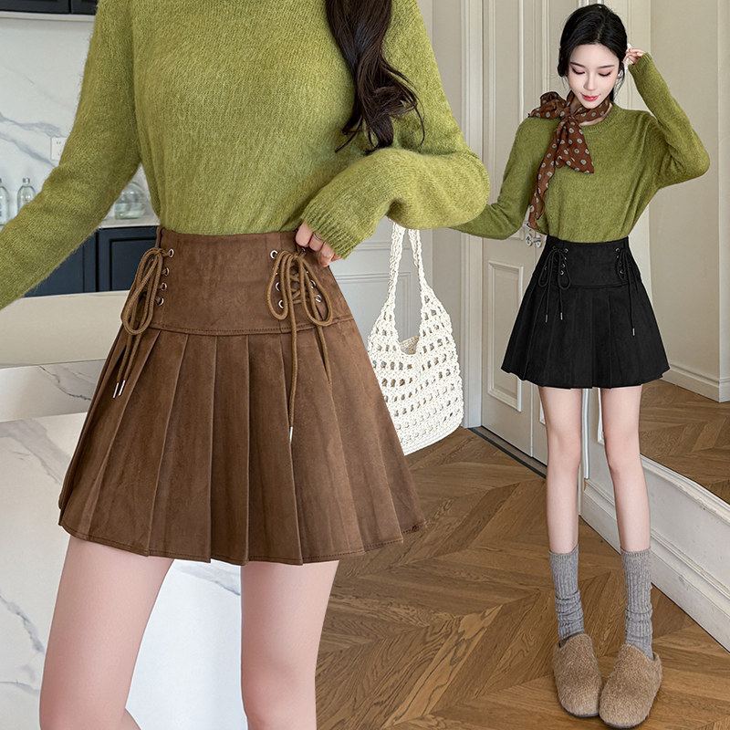 FA50404# 秋冬新款麂皮绒复古双边绑绳系带半身裙显瘦百褶裙小个子短裙 服裝批發女裝批發服飾貨源