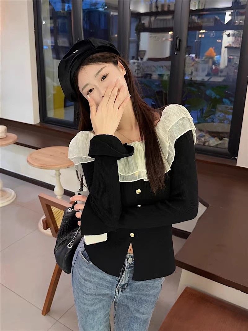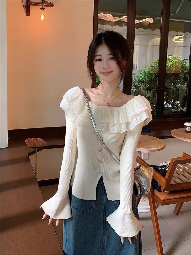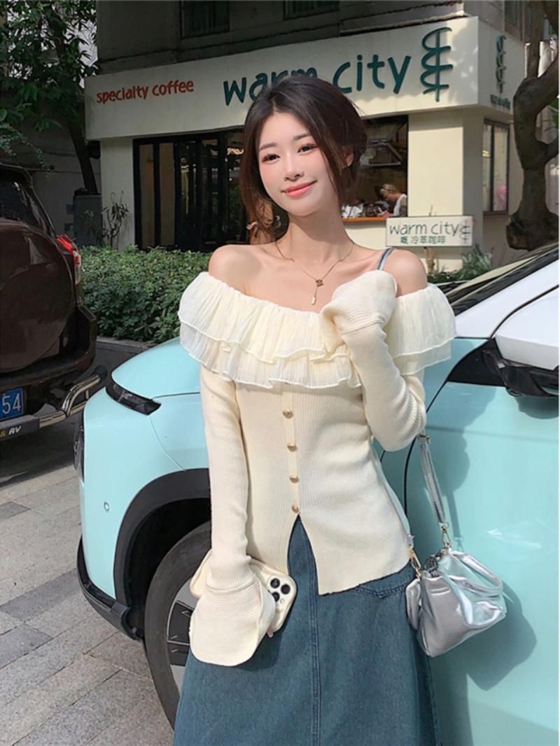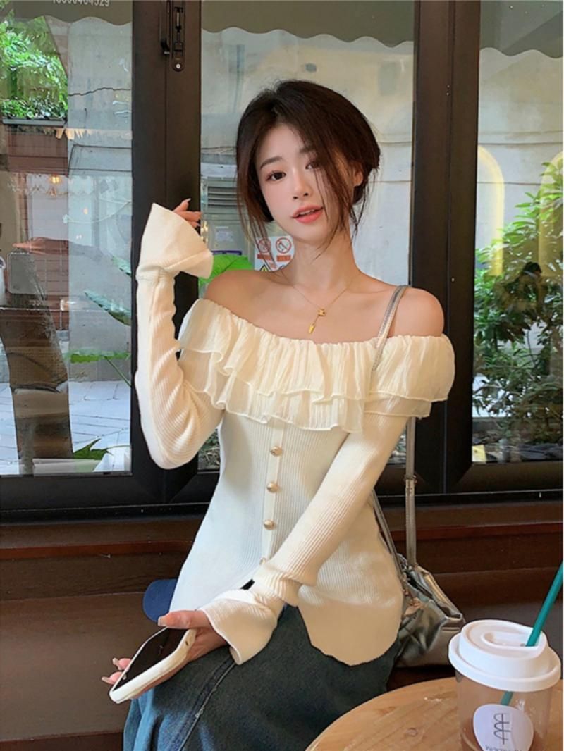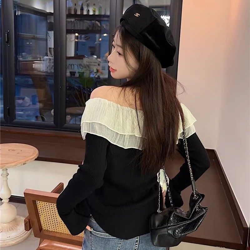 韩系纯欲辣妹一字肩长袖针织衫女早秋新款气质修身撞色上衣潮 服裝批發女裝批發服飾貨源