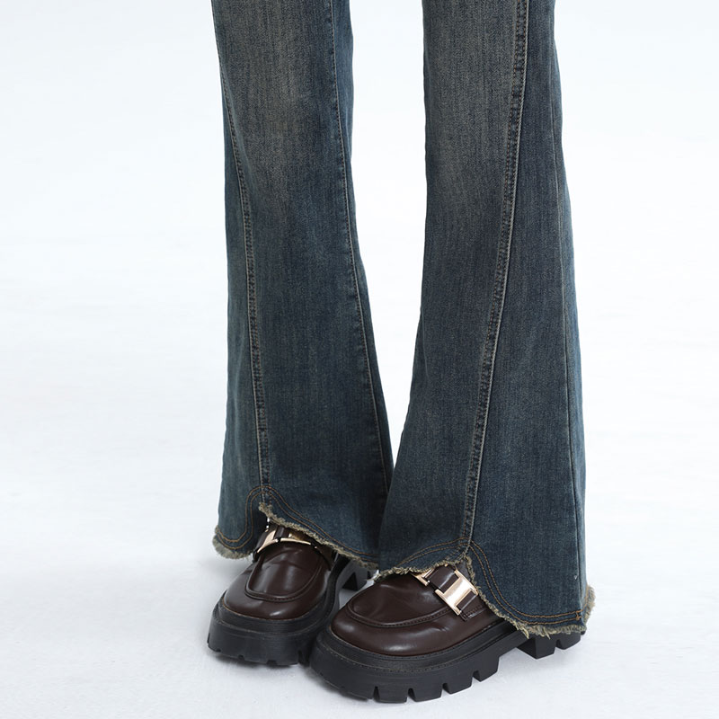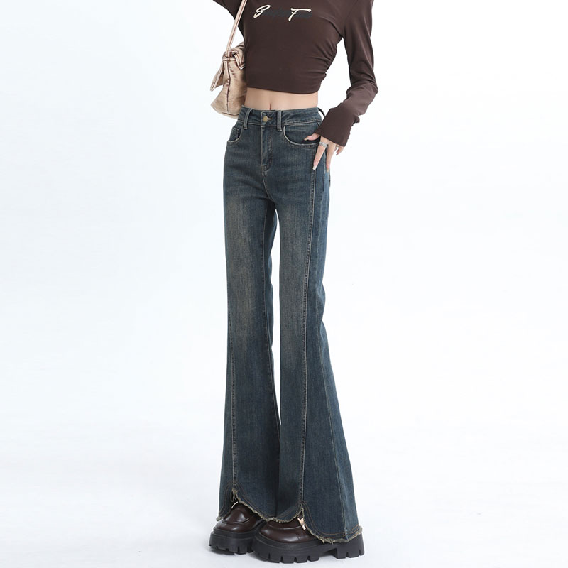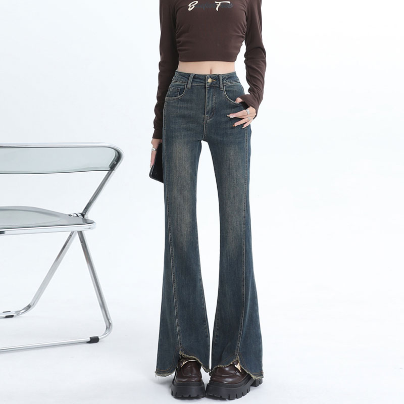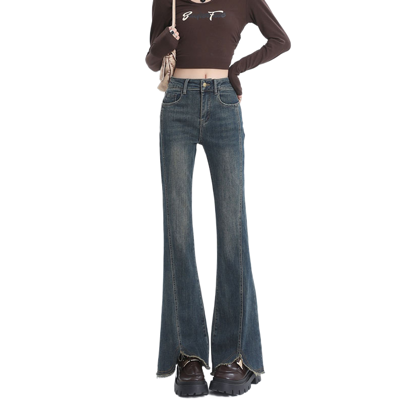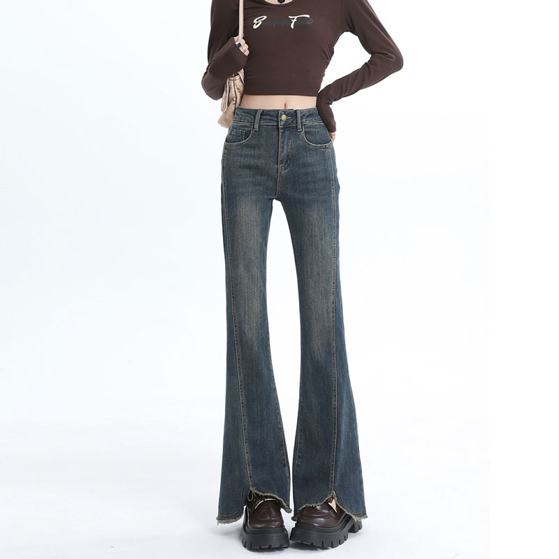 新款水泥灰毛边微喇牛仔裤女秋冬大码胖mm高腰显瘦百搭喇叭裤 服裝批發女裝批發服飾貨源