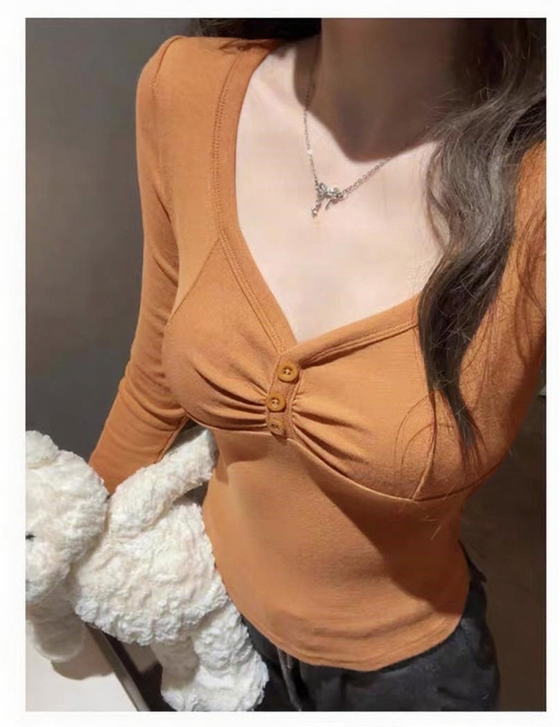 FA50510# V领扭扣长袖打底衫新款内搭t恤修身显瘦气质纯欲上衣 服裝批發女裝批發服飾貨源