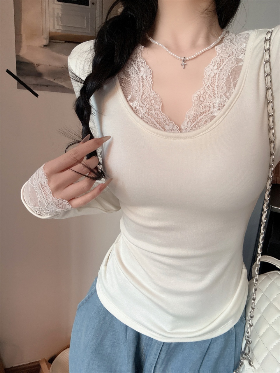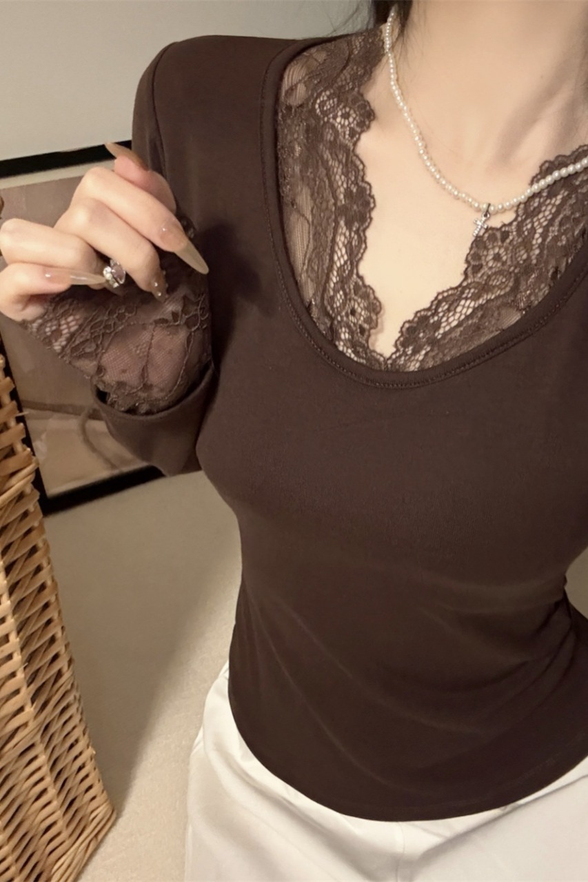 纯欲风蕾丝拼接V领长袖t恤新款性感辣妹打底衫内搭潮 服裝批發女裝批發服飾貨源