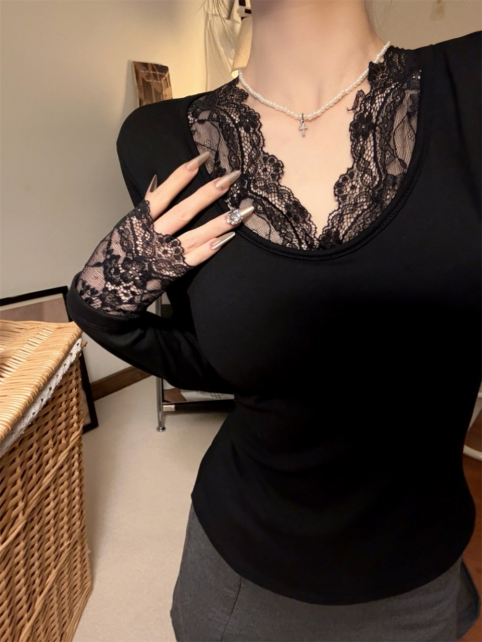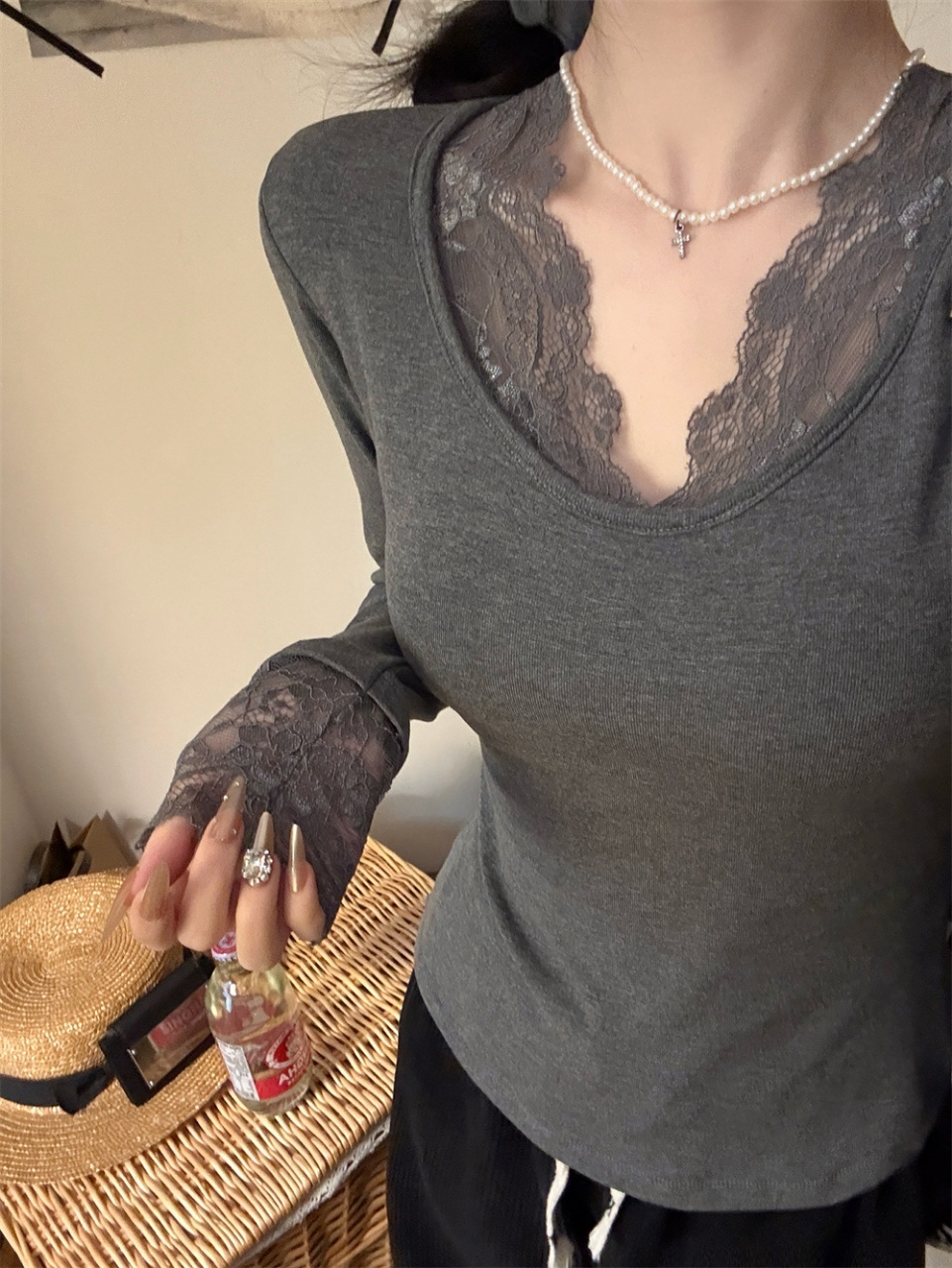 Home > 长袖T恤 > FA50511# 纯欲风蕾丝拼接V领长袖t恤新款性感辣妹打底衫内搭潮 服裝批發女裝批發服飾貨源