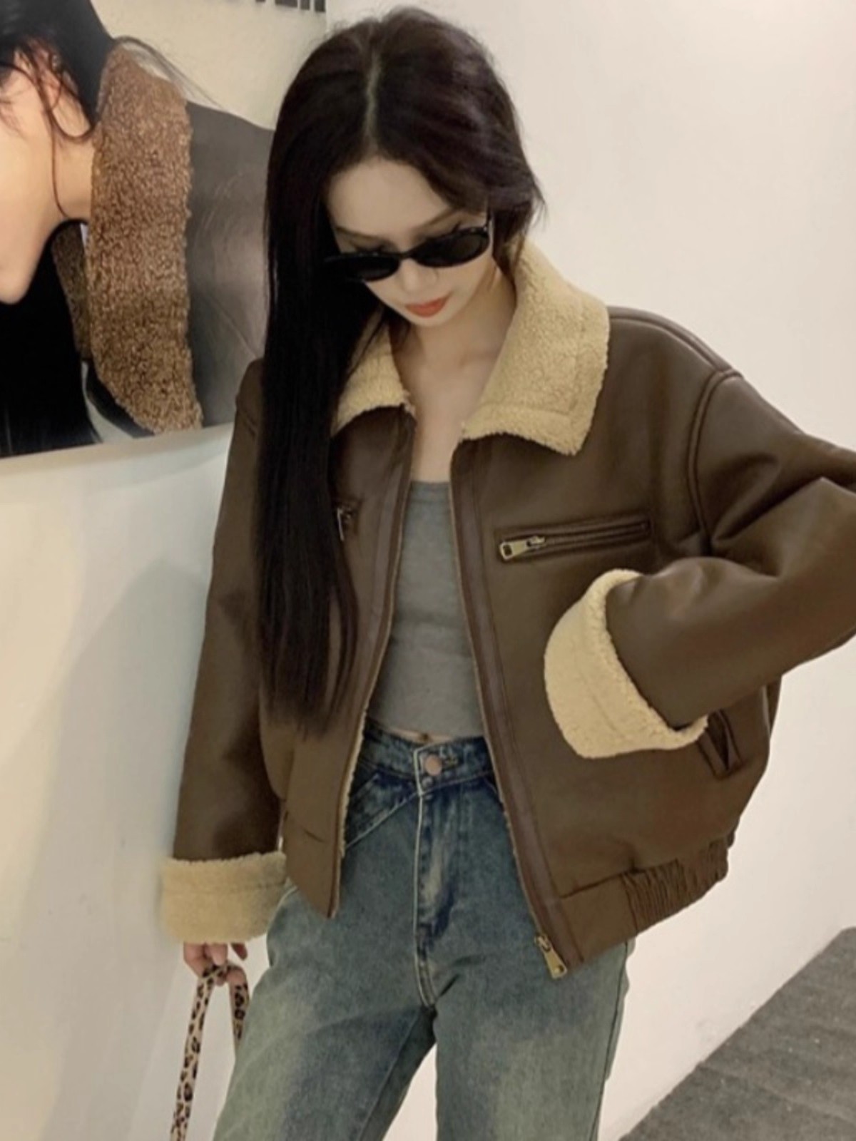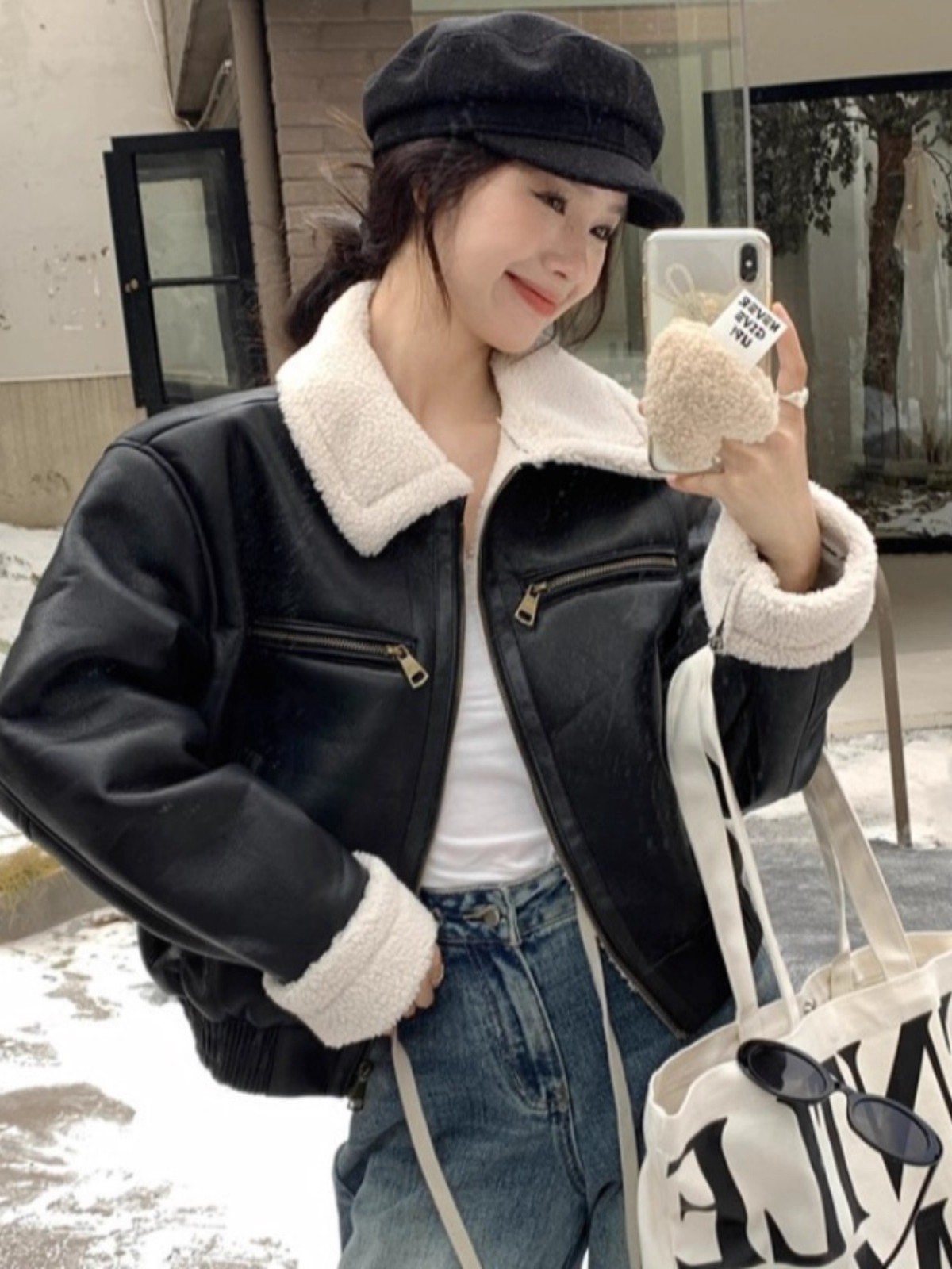 FA50516# 韩版宽松百搭美拉德加绒加厚羊羔毛剪绒皮毛一体pu皮外套机车服 服裝批發女裝批發服飾貨源