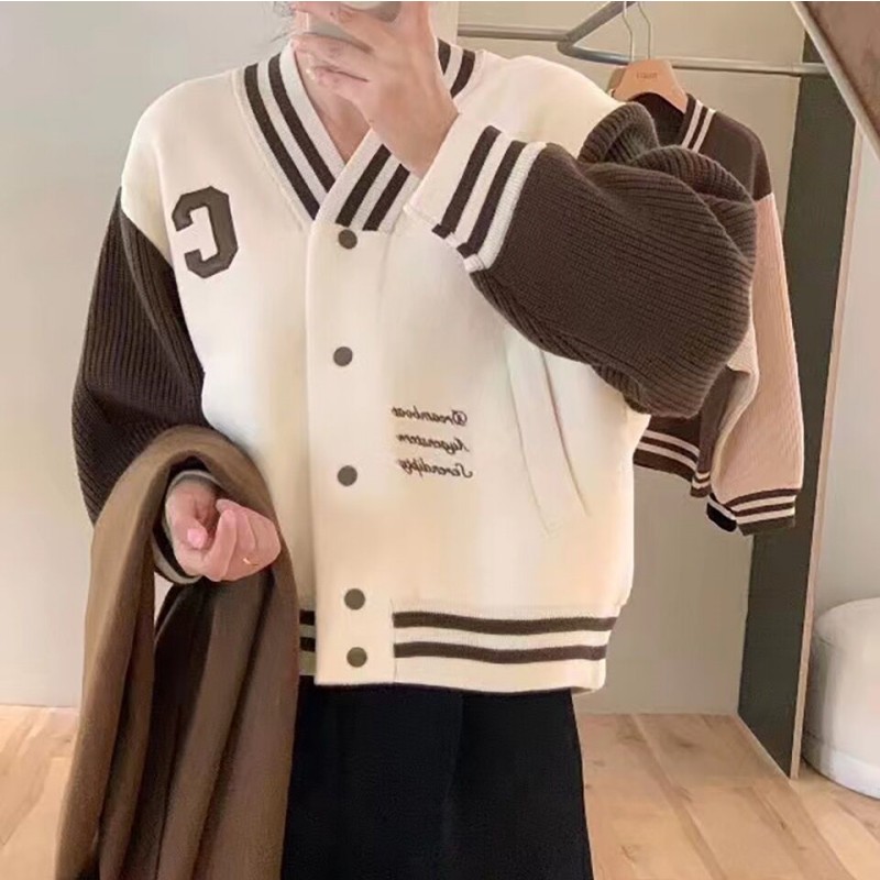 v领学院风洋气撞色字母棒球服针织毛呢外套女宽松短款潮冬加厚 服裝批發女裝批發服飾貨源