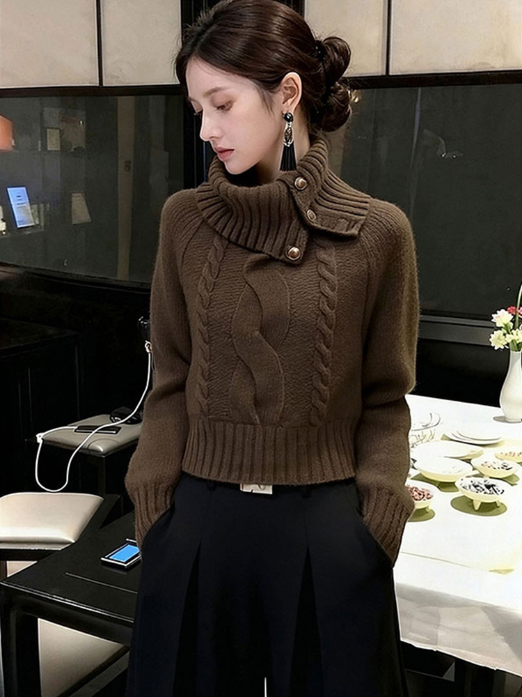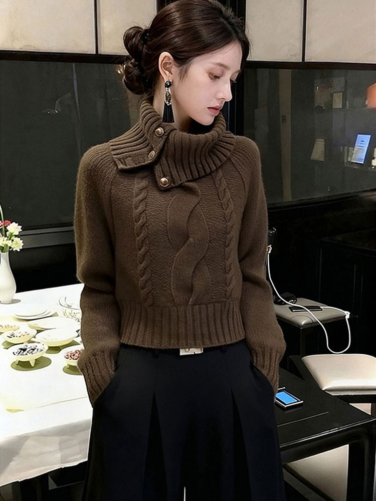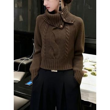 FA50764# 秋冬老钱风高领麻花针织衫女新款设计感咖色套头时尚气质毛衣