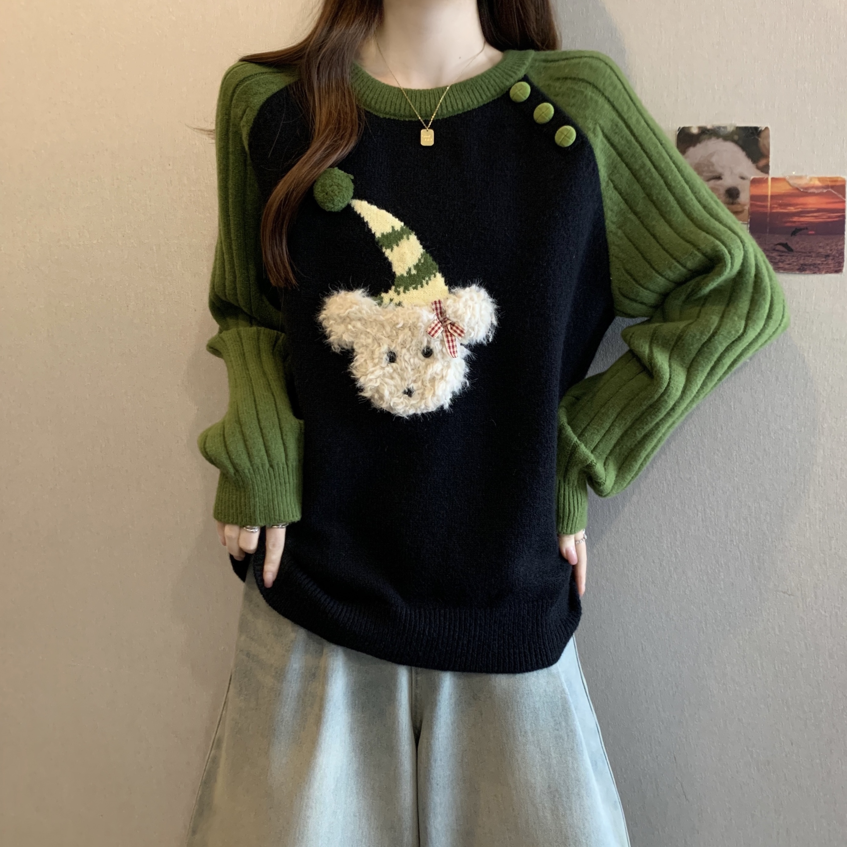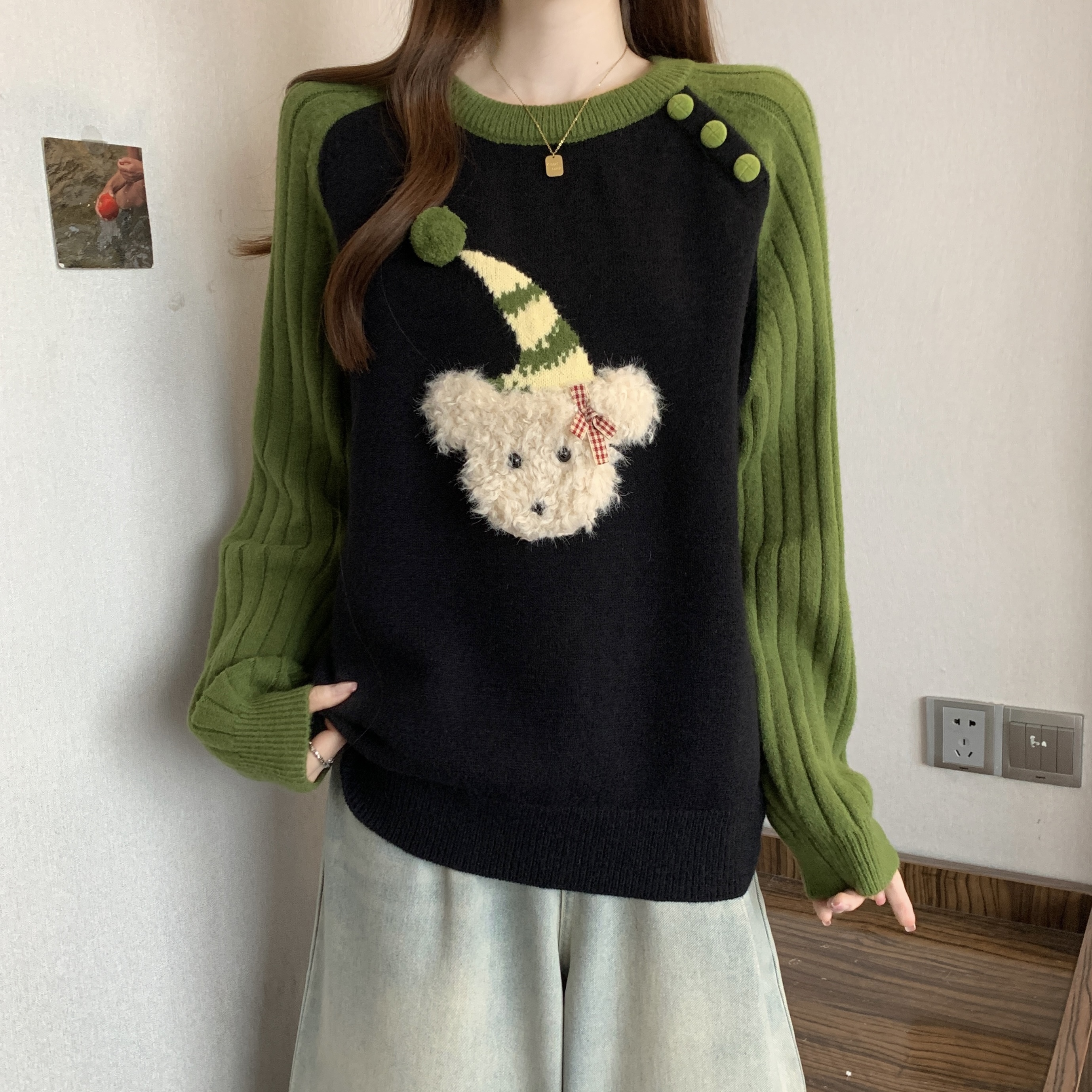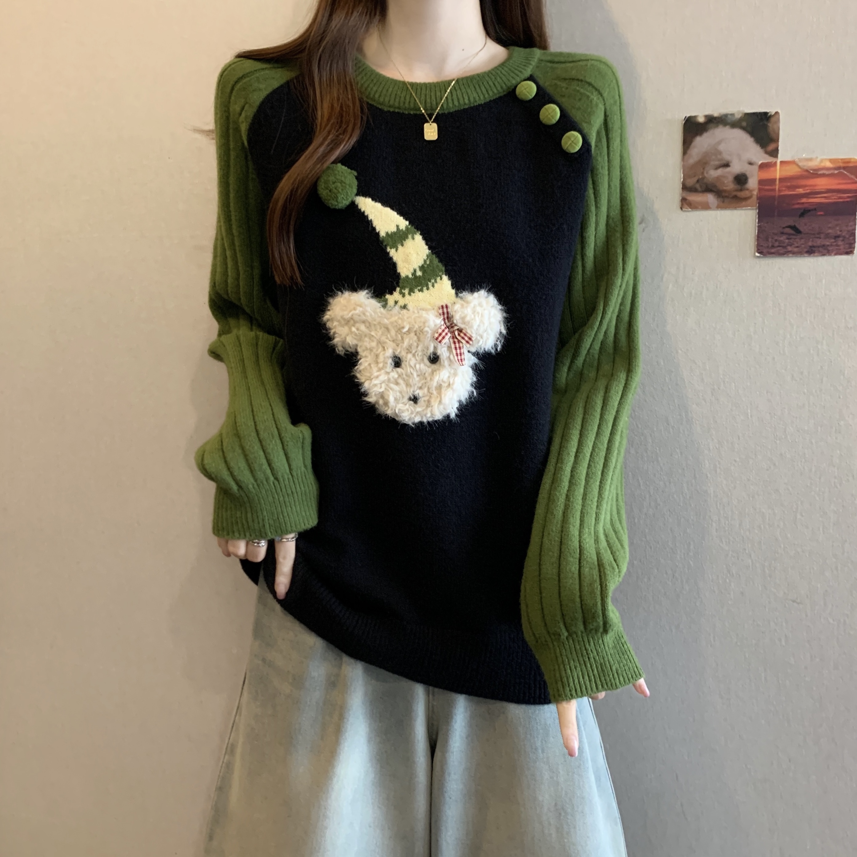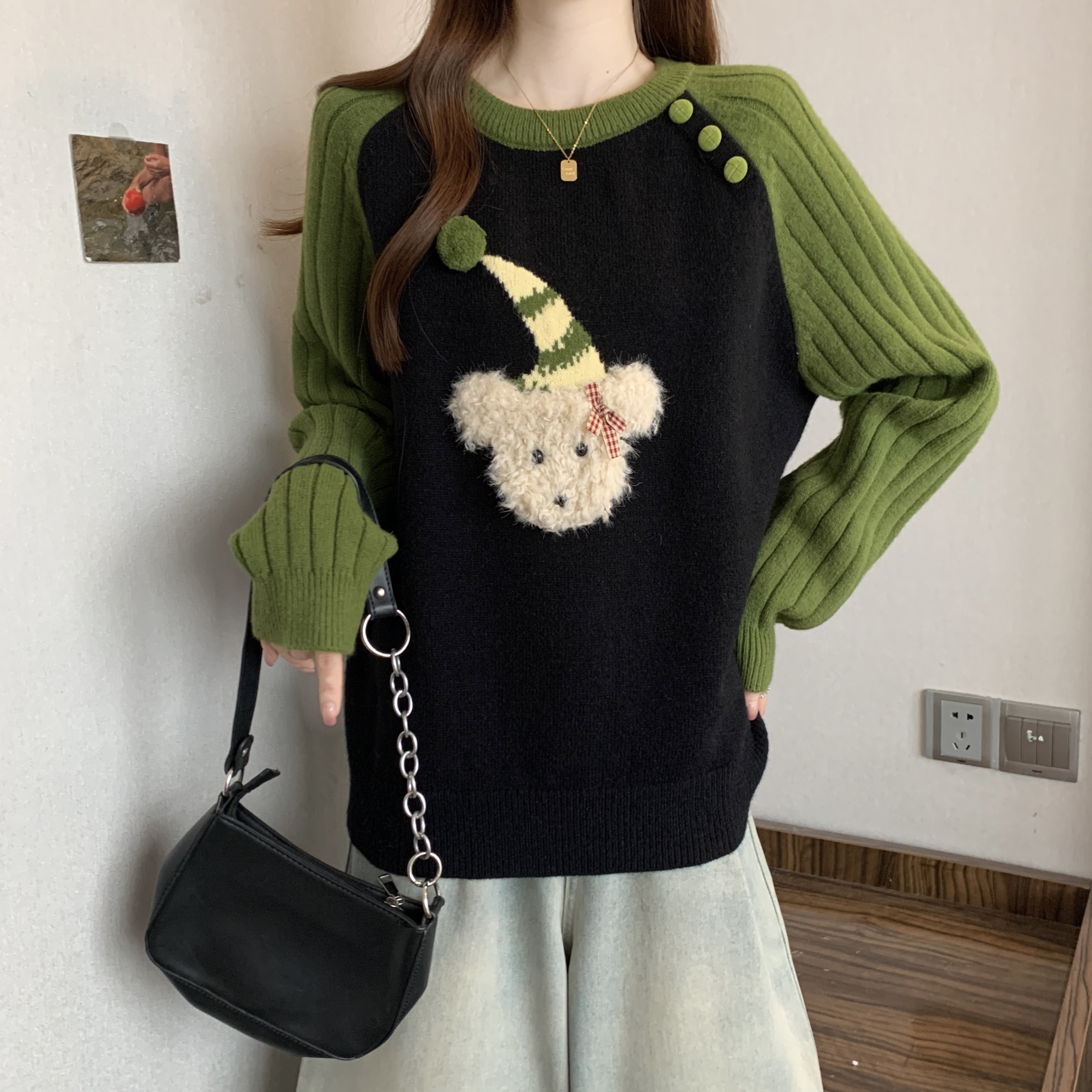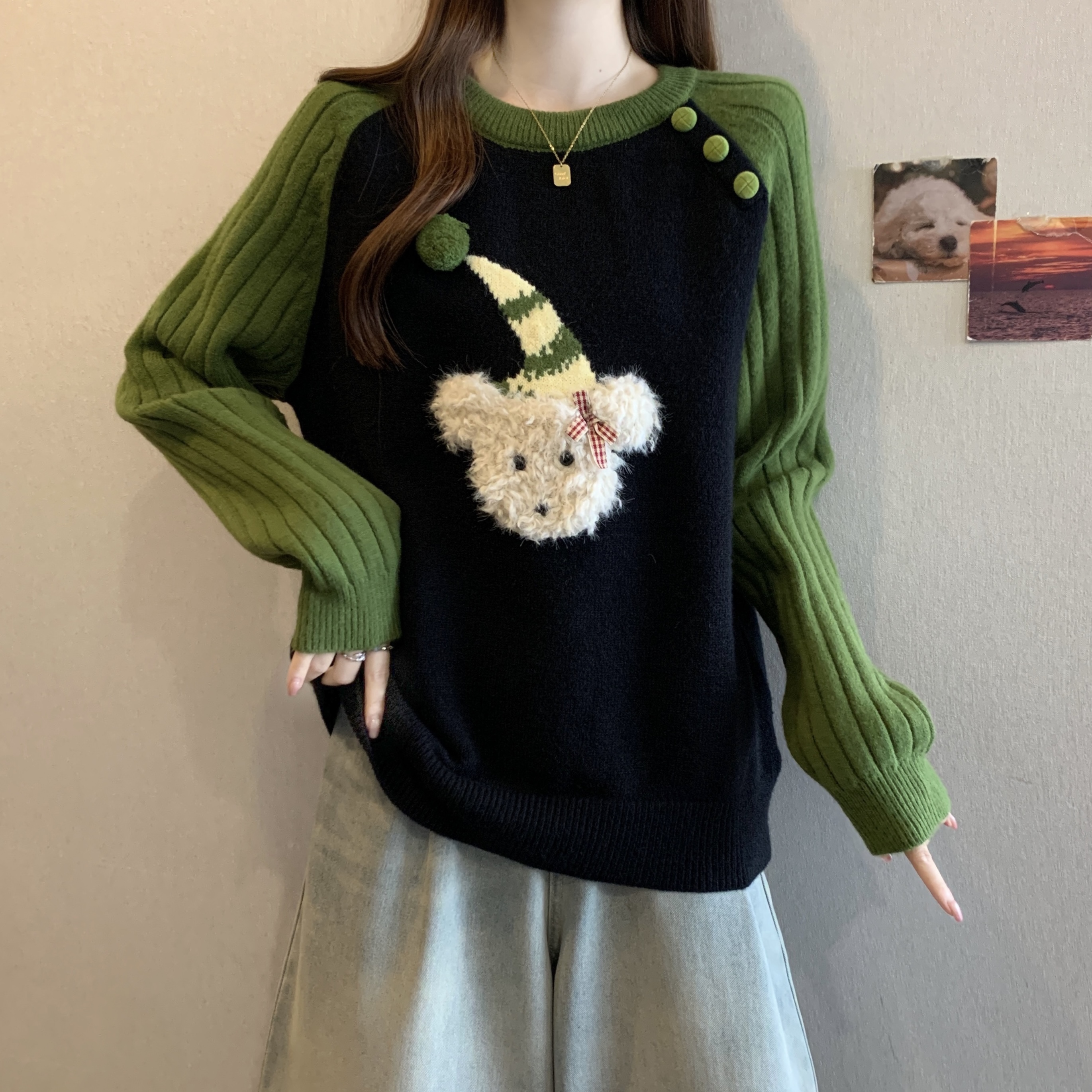 FA50867# 大码秋冬新款绿色慵懒风套头宽松毛衣胖mm减龄显瘦针织上衣 服裝批發女裝批發服飾貨源
