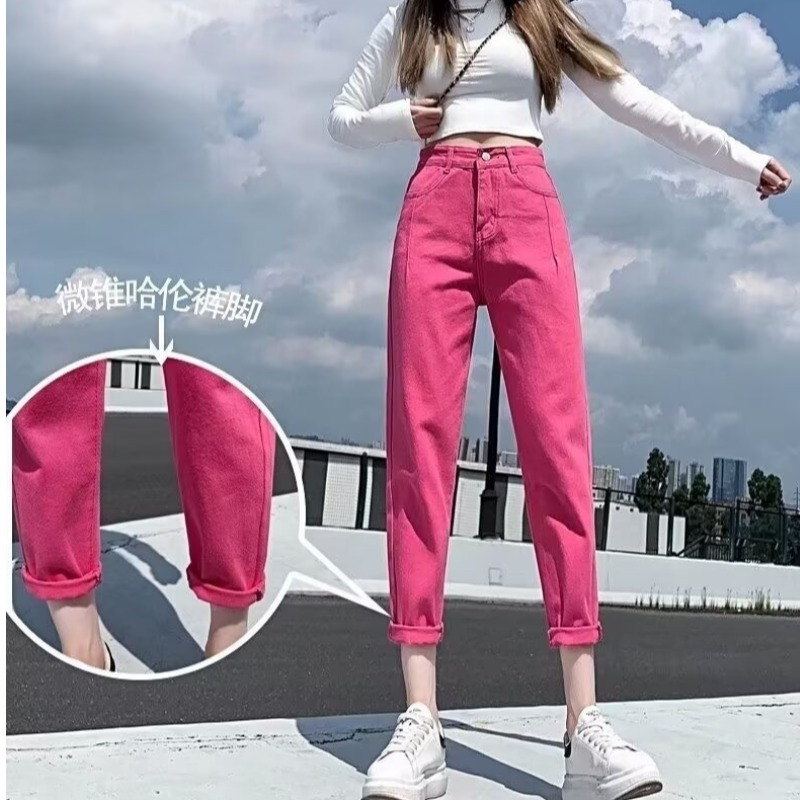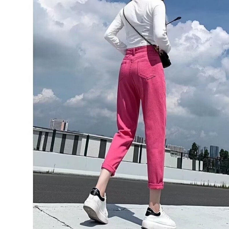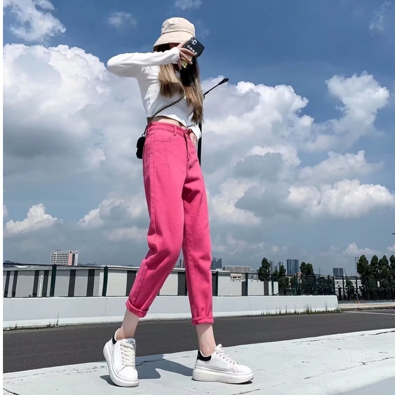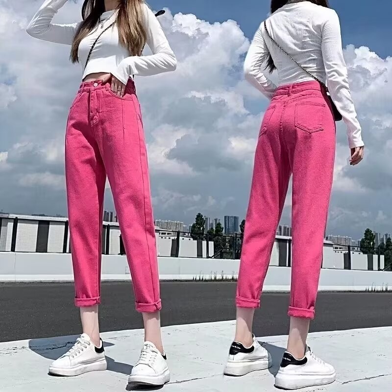 FA50923# 小众设计感牛仔裤女玫红色裤子大码胖mm辣妹宽松显瘦高腰九分裤潮 服裝批發女裝批發服飾貨源