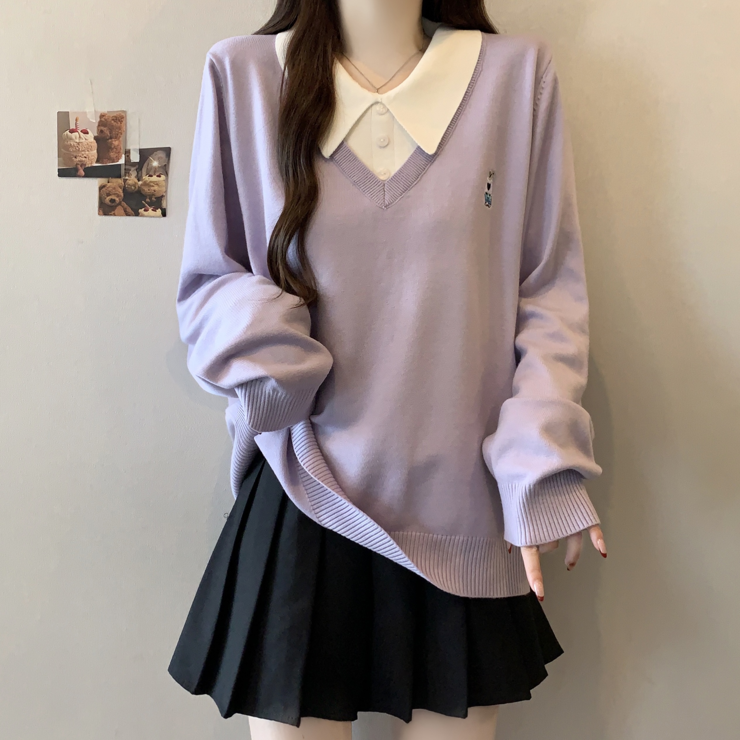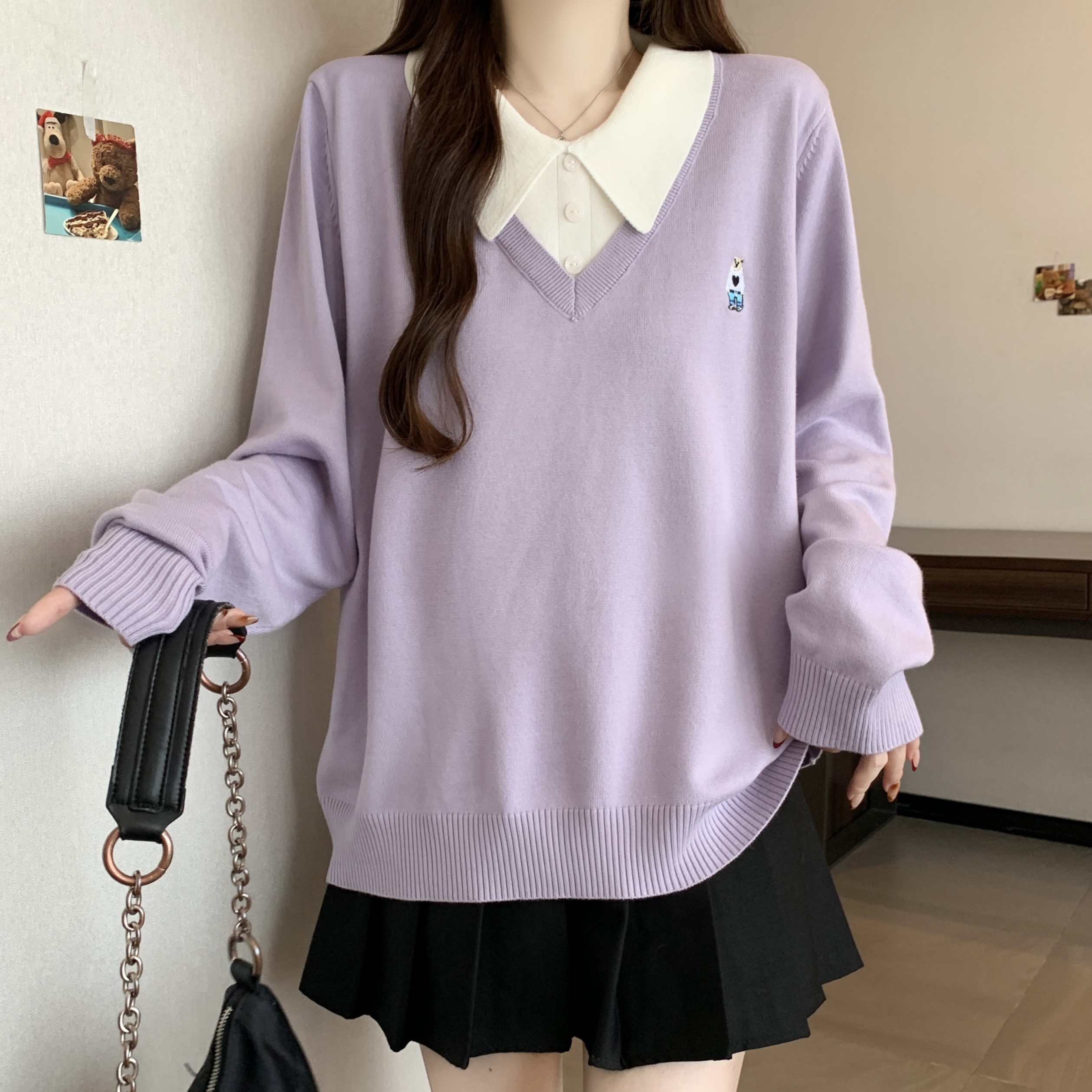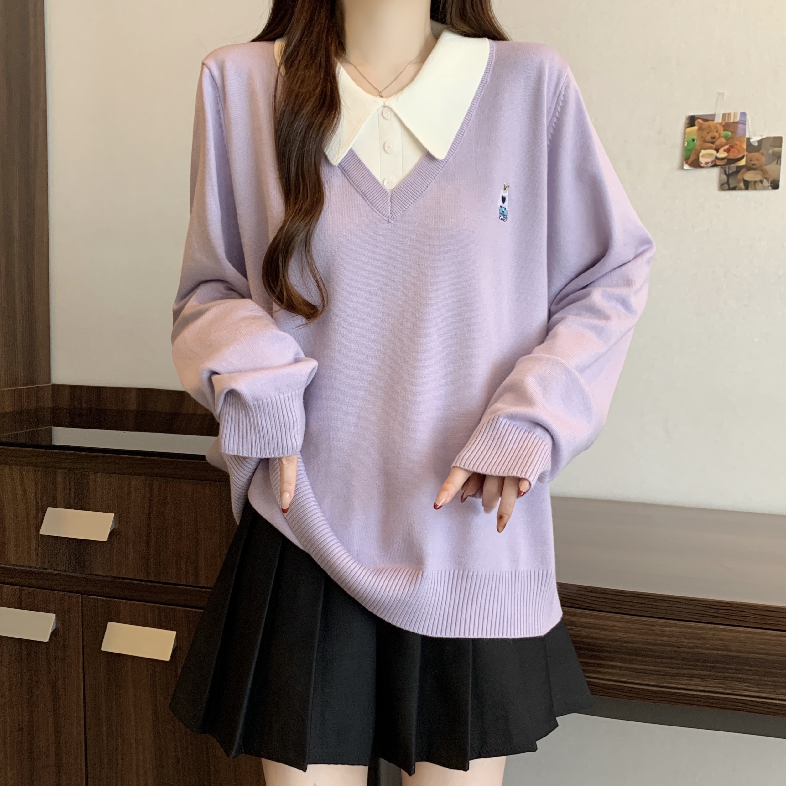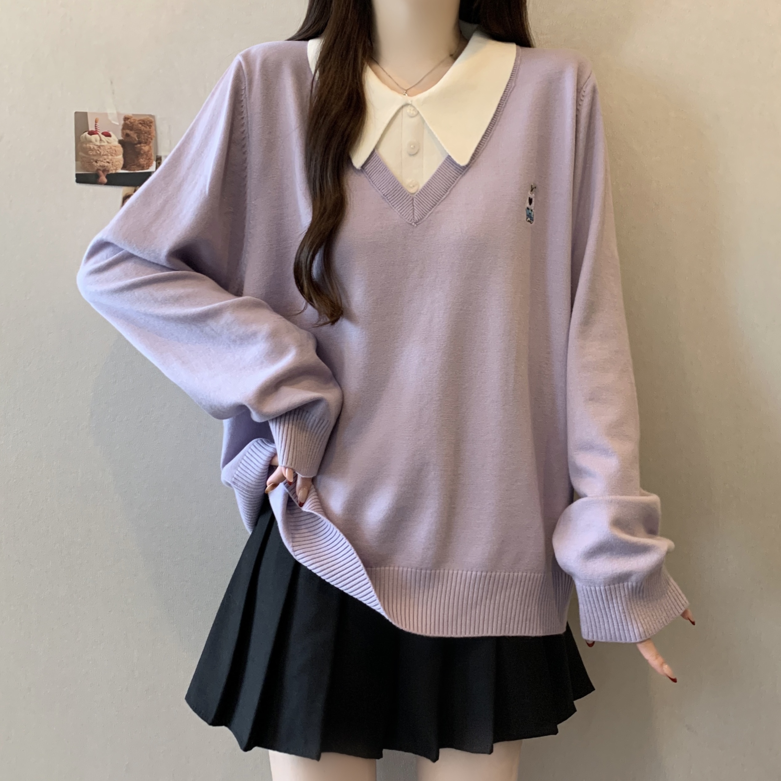 FA51210# 大码胖mm学院风polo领假两件针织衫秋冬宽松显瘦长袖上衣 服裝批發女裝批發服飾貨源