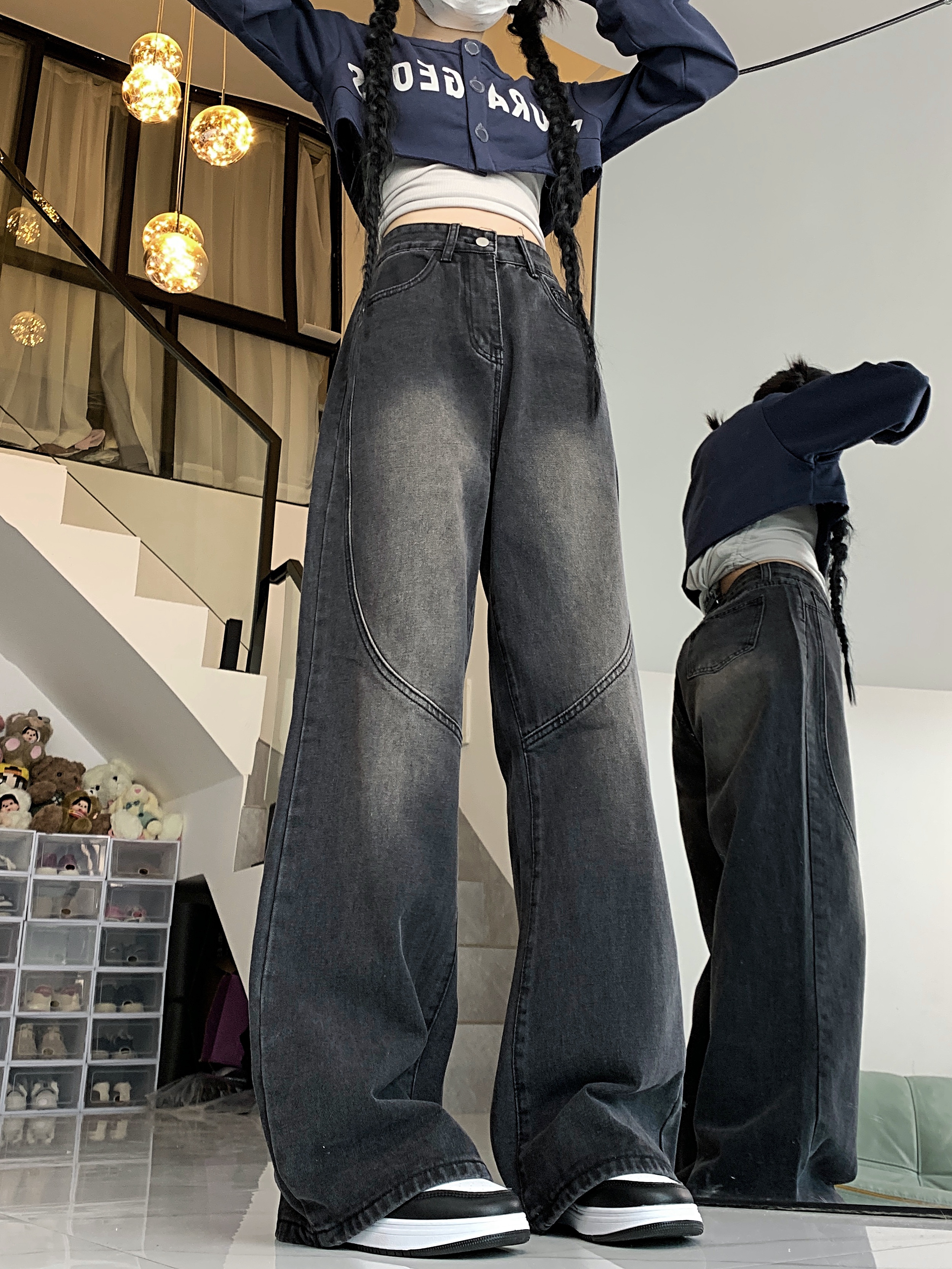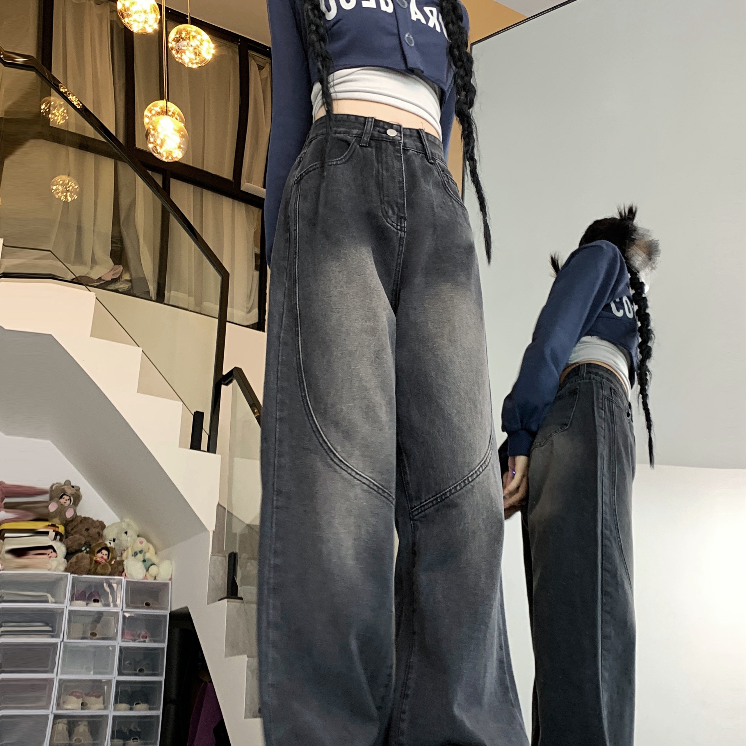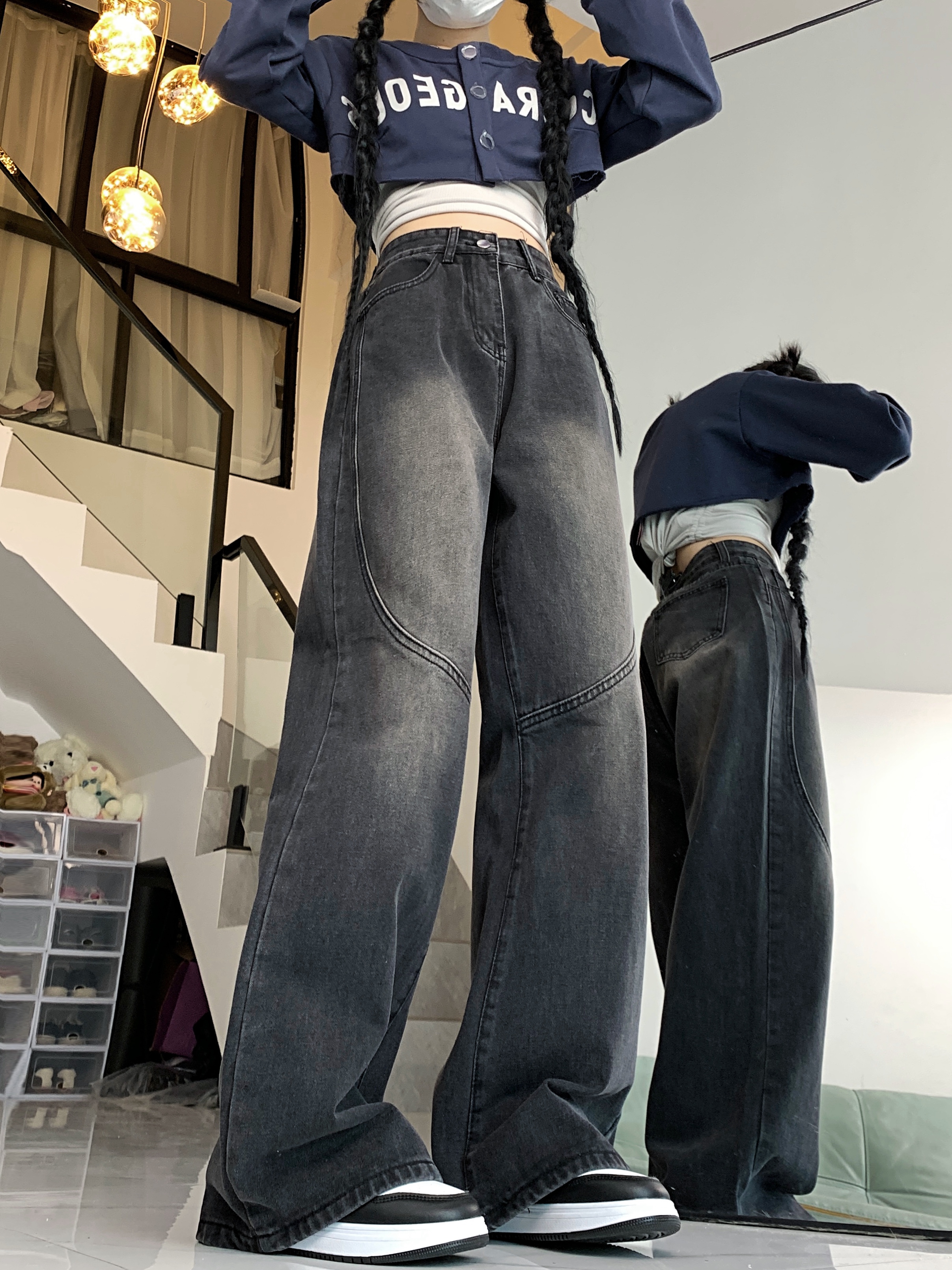 FA52983# 大码女装黑色高腰直筒牛仔裤女复古设计感显瘦宽松垂感阔腿拖地 服裝批發女裝批發服飾貨源